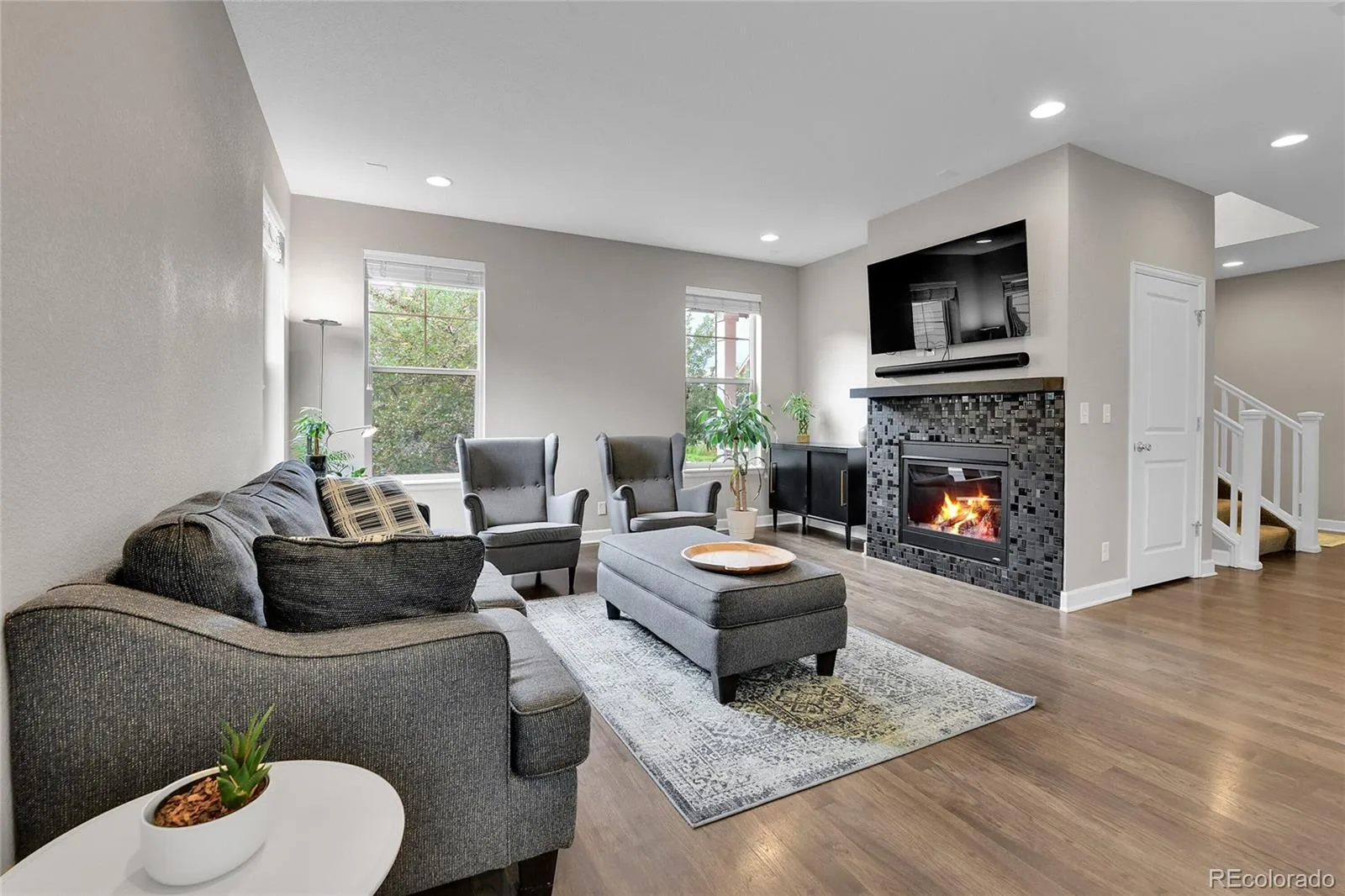 Inside, light pours through the windows, highlighting a spacious open layout and stylish upgrades. The main level moves with ease from the living room with a cozy fireplace, to a dining area made for gatherings, to a well-appointed kitchen with an island, ELFA-organized pantry, and plenty of counter space. A powder bath and direct access to the two-car garage complete with EV charger round out this floor.