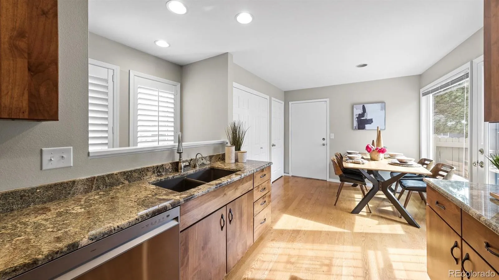 Meticulously maintained 3 bedroom/3 bath ranch style end-unit townhome that truly lives like a single-family home, with abundant natural light streaming through extra windows and skylights. Pride of ownership is evident in every detail, from the beautifully updated kitchen with rich solid wood cabinetry, granite counters, and brand-new appliances to the serene primary suite featuring a custom walk-in closet, spa-like five-piece bath and shower with multiple heads. Plantation shutters, a cozy gas fireplace, and built-in speakers in multiple rooms and on the patio add both comfort and sophistication. A new furnace and A/C were installed in 2020. Washer and dryer are brand new, too. Property is well insulated and very quiet inside.