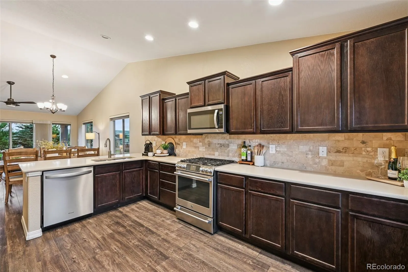 eautiful home in Forest Lakes! Open floor plan and private setting! Walk in to this gorgeous home with luxury vinyl plank flooring and vaulted ceilings in the main living areas! The family room has a stone fireplace for cozy evenings and has views of the city lights! The open floor plan allows for easy entertaining with a spacious dining room and large kitchen! The kitchen has gas stove, pantry and a view of the front range. The main level private master bed room retreat has more city views, walk in closet and five piece spa like bath with soaking tub and separate shower! Another main level bedroom with walk in closet on the main level for easy access! A huge laundry room has several shelves, included washer/dryer, wall charging vacuum and space for storage! The main level also has a three quarter bath with edgeless shower glass and quartz counter top! The basement gives you 9′ ceilings, upgraded carpet, wspace for a media area, pool table and even study space! Two more huge bedrooms and another upgraded bath with quartz counters and wood look tile! This amazing and well loved home has Hunter Douglas power blinds in the main rooms, ADT security system with 2 HD cameras and direct connect internet to 6 rooms! The park like back yard has a covered patio with included fire pit and more city views! You are going to love living here! Pool table and accessories included! Easy care driveway gets plenty of winter sun! Enjoy the Forest Lakes lifestyle with walking trails, park, private lake with paddle boarding, kayaking and catch and release fishing!B