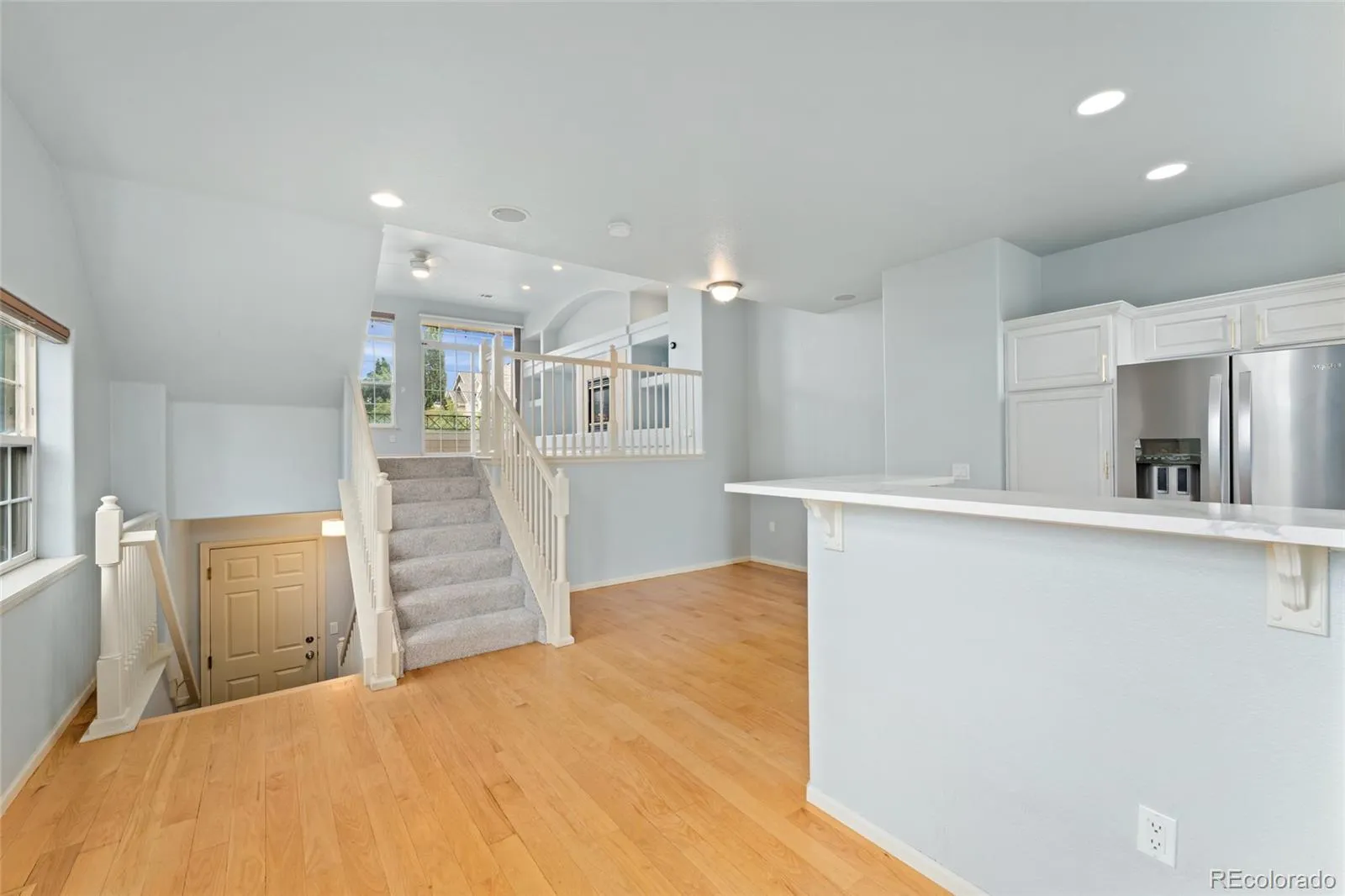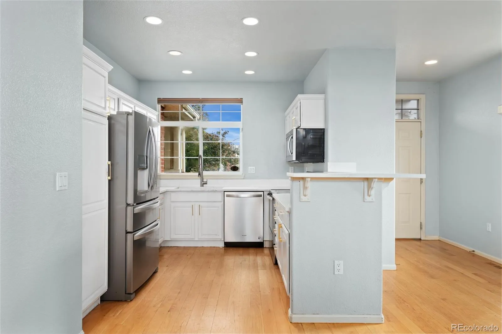 Welcome to this stunning corner townhome in Aurora’s sought-after Kensington neighborhood, where style, comfort, and convenience come together. Perfectly positioned as an end unit, this home enjoys added privacy and an abundance of natural light. Inside, you’re welcomed into an open kitchen and dining area featuring updated finishes, including stainless steel appliances, sleek quartz countertops, and ample cabinet space. The dining area flows into the bright living room, where a cozy gas fireplace invites you to unwind. Step out onto the private balcony, a spacious retreat with plenty of room for outdoor furniture and entertaining.