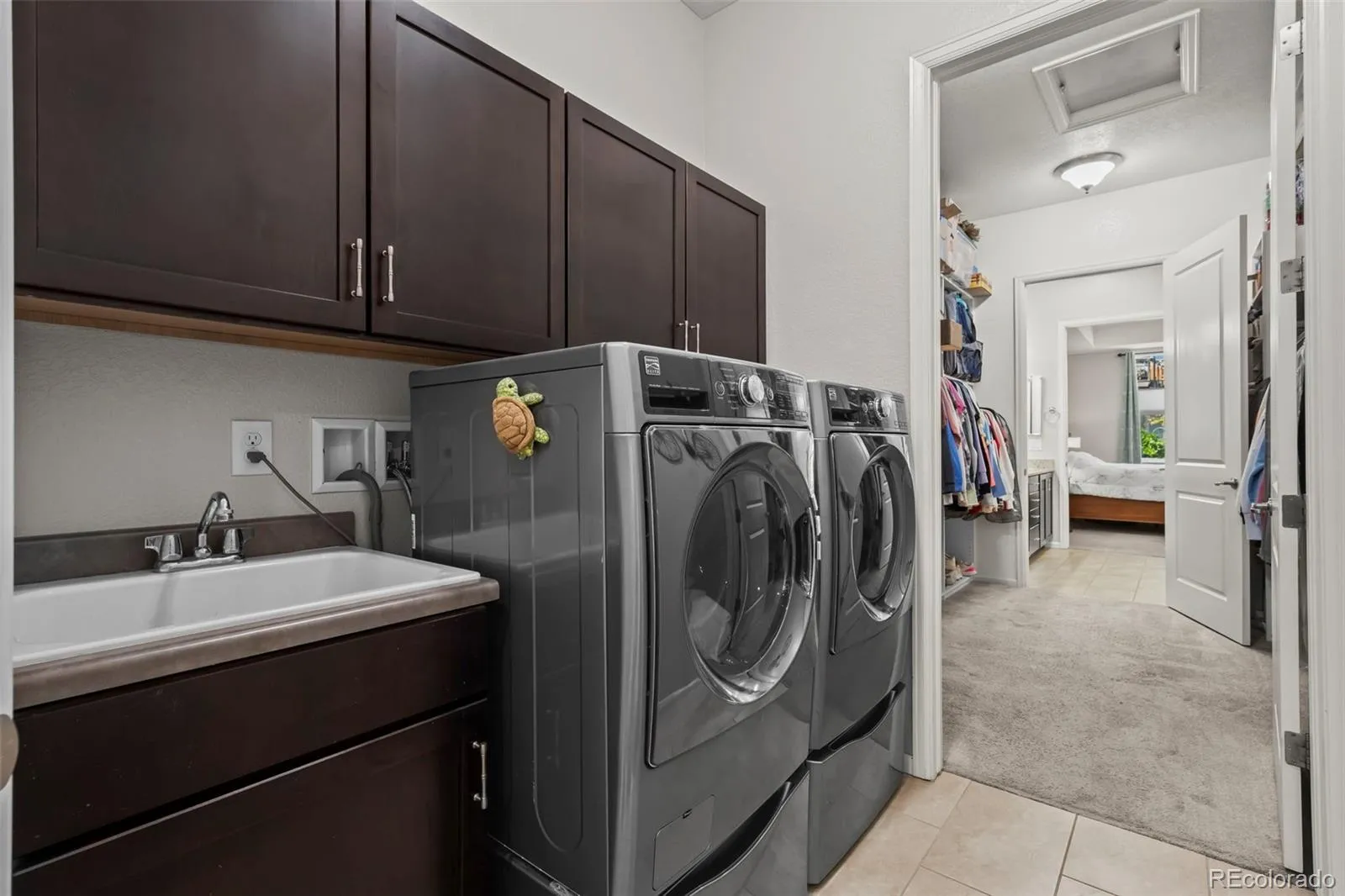 The primary suite showcases tray ceilings and an en suite bath with granite counters, dual sinks, walk-in shower, and direct access to the laundry room through the walk-through closet.