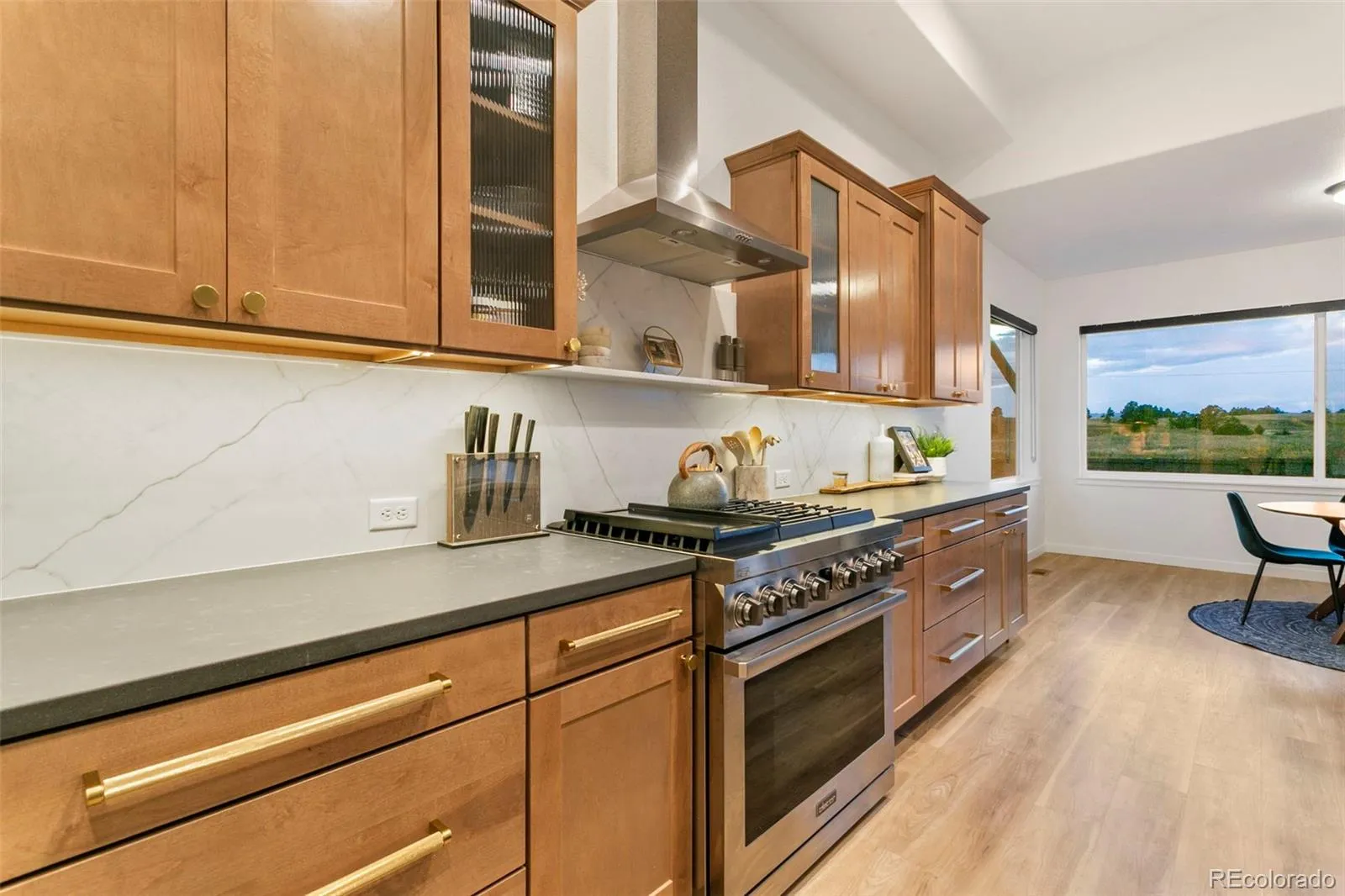Absolutely stunning and like-new, this 4-bedroom, 3-bathroom, 4-car garage home is now available in North Colorado Springs. From the moment you arrive, you’ll be captivated by its incredible curb appeal, featuring a fully landscaped, level lot and a striking black and white stucco exterior. A spacious front courtyard leads to a sleek, modern front door, setting the tone for the stylish interior that awaits. Inside, you’re welcomed by an expansive open floor plan with LVP flooring throughout. The living room features a floor-to-ceiling stone fireplace, creating a dramatic and eye-catching focal point. From there, the space flows seamlessly into the gourmet kitchen, complete with beautiful matching marble countertops and backsplash, stainless steel appliances—including double ovens and an industrial-style vent hood—and an oversized island with seating for six. Modern brown cabinetry paired with elegant custom gold hardware adds the perfect finishing touch. A spacious dining area sits just off the kitchen, ideal for daily meals or entertaining. Natural light pours into the main level through oversized windows and large double sliding glass doors, leading to a covered patio and a beautifully maintained, fully fenced backyard. Also on the main level is a stylish office with custom wainscoting. As well as a secondary bedroom and full bathroom, and a luxurious primary suite. The primary retreat features a spa-like 5-piece en suite bathroom with unique modern tile, bold black fixtures, a standalone shower, a stunning soaking tub, and a large walk-in closet. The finished basement expands your living space with two additional bedrooms, a full bathroom, and a massive entertainment area offering endless possibilities—from a media room to a home gym or game room. Built in 2025 with numerous upgrades and refined modern finishes, this home offers warmth, style, and functionality at every turn. It’s move-in ready and sure to impress—schedule your showing today before it’s gone!