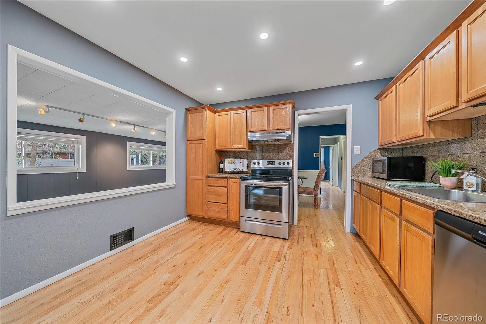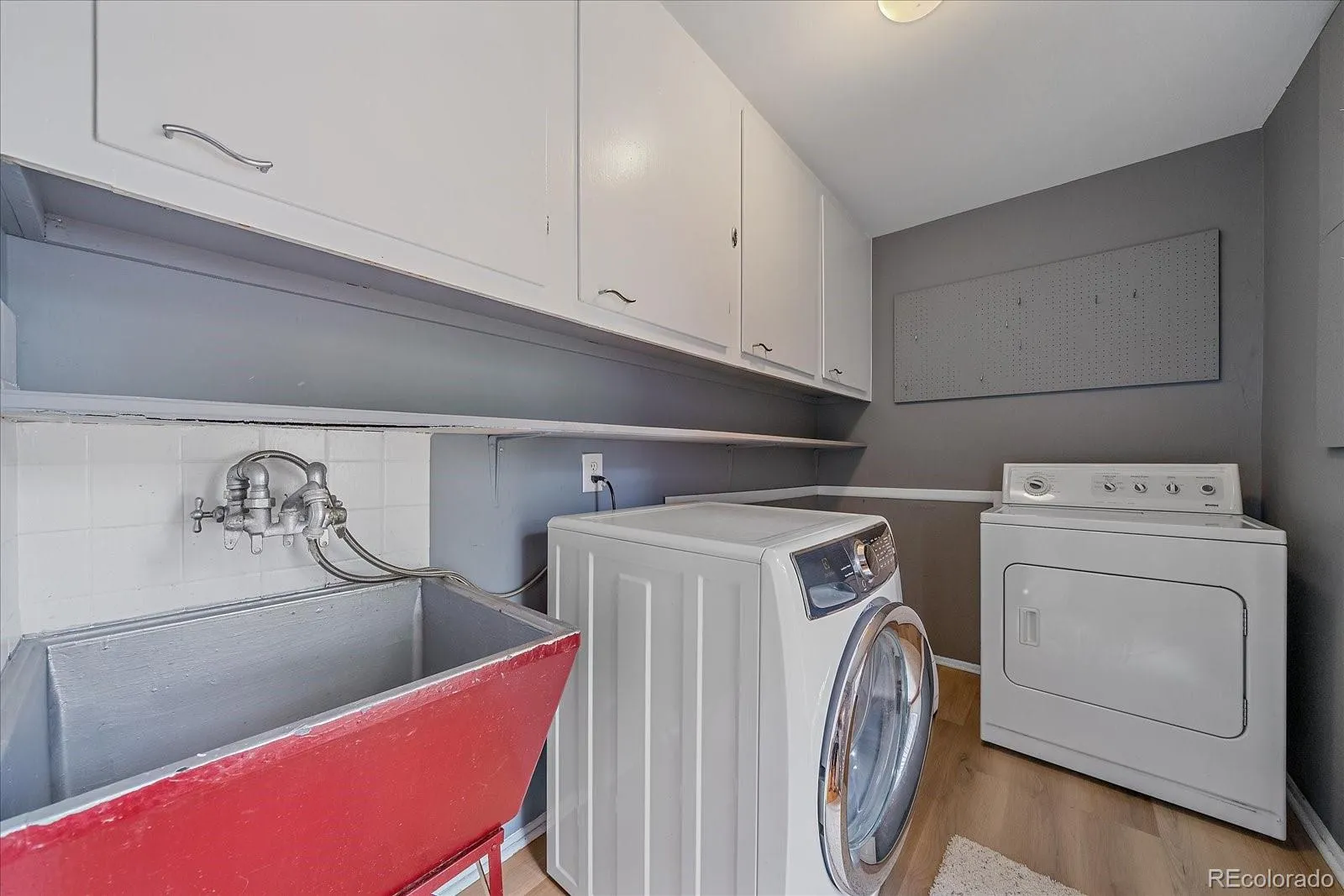 Welcome to a delightful home with a blend of comfort and contemporary updates. This 3-bedroom home is perfectly nestled on a generous lot. Step inside to find inviting hardwood and carpet floors throughout, complemented by thoughtful updates that brighten every corner. The kitchen is a culinary enthusiast’s dream with a pass-through to the family room for all your entertaining this season. Conveniently, the kitchen features a suite of updated appliances, including a dishwasher, refrigerator, oven, range hood, and microwave for effortless living. Off the kitchen, a bright laundry room is a standout feature, equipped with a utility sink, washer, dryer, cupboard storage, and shelving, offering both functionality and convenience. The home boasts three well-appointed bedrooms, each adorned with a ceiling fan and newer carpet, offering a cozy and refreshing haven. Outside, a beautifully maintained lawn with a convenient sprinkler system and storage shed for all your yard tools, enhances the home’s curb appeal, while the private outdoor space offers a serene retreat. Relax on the covered patio, complete with a workbench ideal for entertaining or gardening. An attached garage provides additional accessibility, while the forced air system and central air ensure year-round comfort. This home truly embodies smart living with a casual elegance, offering a perfect sanctuary in a vibrant Denver neighborhood. Don’t miss the opportunity to make this house your new home!