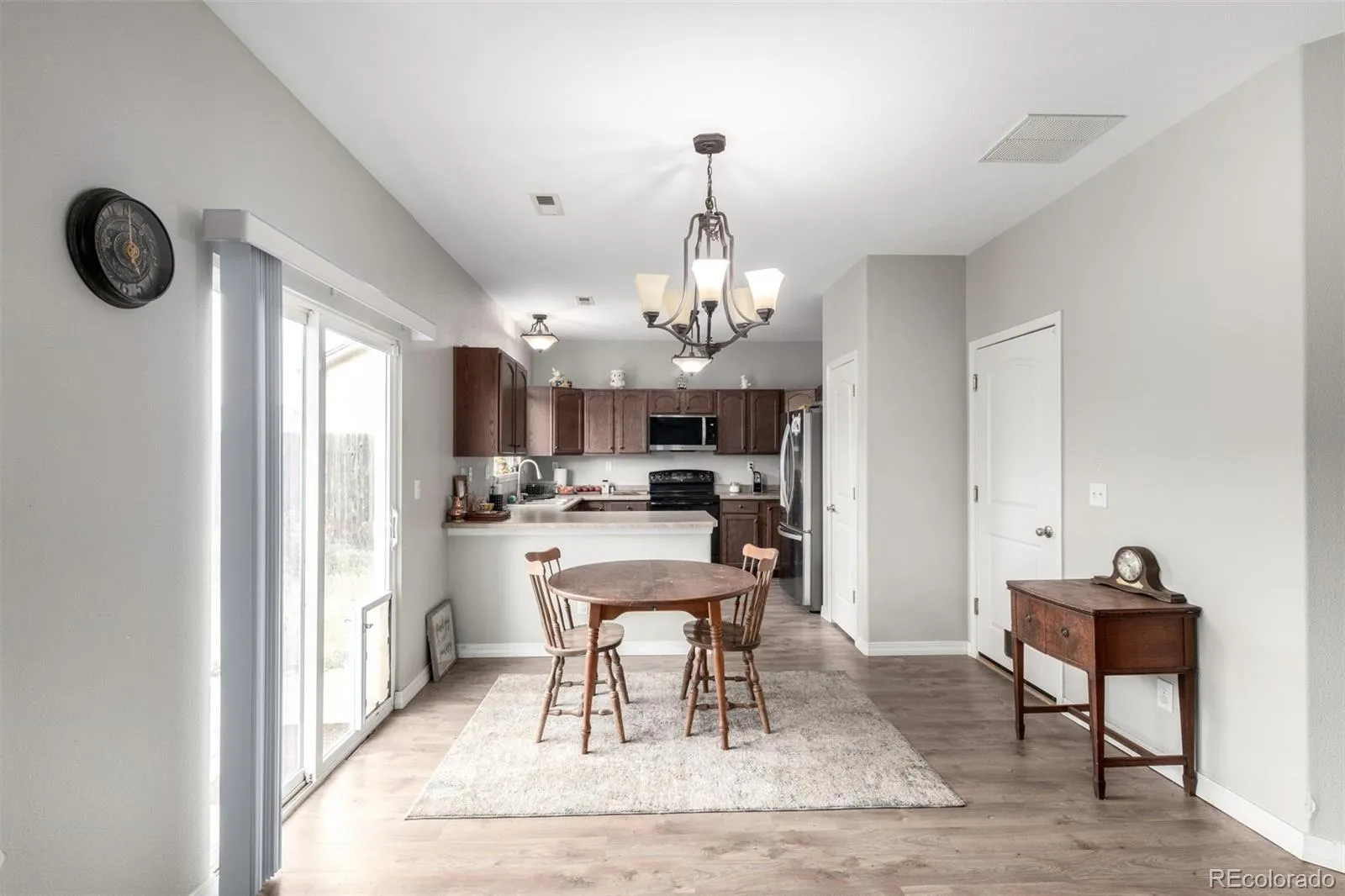 Welcome to this inviting 3-bedroom, 3-bath home in Colorado Springs! From the moment you arrive, the charming exterior with fresh paint and a covered front entryway sets the stage for comfortable living. Step inside to discover a bright, open-concept layout with neutral tones and beautiful vinyl flooring on the main level. The spacious living room offers plenty of natural light and flows seamlessly into the dining area and kitchen, creating an ideal space for both everyday living and entertaining. The kitchen features rich cabinetry, ample counter space, all appliances are included, and a breakfast bar for casual meals. Sliding glass doors open to the backyard, perfect for extending your living space outdoors. Upstairs, the generously sized primary suite is a true retreat with dual closets and a private en suite featuring double sinks, a soaking tub, and a separate shower. Two additional bedrooms and a full bath provide versatility for guests, office, or hobbies. The dedicated laundry area adds extra convenience on the same floor as the bedrooms. Additional highlights include an attached 2-car garage, and a fenced backyard with room for gardening, pets, or outdoor gatherings. Located near parks, schools, shopping, dining, and easy access to Peterson and Schriever Space Force Bases, this home combines comfort and convenience.