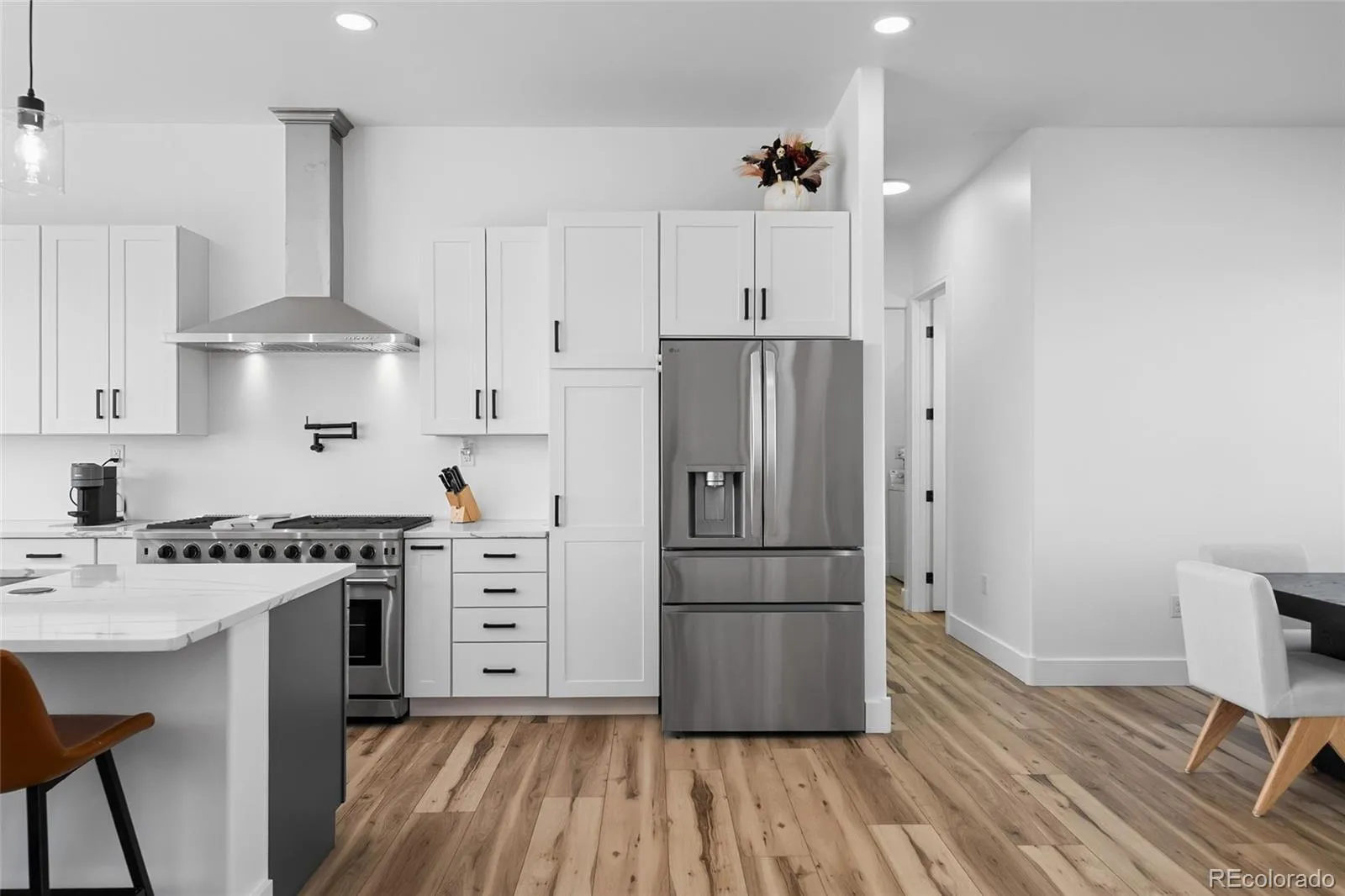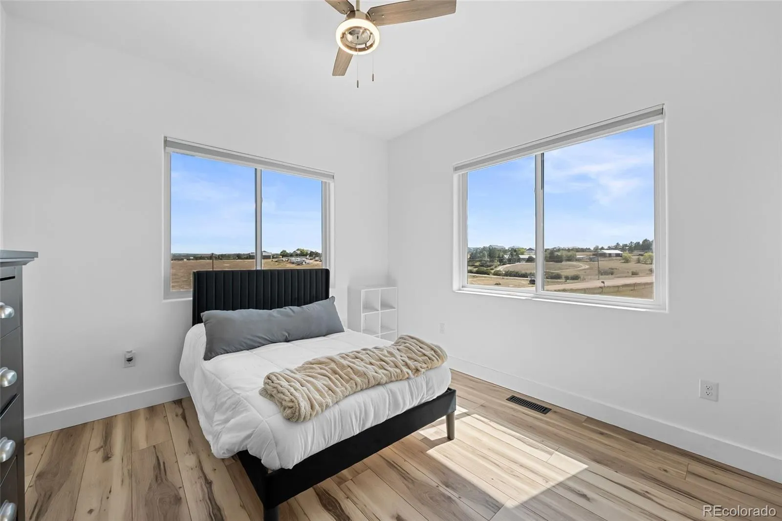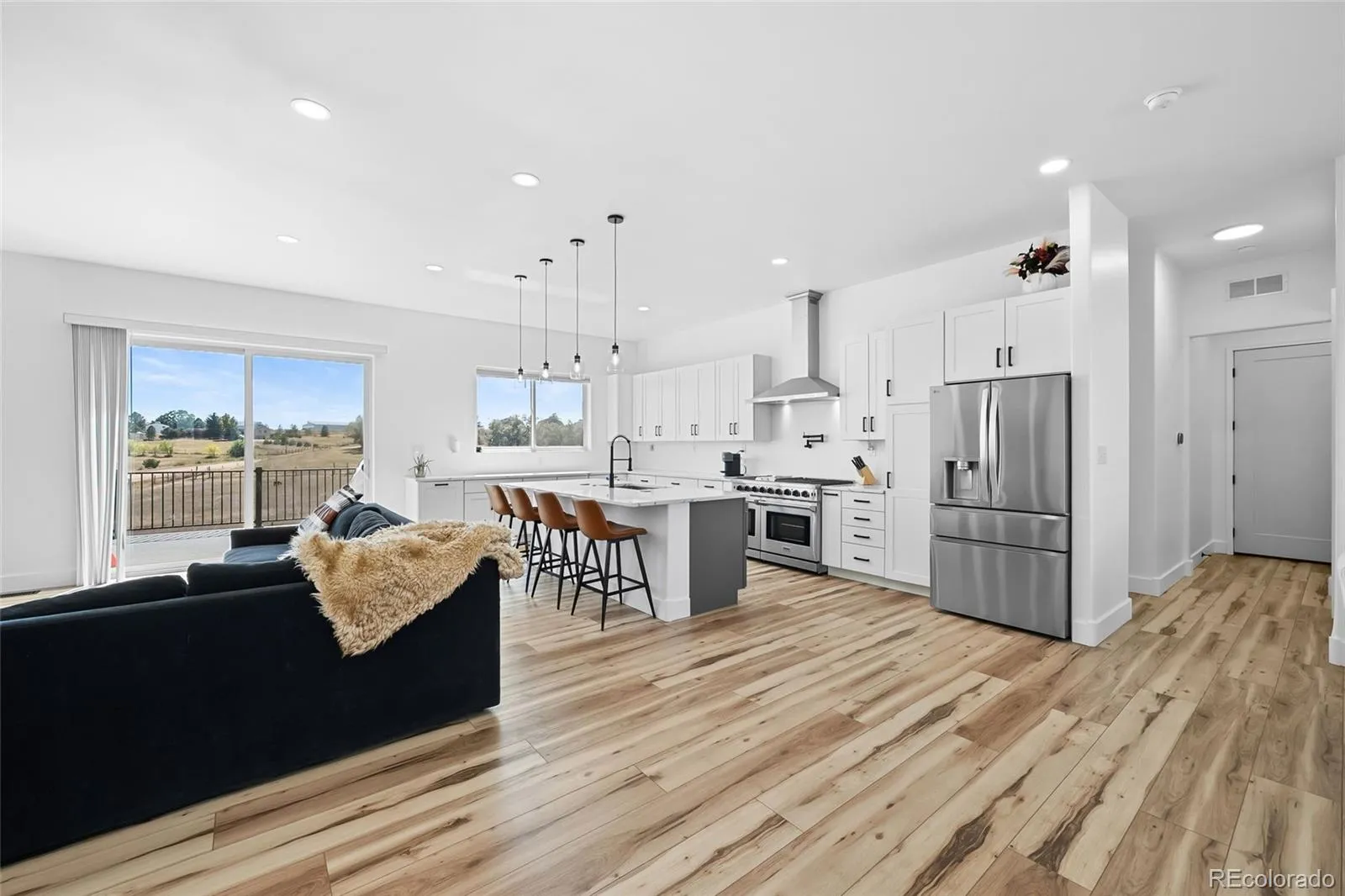 Location, Location, Location. This home checks all the boxes for country living in the city. Just minutes to the Denver Tech Center and Parker main street shopping perched on top of the hill with over six and a half acres on a corner lot. This is the newest home built in the subdivision with construction completed in 2023. The ranch style home has synthetic stucco exterior, front and back covered porches and a fortress steel framed deck with composite decking providing for low maintenance exterior. The five car extended garage features 12 foot ceilings and 10 foot doors with low profile garage door openers for additional ceiling clearance and is fully drywalled including LED lights drain system in floors. Inside you will find an open floor plan including updated and well designed light fixtures, beautiful smart core vinyl flooring, Thor stainless steel double oven and cook top along with LG refrigerator . Other upgrades include custom cabinet package. Quartz counter tops tastefully done back splash with stainless hood and pasta pot filler. The five piece bath looks like a show home with duel shower heads and deep soaking tub and decorative tile. The home has a tankless water heater central air and wired with cat 6 throughout. The walk out basement has rough in plumbing, eleven and a half foot ceilings a gun safe/wine cellar room with a separate entrance into the garage. The home is wired with 400 amps to the property divided into two 200 amp services perfect for adding an out building or another garage. Low HOA and car friendly neighborhood make this perfect for the car enthusiast in your home . Zoned for horses and other livestock with trails through out the community. This one will not last long. Its a true one of a kind. Set your showing today.