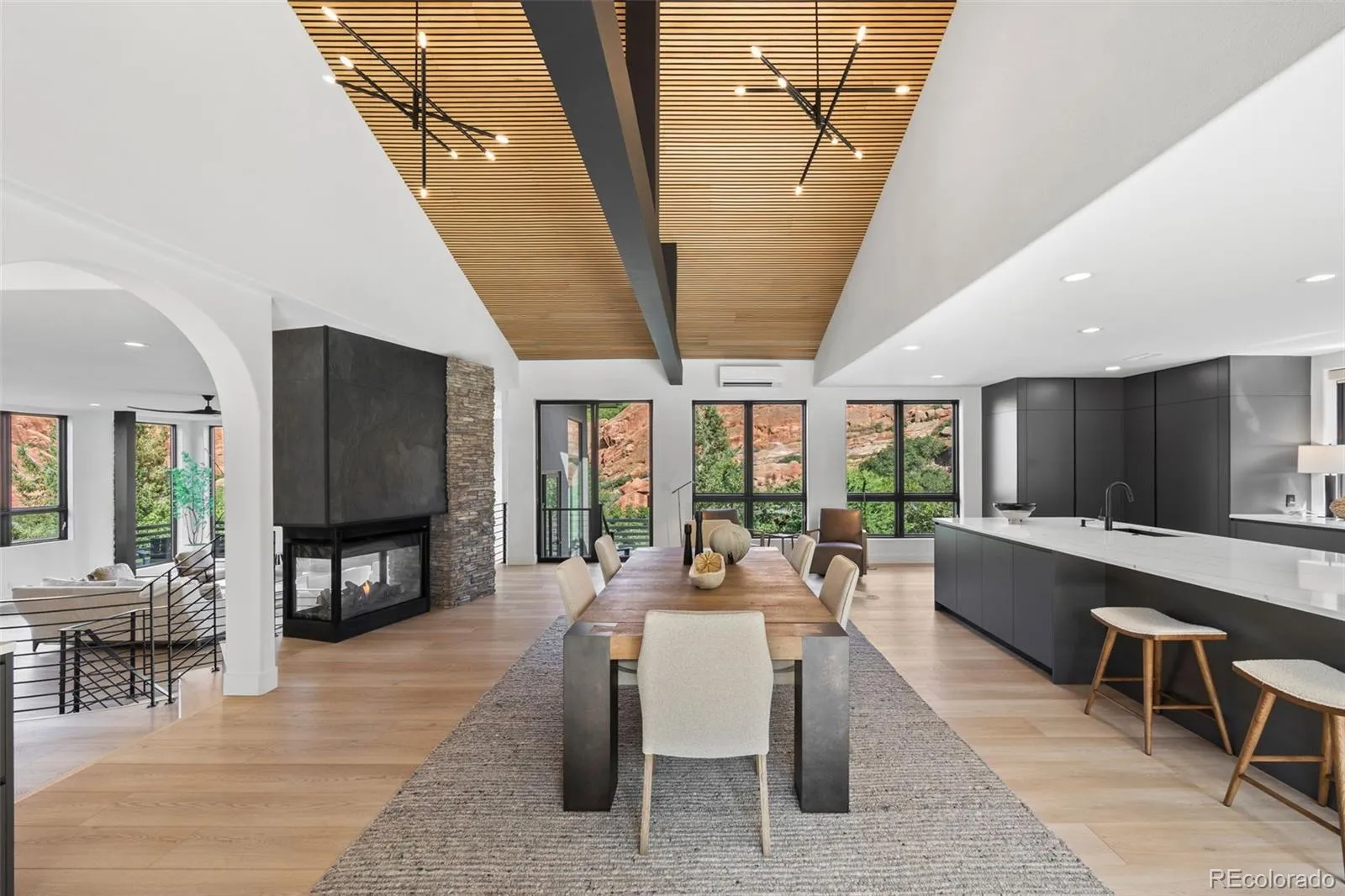 Every detail is custom, every space designed with intention. The gourmet kitchen showcases a 14-foot island, induction cooking with hidden ceiling vent, integrated appliances, pot filler, full-height pantry walls with pull-outs, and a beverage center with wine storage and built-in espresso. Vaulted ceilings and a dramatic four-sided fireplace define the dining and great room, creating a showstopping centerpiece for everyday living and unforgettable entertaining.