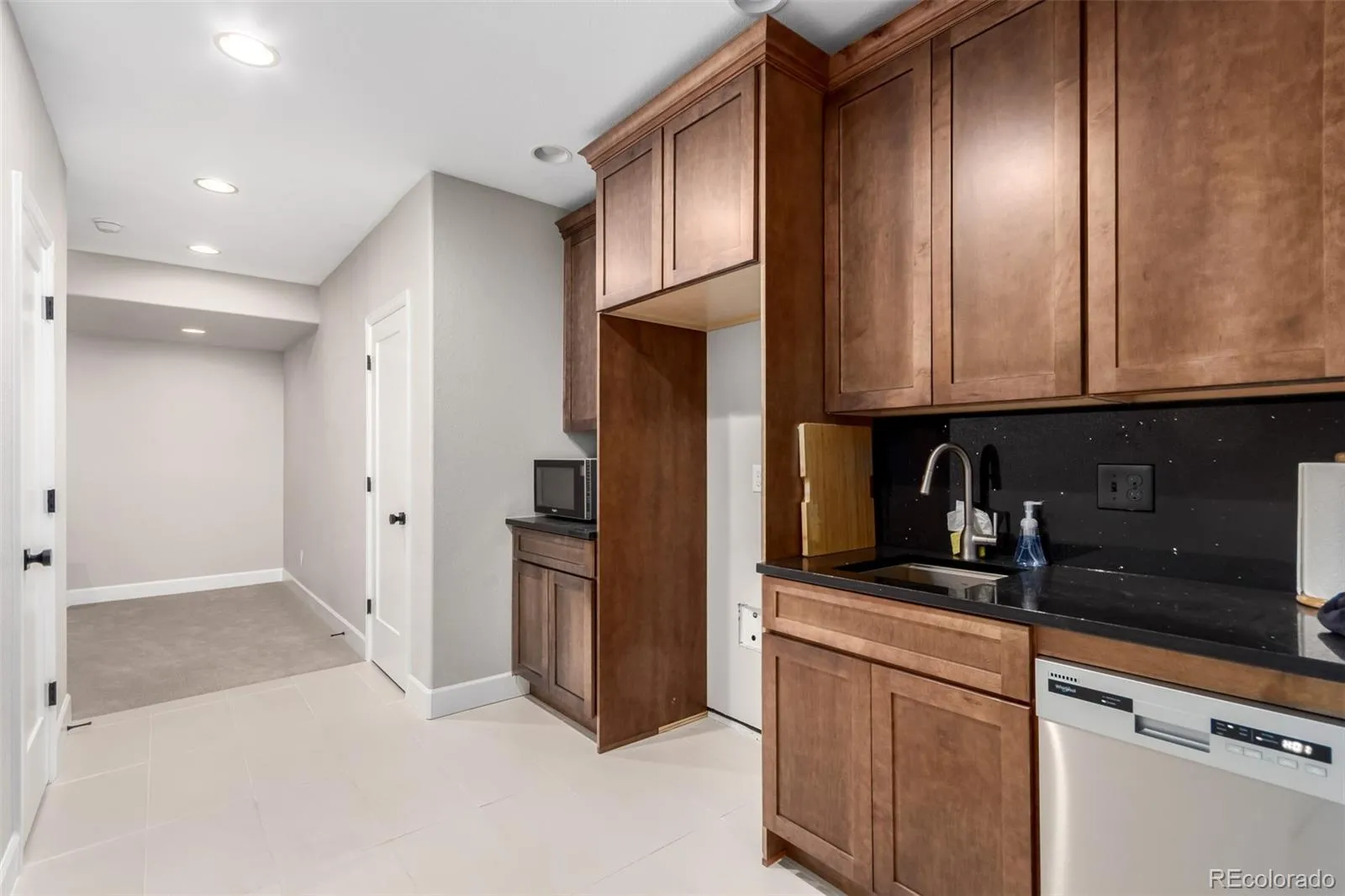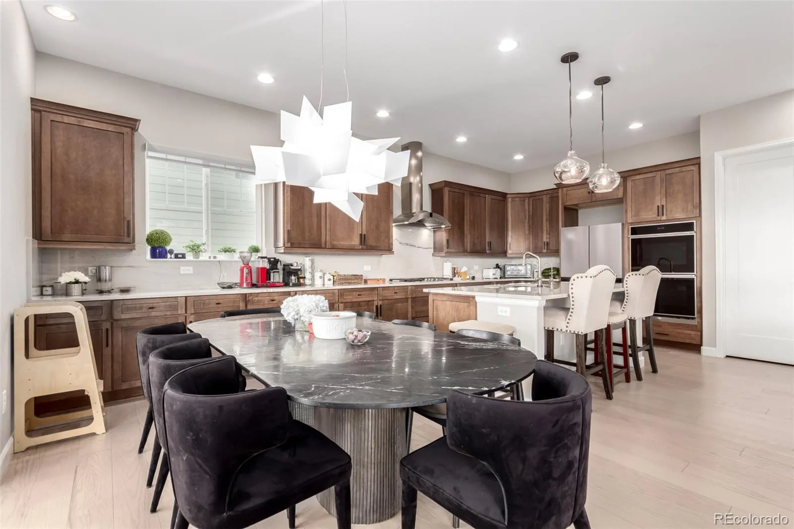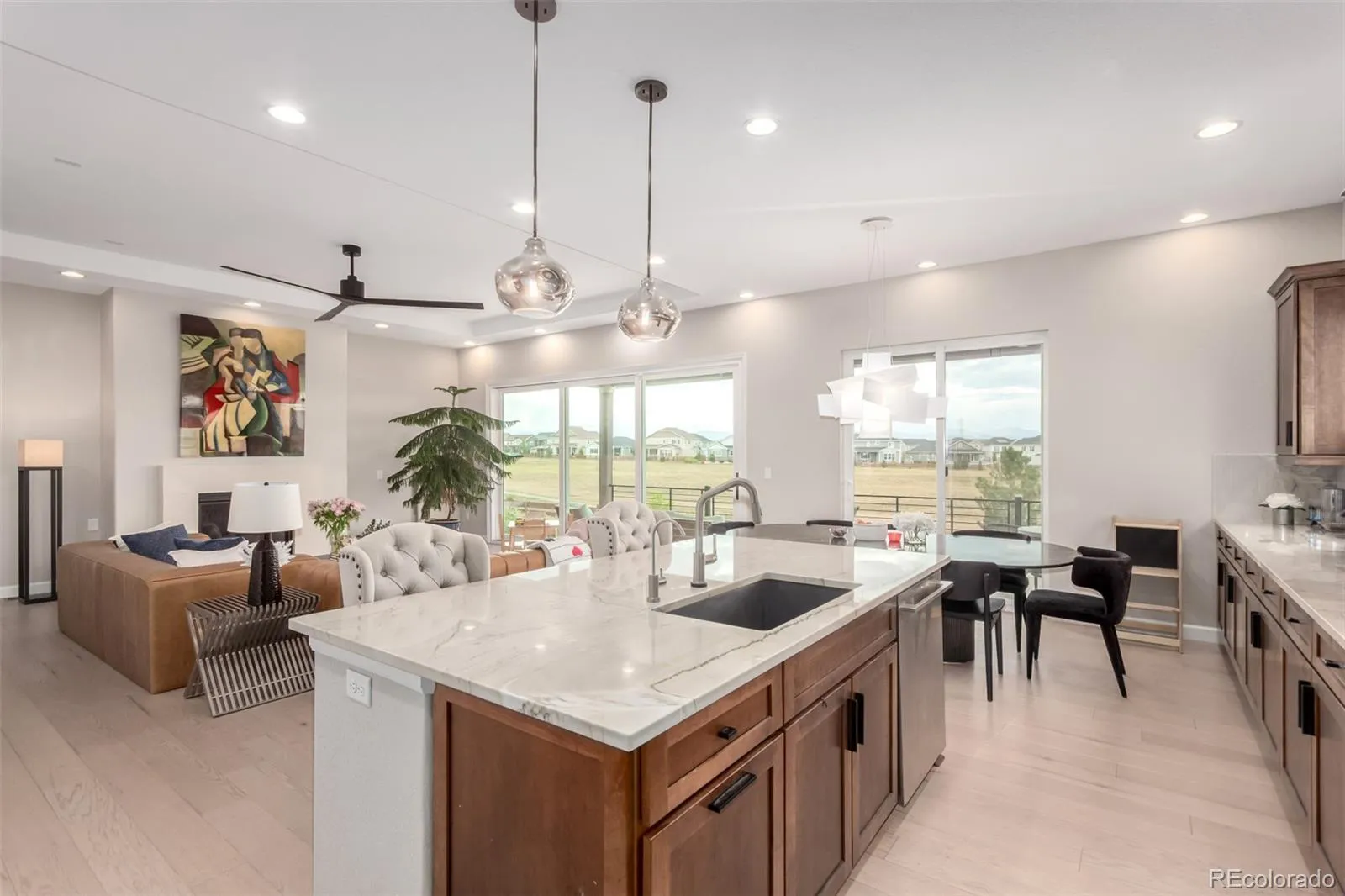 This impressively upgraded six bed five bathroom ranch style home backs to open space and has beautiful mountain views. Whether you’re looking for multi generational living or a single family home, this checks all the boxes. The main floor kitchen features a gas stove, dual ovens, quartzite counters and backsplash, and a quartz scratch proof sink. In the large pantry, you will find an added wine refrigerator, microwave, and cabinetry. The main floor primary suite has a gorgeous mountain view and five piece bathroom with large walk-in closet. Three well lit secondary bedrooms and a laundry room round out the main floor. Follow the upgraded lighting on the stairs to the basement and find two additional bedrooms (one en-suite), a large family room, office area, and second laundry room and kitchenette plus ample storage. The two car garage is well equipped with a 50 amp plug ready for an electric car, and an additional single stall garage is perfect for storage or a third car. Head out back to an expansive patio that spans the length of the home, or go for a walk through the back gate into the open space. The original owners have made other impressive upgrades in the last two years, including: hardwired surround sound in the living room, sink in the main floor laundry room, upgraded water heater system, whole house humidifier, converted powder bathroom from a closet, and owned solar panel system. Security upgrades include hard wired security system and hardwired camera system. Come see this better than new build home and make it yours!