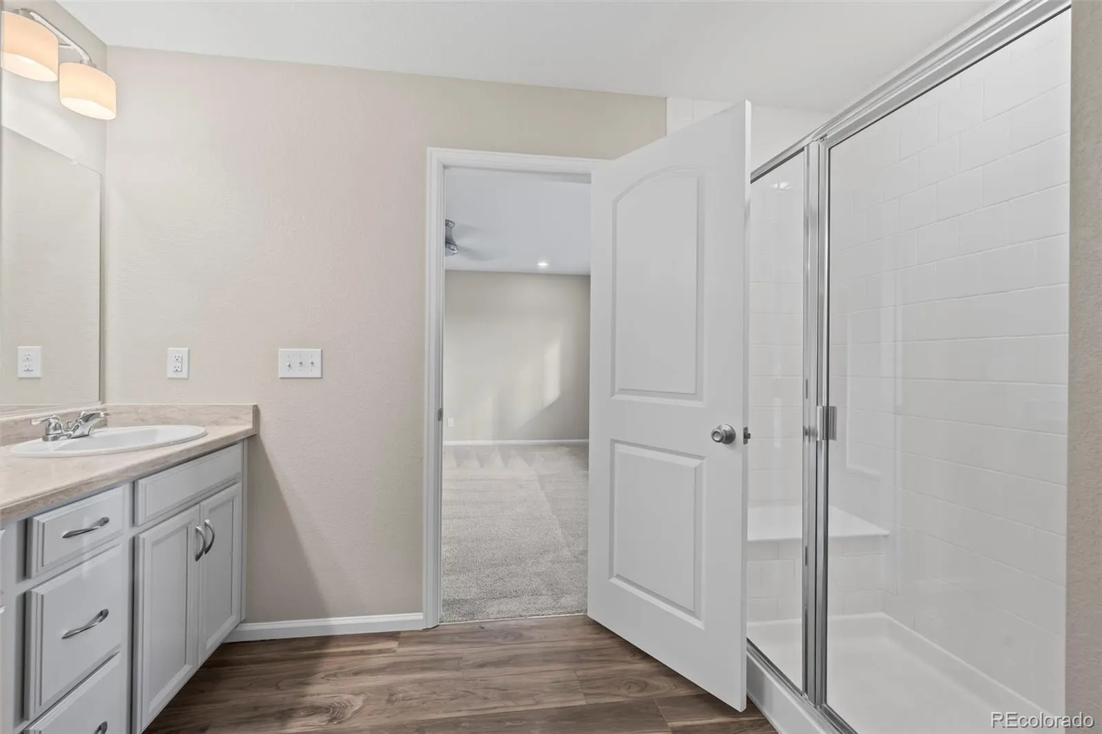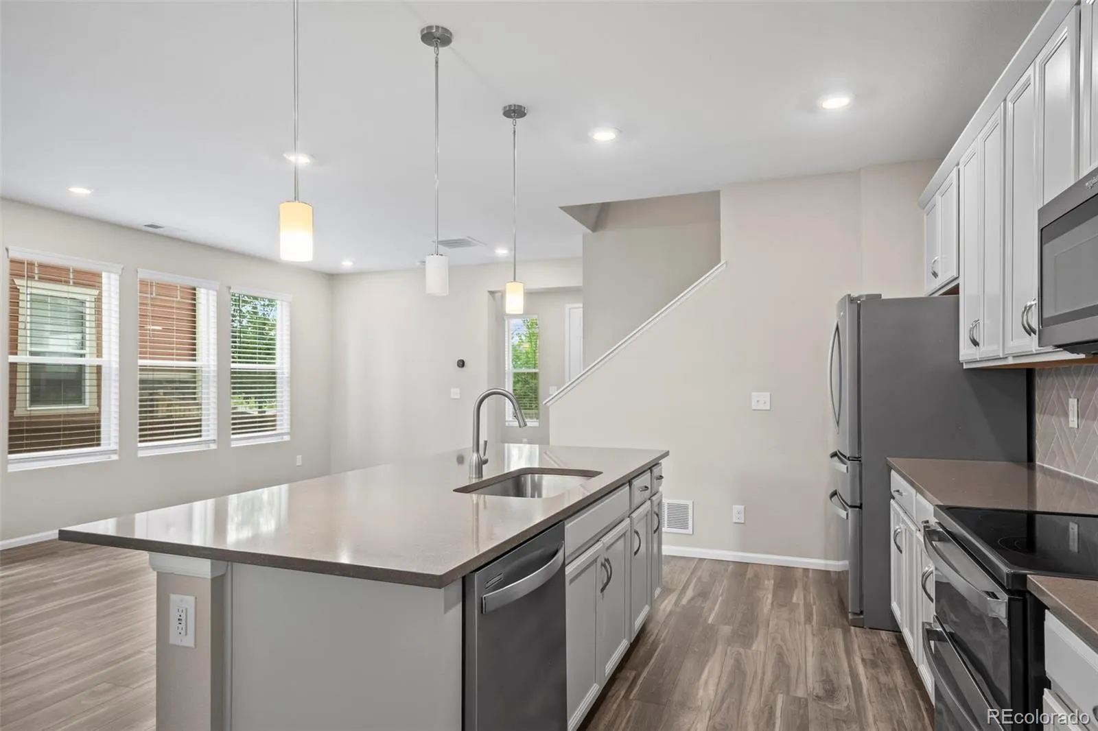 Beautiful paired home with an attached garage situated on the park area of the community! Near shopping, dining, trails, and open space – entertainment is always nearby. This home provides a functional layout featuring durable LVP flooring throughout the main level offering an office, spacious great room, and an eat-in kitchen equipped with a large center island, quartz counters, stylish backsplash, pendant lighting, pantry, and stainless-steel appliances. Upstairs, enjoy a versatile carpeted loft space, and three bedrooms including a primary suite with walk-in closet and a 3/4 bath featuring dual sinks and a walk-in shower. Additional full bathroom with tub/shower combo and convenient upper-level laundry complete the upper level. Outside enjoy the zero maintenance side yard with deck and astroturf. Near E-470 and I-25 make commuting to DIA and Denver easy. Don’t miss the amazing opportunity to own this paired home!
