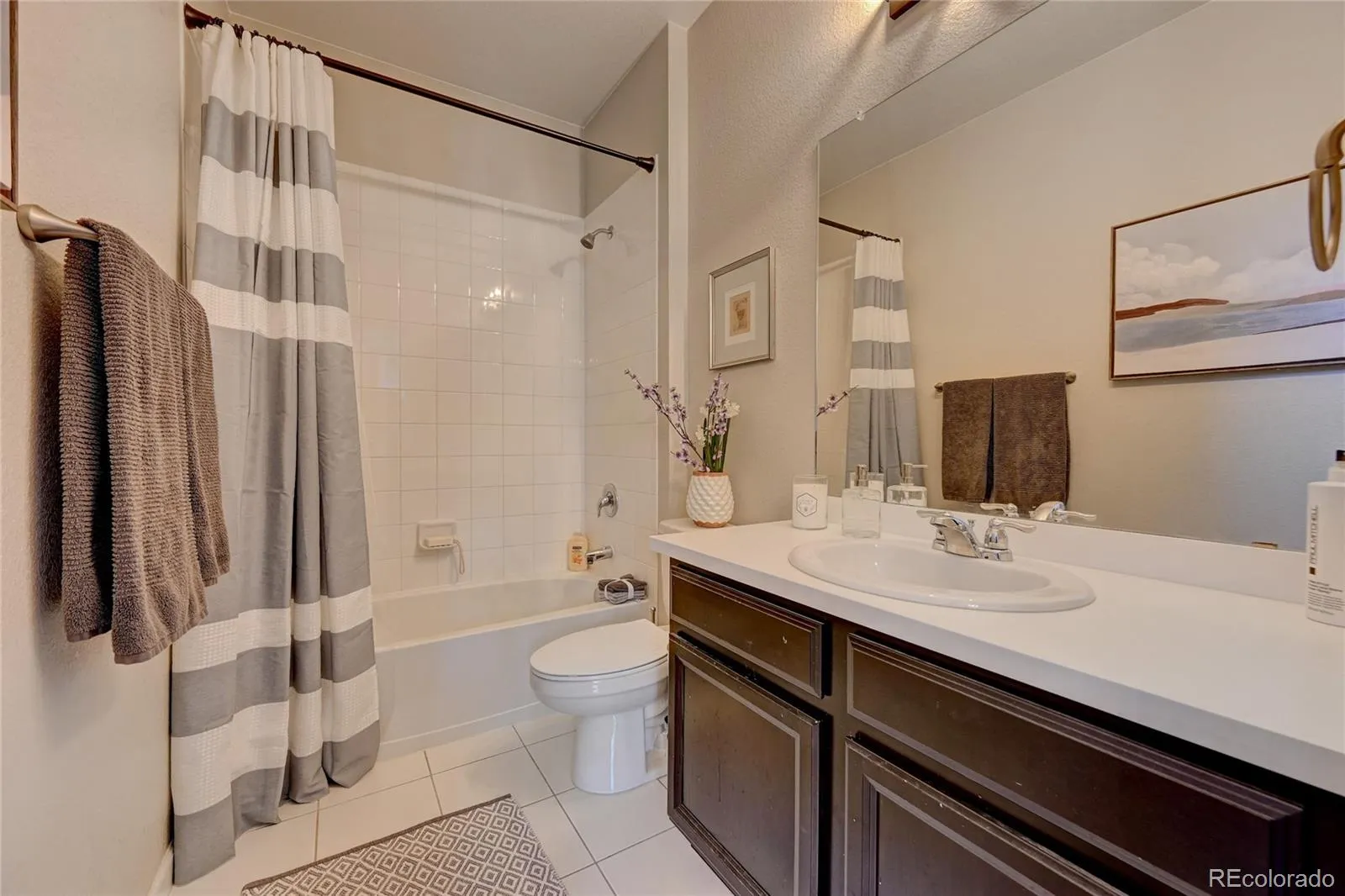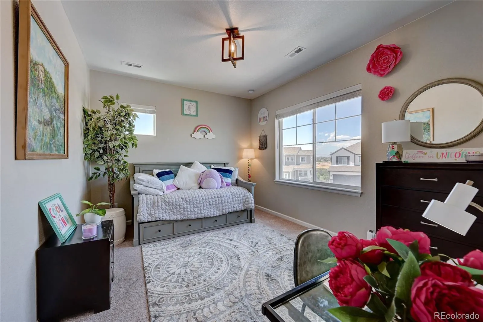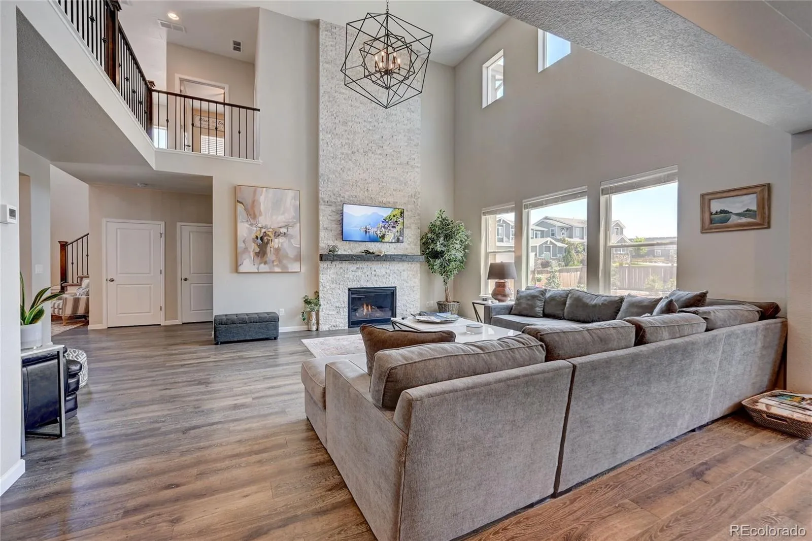 This elegant two story home built in 2019 by Taylor Morrison, featuring a grand two-story foyer with stunning open staircase, formal dining room and main floor guest bedroom with private en-suite bath. The spacious gathering room with two-story vaulted ceiling and cozy gas fire-place opens to a gourmet kitchen with espresso cabinets, granite countertops, stainless steel appliances including a gas cooktop, stainless hood and double ovens, massive walk in pantry and huge center island, and butlers pantry. The second story features open wrought iron railing, a loft, two secondary bedrooms with separate bathrooms, large laundry room, and a lovely master bedroom with 5 piece bathroom and walk in closet. Additional highlights include stone fireplace surround to the ceiling, extensive laminate wood flooring on the main level, 2-tone interior paint, partial basement with 9ft foundation walls, rollout shelves and trash bin in the kitchen, ceiling fans, central air conditioning. Additional interior features include a Custom reclaimed Wood mantle and designer lighting throughout the home, kitchen cabinet hardware, a utility sink in the laundry room and a cabinet in the art niche by main office/guest bedroom. One of the largest Lots in the community, Almost a quarter Acre of Beautiful backyard oasis with 15 trees and lots of plants. Extended Patio built sturdy with caissons and rebar to hold a hot tub and an option to add a covered patio. Driveway was extended for easy access to the third car garage and walk way from driveway to the backyard. 2 different Pools to choose from, Family pool area is less than a 2 min walk away, also in community is the adult lap pool, parks, trails and lots of Mountain and Hill views in this Beautiful Castle Oaks Estates of the Terrain Community. Situated in the Indigenous and rocky area of Castle Rock. Lots of shopping, including an outlet mall, and lots of great Restaurants.