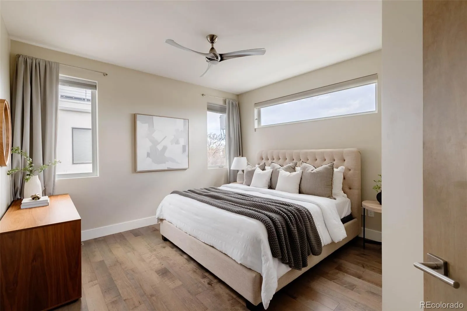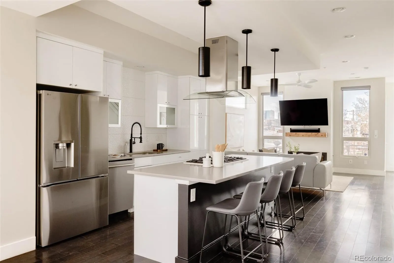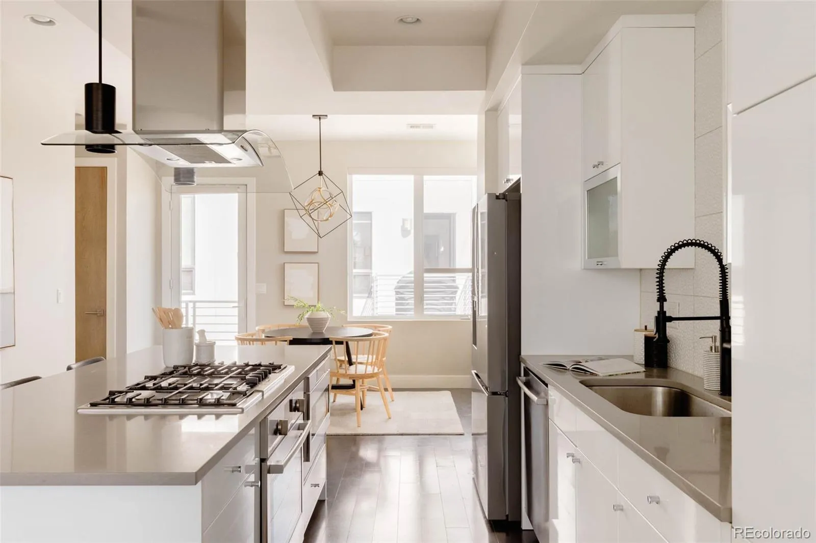 Rare end unit with incredible views. Introducing a one-of-a-kind townhome in the heart of LoHi, where the best of Denver’s vibrant urban lifestyle meets luxurious, modern design. Located within walking distance of some of LoHi’s top restaurants, bars, and coffee shops, this home not only offers convenience but also delivers breathtaking, panoramic views of downtown Denver and the Rocky Mountains from its private rooftop terrace. Upon entry, you’re welcomed into a spacious, open-concept main floor that seamlessly blends living, dining, and kitchen spaces. The living room, centered around a sleek gas fireplace and enhanced with custom automatic shades, flows effortlessly into the gourmet kitchen. The gourmet kitchen features high-end finishes, including a Bosch oven and cooktop. This level also includes a powder room and a private patio for easy outdoor access. Upstairs, the primary suite provides a peaceful retreat with automatic shades and a generously sized walk-in closet featuring custom organization, alongside a luxurious en-suite bath with dual sinks and a glass encased shower. An additional en-suite bedroom on this floor offers the same level of comfort and sophistication. The finished basement extends your living space with a third en-suite bedroom, perfect for visitors or an additional living area, and includes direct access to the oversized, heated 2-car garage with epoxied floors and an exit to the alley equipped with a hose spigot. Ascend to the fourth level to discover the crown jewel: an expansive rooftop patio, complete with a gas line for grilling and stabilized for a hot tub. Whether hosting friends or enjoying a quiet evening, this space offers unparalleled city and mountain views. Experience unparalleled luxury living in LoHi, where every detail has been carefully curated for both style and function.