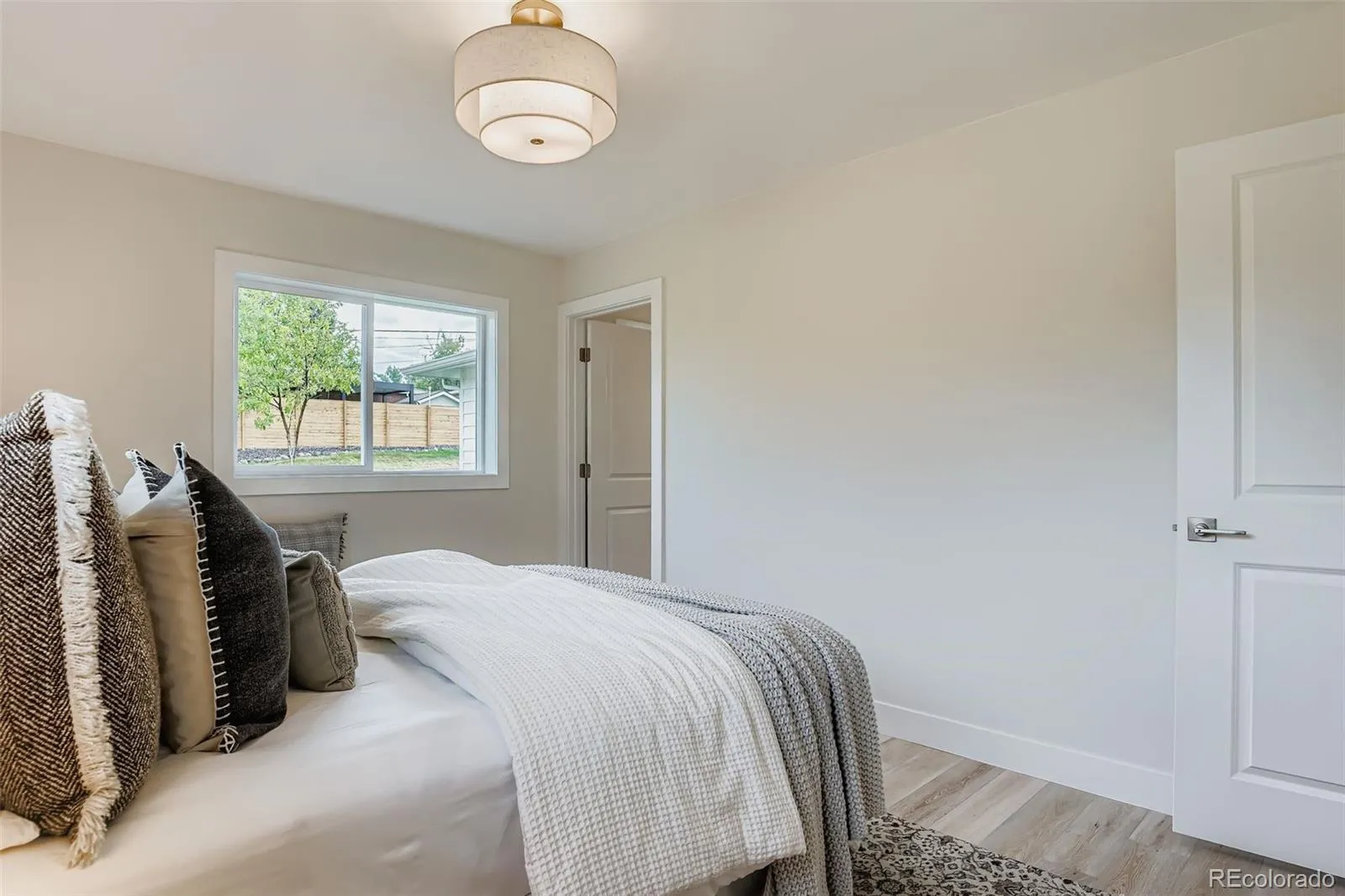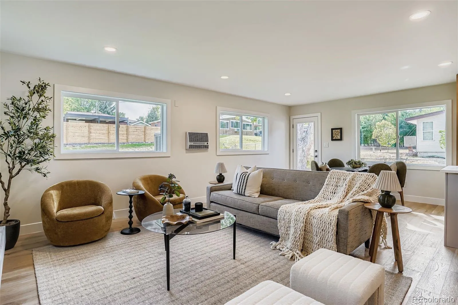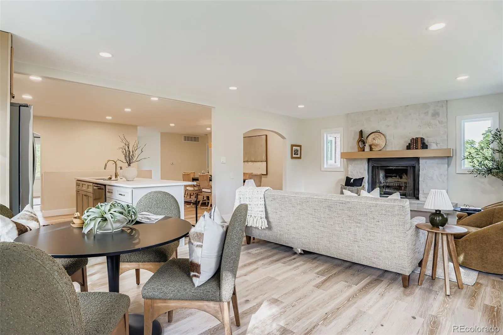 Come see this stunning 5-bedroom, 3-bathroom ranch-style home nestled in the highly sought-after Green Mountain Village neighborhood of Lakewood. Every detail has been meticulously updated! This home showcases gorgeous updates throughout, including all new engineered hardwood floors on the main level, recessed lighting and new contemporary fixtures, and all new windows creating an abundance of natural light. The open floor plan highlights a spacious kitchen featuring a large quartz island with breakfast bar, seamlessly connecting to a warm and inviting living room anchored by a cozy wood-burning natural stone fireplace—a stunning focal point of the space. The primary suite offers a private bath and walk-in closet, while two additional main-level bedrooms share a beautifully updated full bathroom. The finished basement expands the living space with another spacious living area, ample storage, two generously sized bedrooms with view-out windows and lots of light, and a stylish three-quarter bath. Step outside to enjoy the back patio and deck overlooking a fenced backyard with mature trees and landscaping and plenty of room to entertain guests, garden, or just relax outdoors. Brand new driveway with room for multiple cars, rv, boat, etc. Located in West Lakewood, this home provides access to Green Mountain’s many parks, trails, and local amenities, including nearby hiking and biking paths, restaurants, St. Anthony’s hospital, Denver Federal Center (including Light Rail stop), Red Rocks, and major routes for commuting or mountain getaways. This is a rare opportunity to own a beautifully updated home in an ideal location for outdoor enthusiasts and those seeking both comfort and convenience.