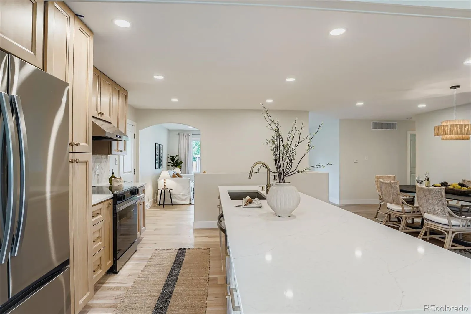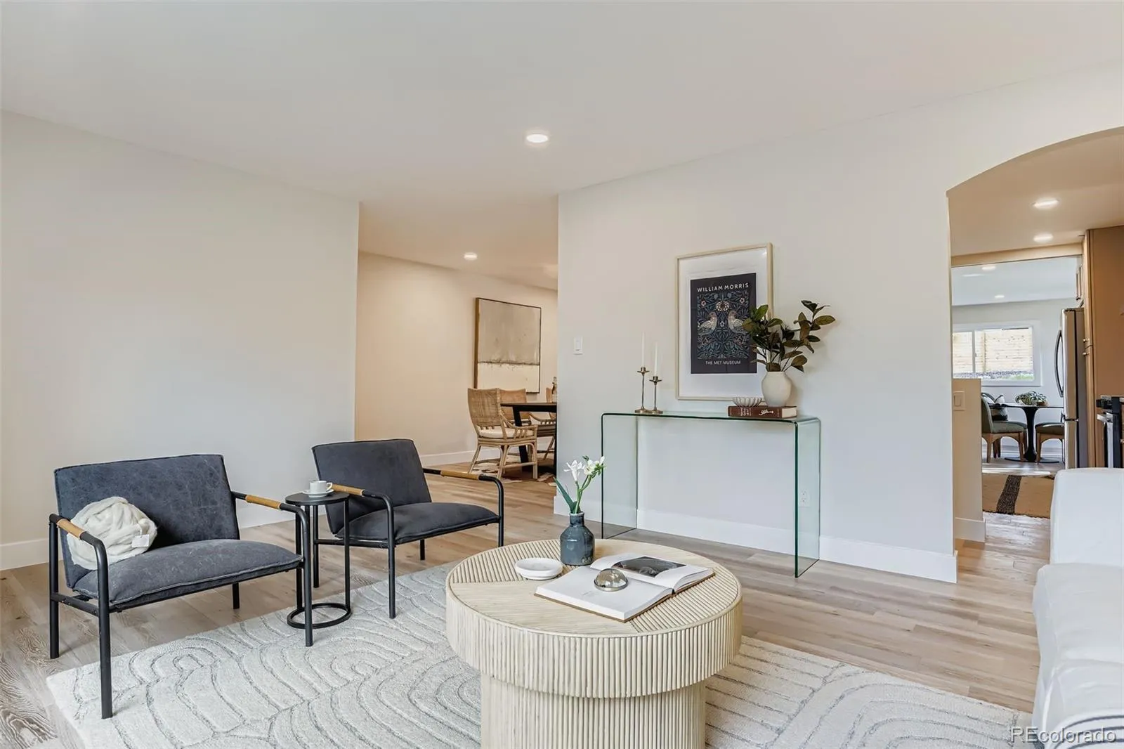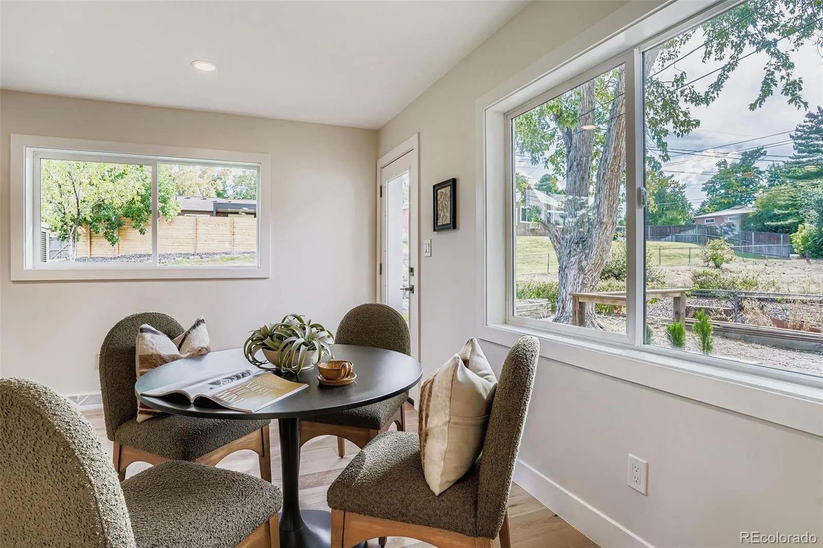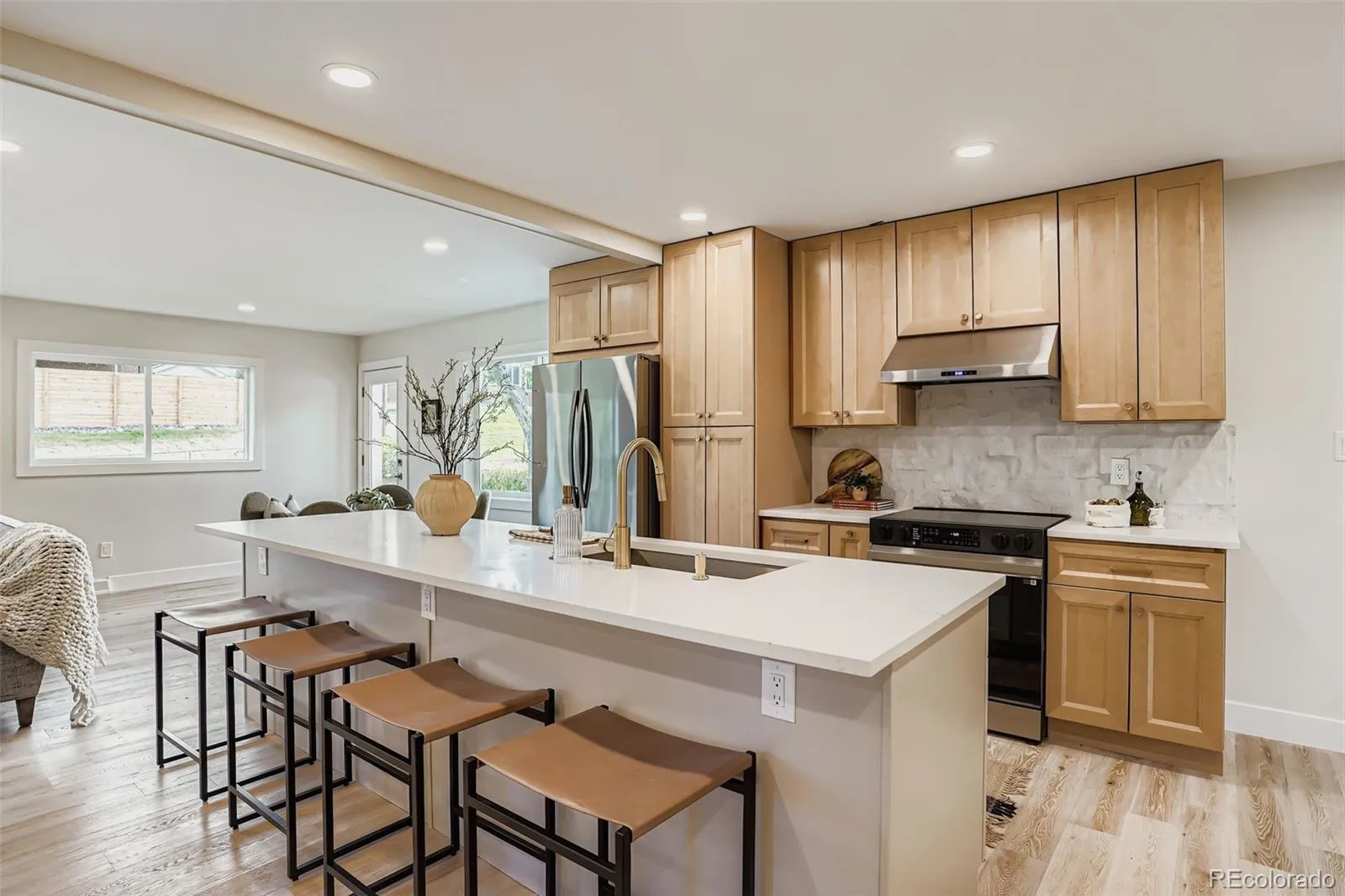 Come see this stunning 5-bedroom, 3-bathroom ranch-style home nestled in the highly sought-after Green Mountain Village neighborhood of Lakewood. Every detail has been meticulously updated! This home showcases gorgeous updates throughout, including all new engineered hardwood floors on the main level, recessed lighting and new contemporary fixtures, and all new windows creating an abundance of natural light. The open floor plan highlights a spacious kitchen featuring a large quartz island with breakfast bar, seamlessly connecting to a warm and inviting living room anchored by a cozy wood-burning natural stone fireplace—a stunning focal point of the space. The primary suite offers a private bath and walk-in closet, while two additional main-level bedrooms share a beautifully updated full bathroom. The finished basement expands the living space with another spacious living area, ample storage, two generously sized bedrooms with view-out windows and lots of light, and a stylish three-quarter bath. Step outside to enjoy the back patio and deck overlooking a fenced backyard with mature trees and landscaping and plenty of room to entertain guests, garden, or just relax outdoors. Brand new driveway with room for multiple cars, rv, boat, etc. Located in West Lakewood, this home provides access to Green Mountain’s many parks, trails, and local amenities, including nearby hiking and biking paths, restaurants, St. Anthony’s hospital, Denver Federal Center (including Light Rail stop), Red Rocks, and major routes for commuting or mountain getaways. This is a rare opportunity to own a beautifully updated home in an ideal location for outdoor enthusiasts and those seeking both comfort and convenience.