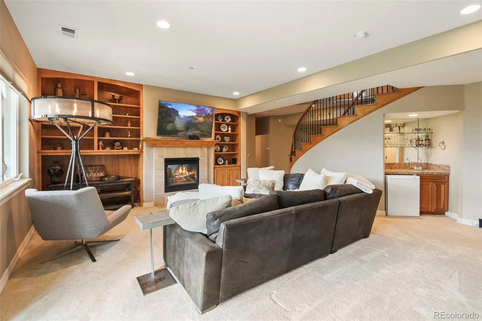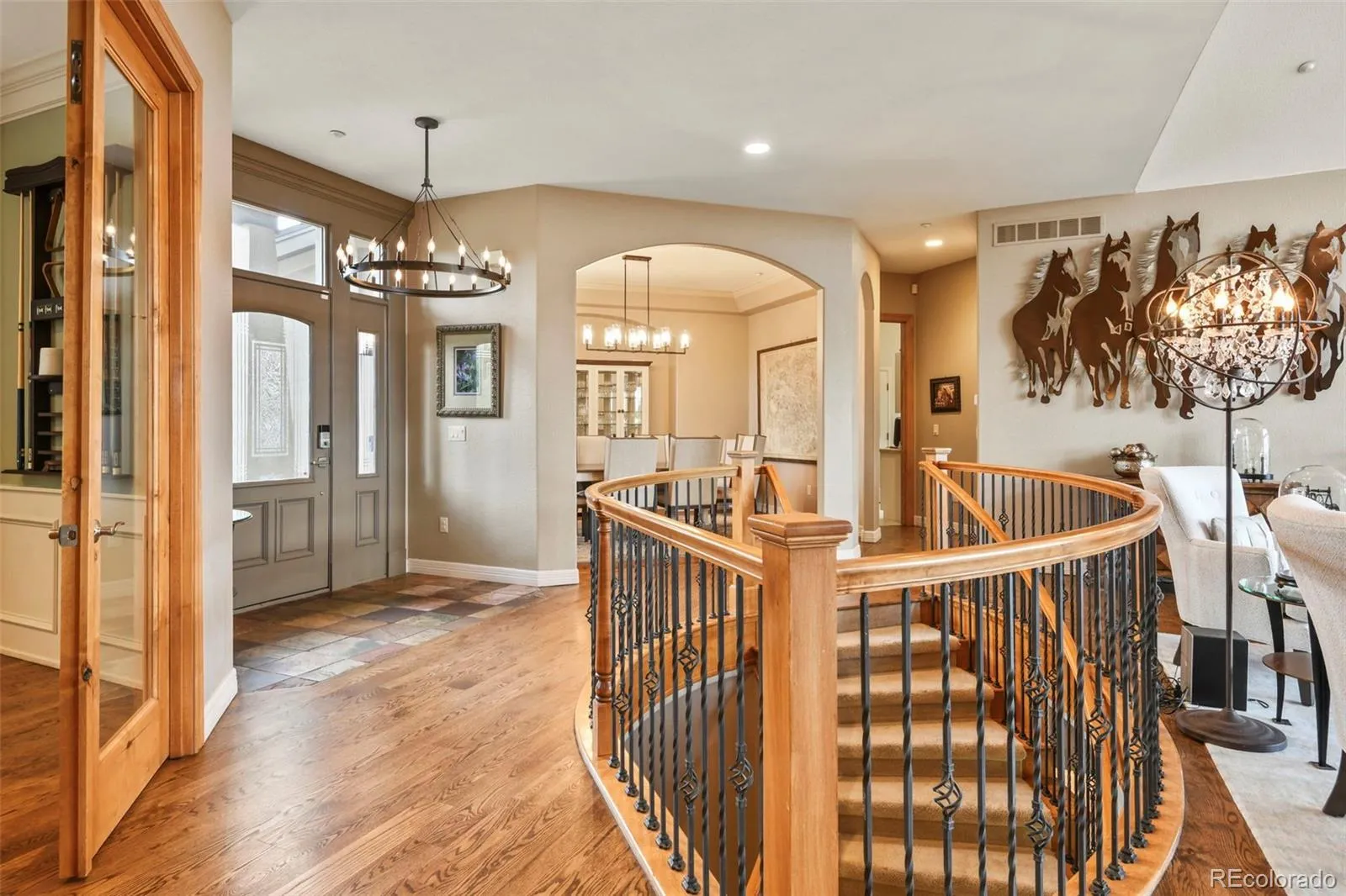 The striking spiral wrought-iron staircase anchors the entry, leading to open living spaces enhanced by three gas fireplaces and custom built-ins throughout. The main level showcases updated 5-inch plank hardwood floors, seamlessly connecting the formal and casual living areas.