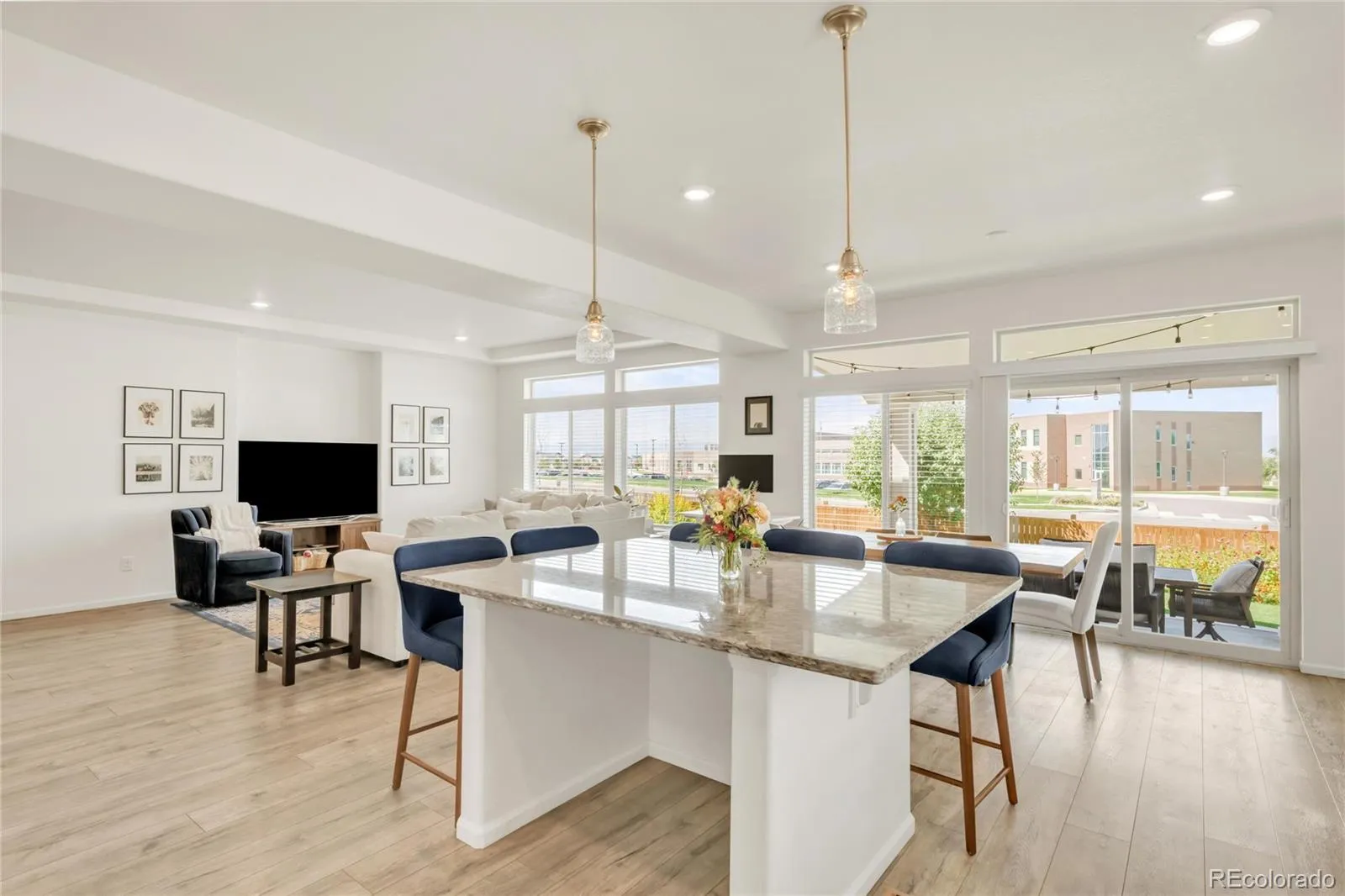 Step into a bright and cohesive living space with 9-foot ceilings, wall-to-wall west-facing windows, a well appointed great room space, and a LARGE and highly functional kitchen with stainless steel appliances, upgraded soft-close custom pull-out cabinetry, granite countertops, island seating for four, and a reach-in pantry. This home lives BRIGHT AND CLEAN.