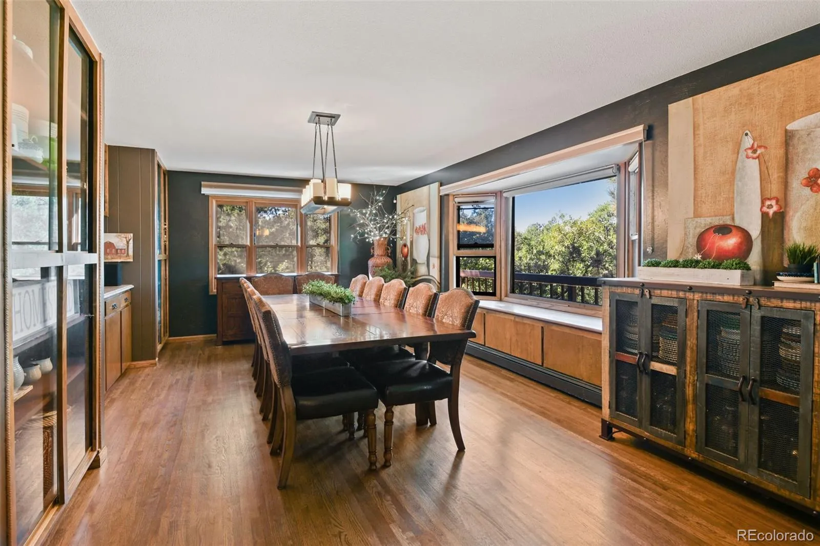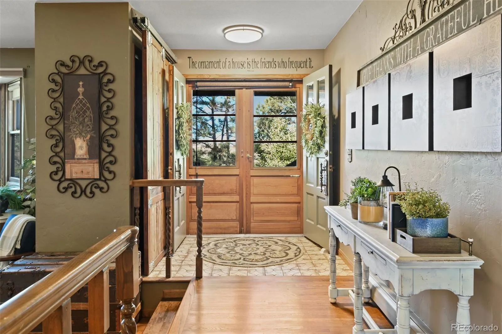 Nearly 6 acres of land! **BEAUTIFUL COUNTRY AND FOREST LIVING, YET CITY CLOSE, WITH NO HOA** Welcome to this AMAZING one-of-a-kind property where vintage charm meets modern purpose. Built by the father/son team who also built the Keystone Lodge, this home embraces style, warmth, comfort, and hospitality. From the moment you walk into the front foyer, with so many of its original features, you are immersed in authentic Colorado lodge living. With multiple and very intentional indoor and outdoor gathering areas, this property is ready for all your entertaining dreams and future special events. The living room and great room share the 2-sided wood-burning fireplace, one side anchored by the moss rock found on the property itself. The dining room and updated kitchen have so much built-in storage! The primary suite is just a few steps up from the main floor and boasts a huge bedroom with private sitting area and access to the walk-around deck where you can watch the glorious sunsets over the Rocky Mountains. A large walk-in closet, a five-piece updated bath showcasing a quaint clawfoot tub, and a separate office/den/nursery make up the entire primary suite floor. On the lower level, you will find 3 more bedrooms and a full bath. The walkout basement has a private entrance, perfect to use as an in-law suite, tenant, or for a home-school room. There is also a man-cave area, along with a 3/4 bath. What makes this home so special is that each specific area carries its own unique story! No detail was overlooked when making the necessary modern updates while maintaining the nostalgic charm. There is a barn, greenhouse, firepit, chicken coop, and His & Her sheds. ALL THE EXTRAS: a boiler for heating, 2 water heaters, generator, central vacuum system, metal roof, storm windows, cords of wood, propane tank, radon mitigation system, updated interior and exterior light fixtures, custom kitchen pieces, updated garage doors, wishing well, ceiling fans, and so much more.