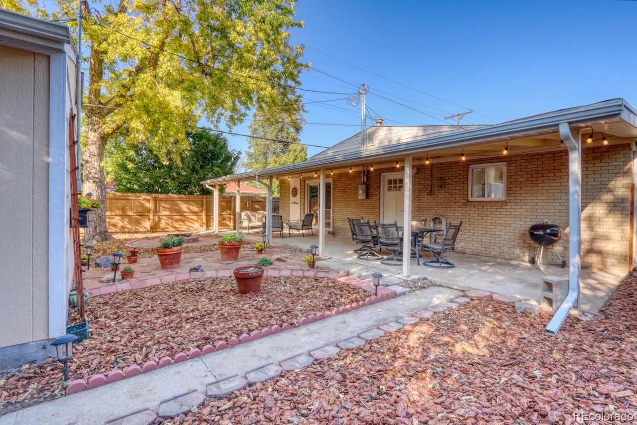 xeriscaped front yard. The fenced backyard with a covered patio and a cozy fire pit will