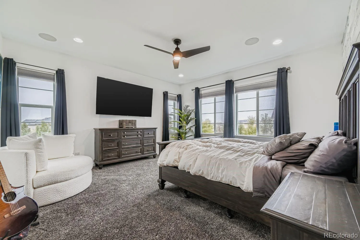 OWNED SOLAR and a $20,000 ALLOWANCE FOR AN INTEREST RATE BUY-DOWN OR CLOSING COSTS, Pre-inspected! Contact agent for report. This Colliers Hill two-story is set on a corner lot with sweeping mountain views and combines space, style, total home automation, and thoughtful updates. COMMUNITY FEATURES 2 POOLS and 2 GYMS. A bright two-story foyer welcomes you into the great room with a cozy gas fireplace and open dining area. The gourmet kitchen features granite counters, a large island, stainless appliances, 2 OVENS and convection microwave and abundant cabinetry. The main level also offers a private study plus a bedroom with nearby bath-perfect for guests or multigenerational living.Upstairs, the owner’s retreat impresses with a remodeled spa-like 5-piece bath and soaking tub. Two additional bedrooms each feature walk-in closets and full baths. The finished basement adds incredible versatility with a workout room, bedroom, bath, and spacious great room.Outdoors, enjoy updated curb appeal, a covered patio, and a backyard designed for entertaining with mountain views as your backdrop. Added perks include a brand-new roof, a tankless on-demand water heater, and a heated 3-car tandem garage with epoxy floors-plus energy-efficient upgrades throughout.Directly across from The Overlook amenity campus-with community lounge, demo kitchen, fitness studio, and pool-this home delivers comfort, convenience, and a vibrant lifestyle near shopping, dining, and commuter routes.