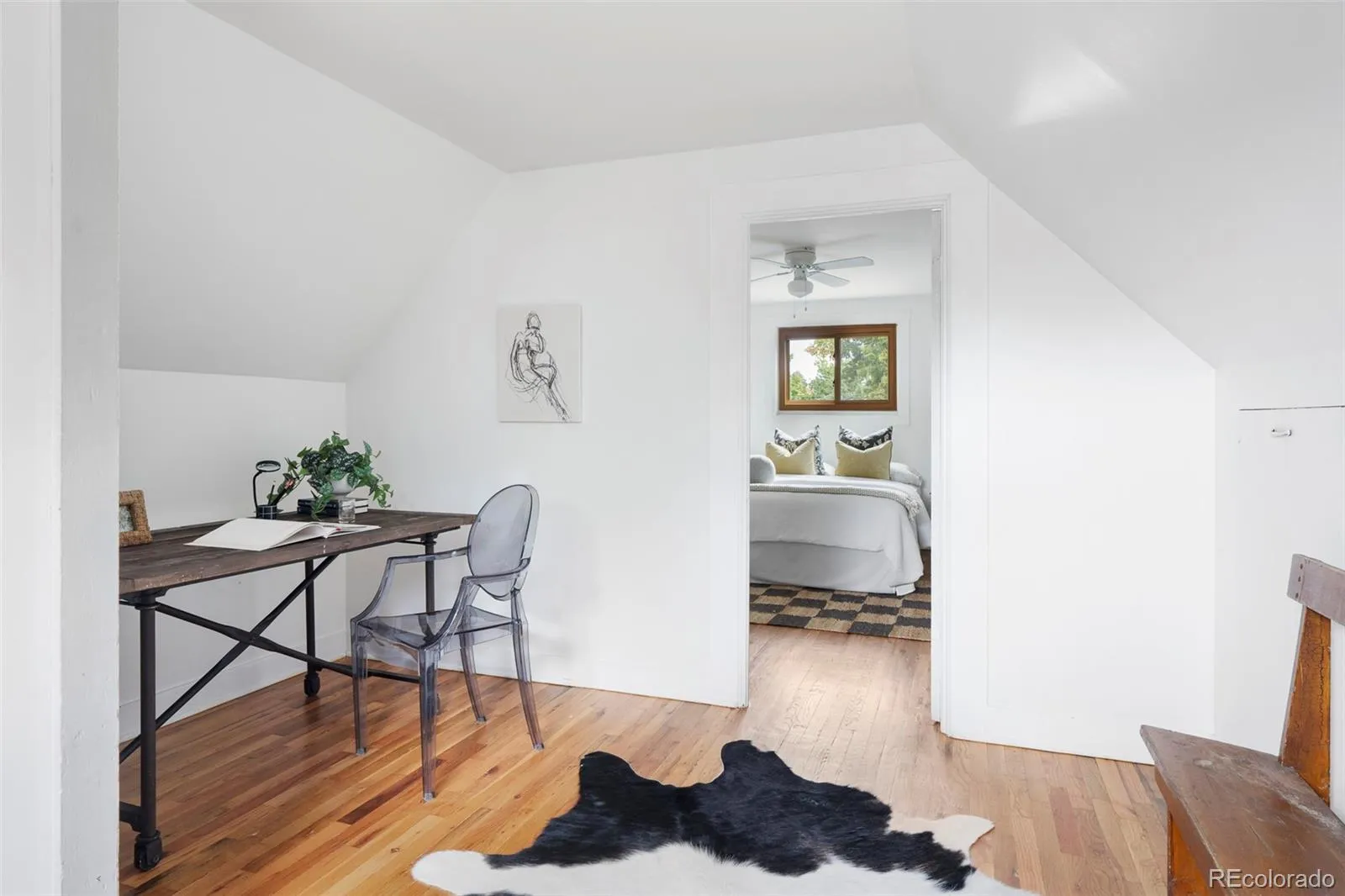 Upon entering, you are greeted by a bright and open living and dining area, highlighted by beautiful wood floors that add warmth and character to the space. The main floor includes a comfortable bedroom, while the upper level offers a versatile 1+ bedroom, perfect for a home office or guest room.