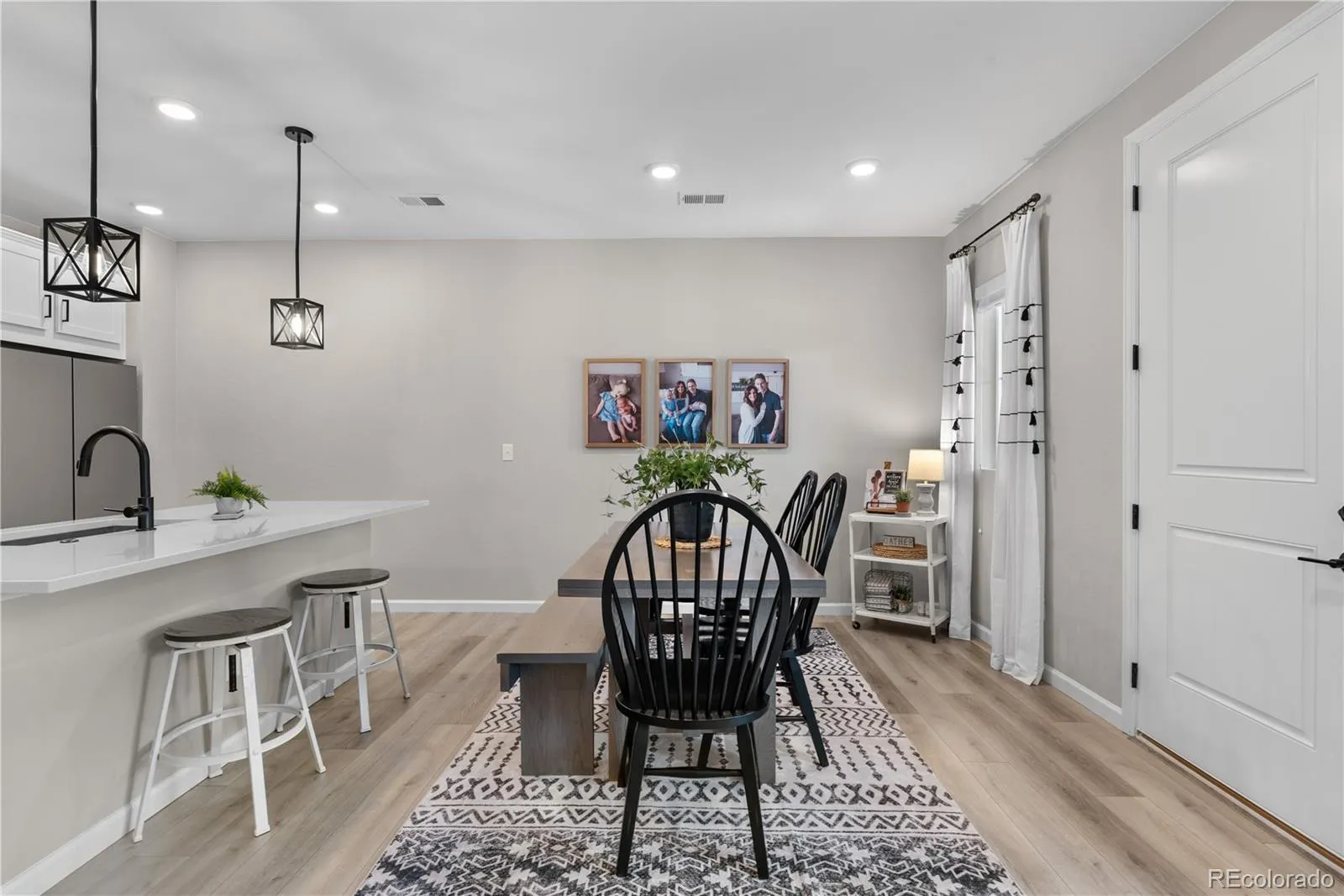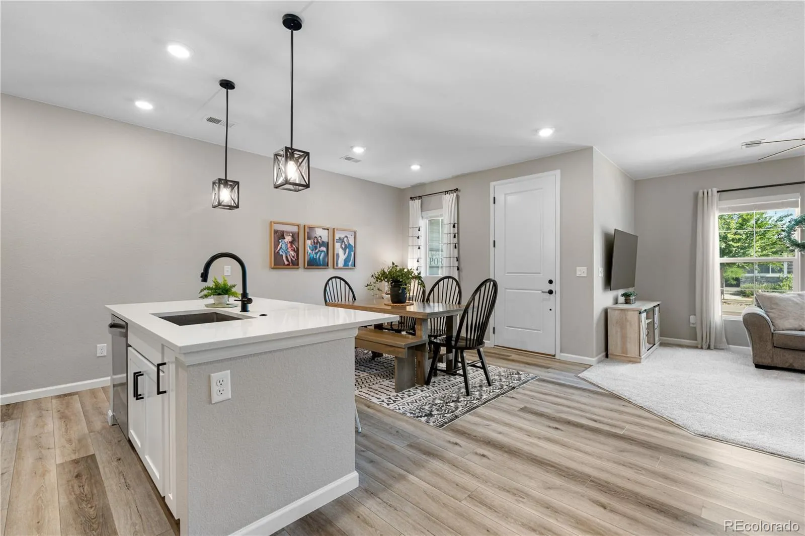 Welcome to Ascent Village, located in the thriving Sterling Ranch community! This 2022 Tri Pointe townhome offers the feel of a brand-new build—without the wait! Step through the private oversized front porch into an open-concept layout that flows effortlessly between the living, dining, and kitchen areas. The kitchen features a large island, pantry, upgrades include: backsplash, hardware, faucet, and stainless-steel appliances. On the main level, you’ll also find an oversized powder room and a closet with custom storage shelving.