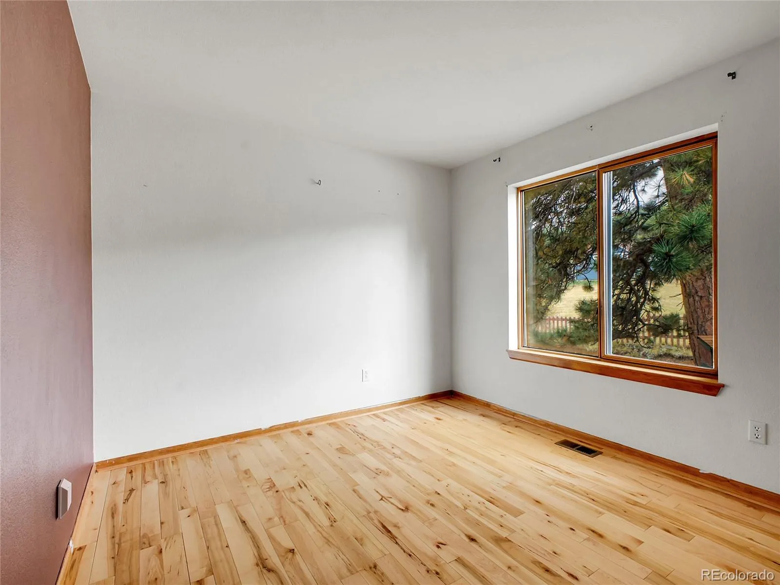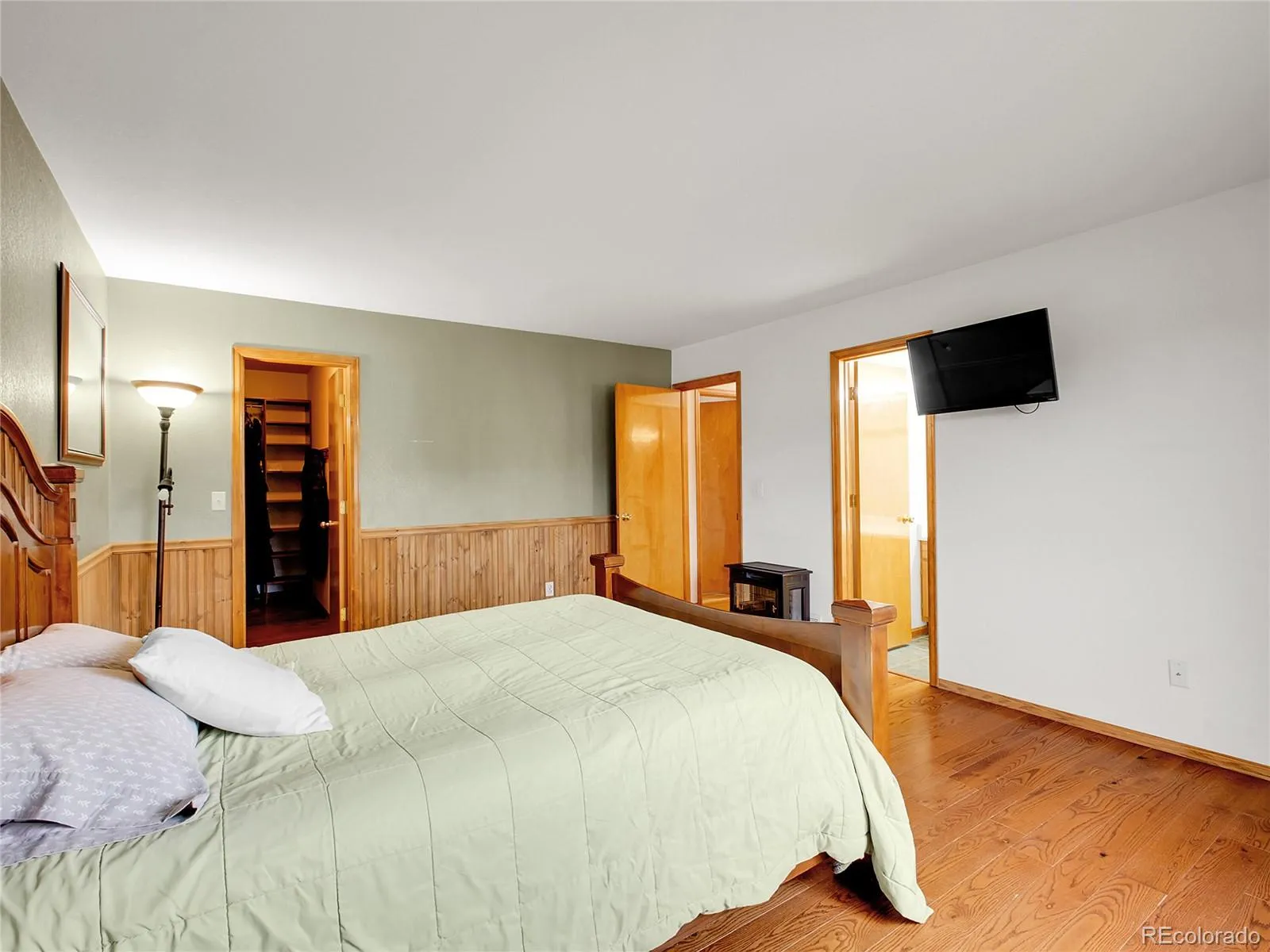 Inside, vaulted ceilings with exposed wood beams create a warm and open feel in the main living area. The eat-in kitchen features oak cabinets and stainless steel appliances, blending functionality with mountain charm. Main level primary bedroom is complete with wood floors, walk in closet and an ensuite bath. Main level is complete with another bedroom and updated full bath.