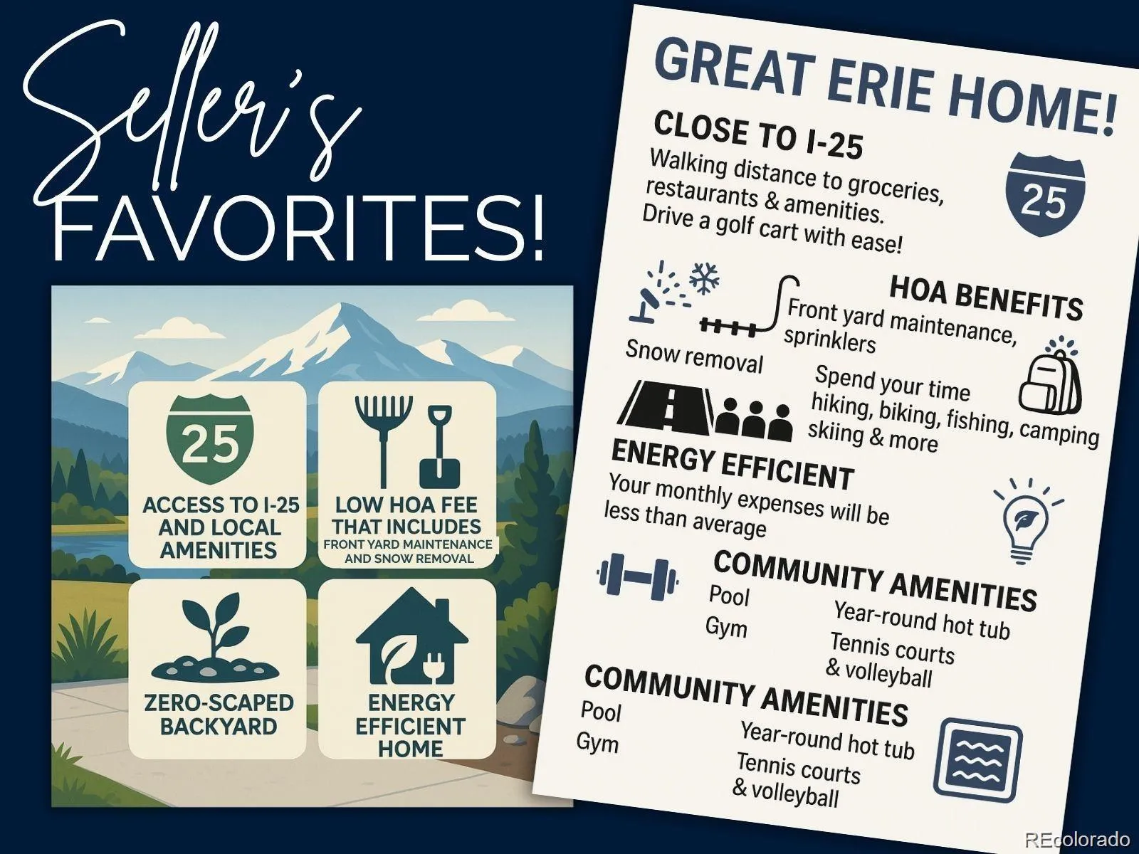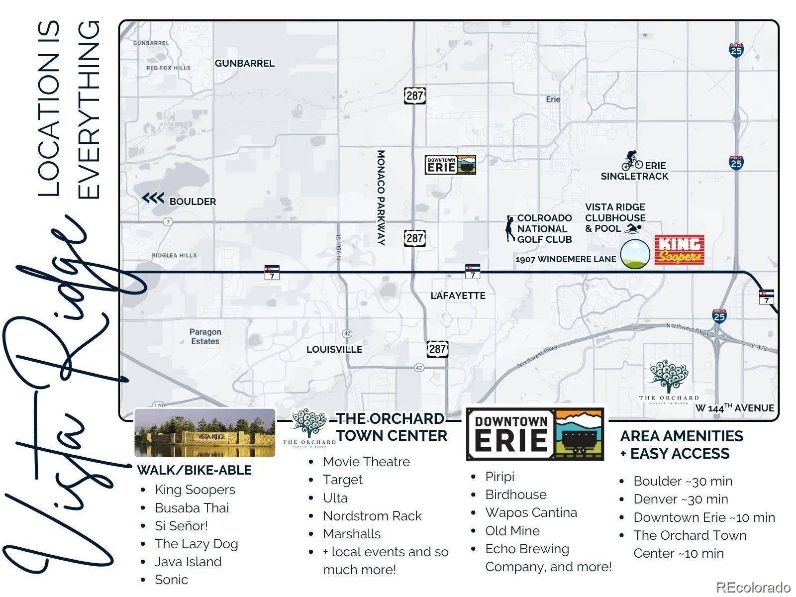 For those dreaming of resort-style living in a premier 5-star golf course community, welcome to 1907 Windemere Lane! A carefree haven surrounded by exceptional amenities. This rare, low-maintenance lock and leave ranch-style home offers the perfect blend of comfort and convenience. This 3-bedroom plus office, 3-bathroom home offers nearly 3000 finished square feet, including a full finished basement—ideal for guests, recreation, or work-from-home flexibility. Everything you need is located on the the main level that is thoughtfully designed with an open floorplan, a kitchen island, breakfast nook, primary suite, and convenient laundry room. The HOA-maintained yard means more time to enjoy your weekends, not spend them mowing or shoveling snow. Recent updates include brand new carpet on main floor, newer exterior paint, and updated exterior landscaping. Hop in your golf cart for a quick ride to the Colorado National Golf Club for a round of golf or their popular weekend brunch. Enjoy access to Vista Ridge’s vibrant amenities, including the clubhouse, two resort-style pools, tennis courts, parks, and miles of scenic trails and walkable favorites like Lazy Dog, Si Senior, Java Island, Busaba, and King Soopers. You’ll fall in love with life in Erie! Where hot air balloons drift across the morning sky, the Thursday farmers market brings the community together, and downtown Erie offers an incredible mix of local restaurants and charming shops. Welcome home!