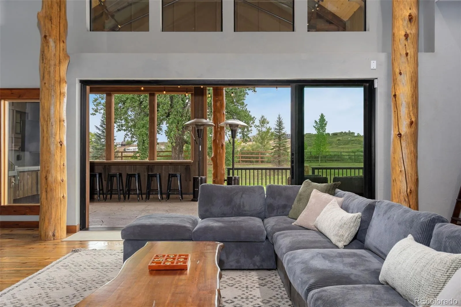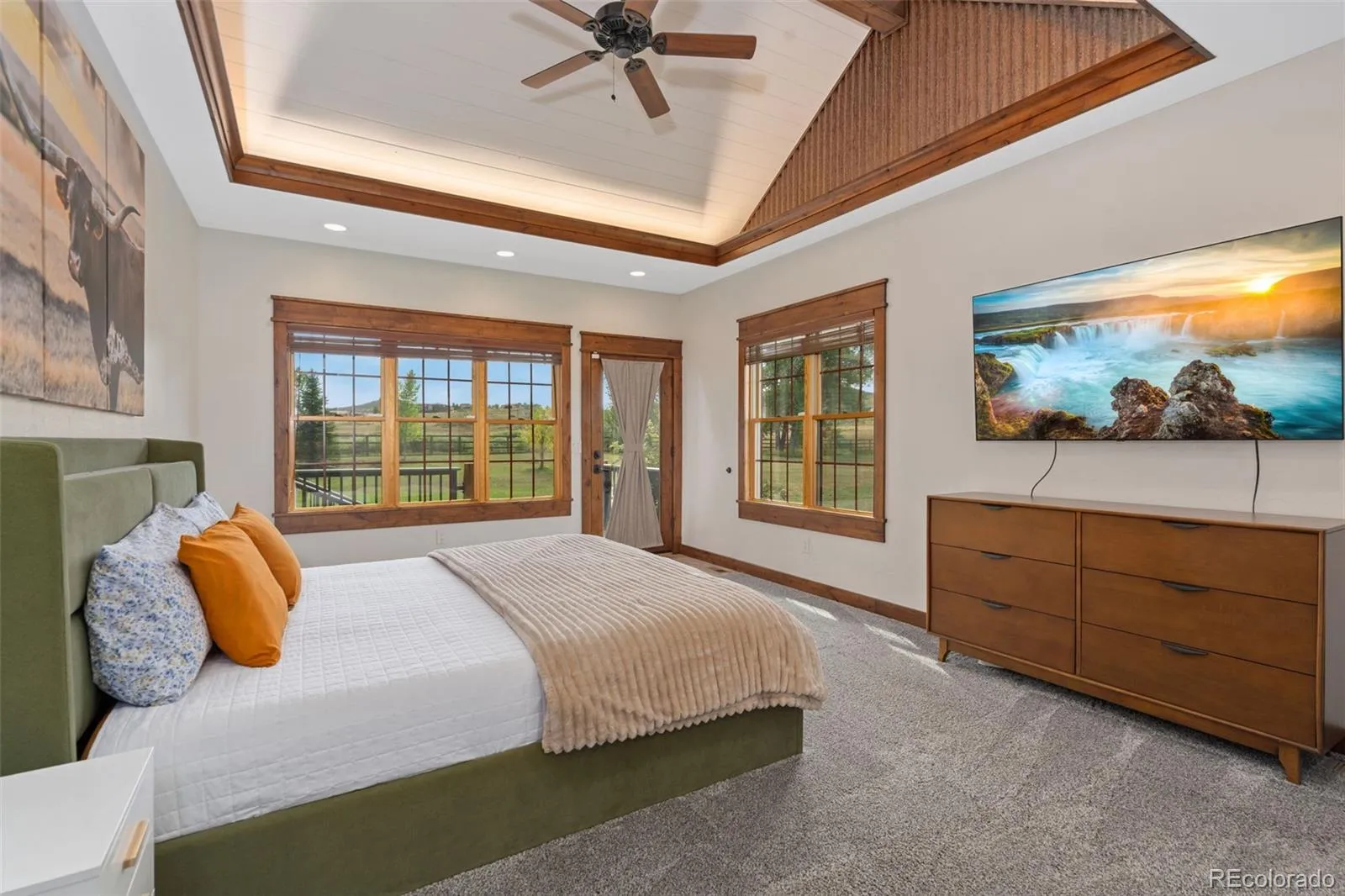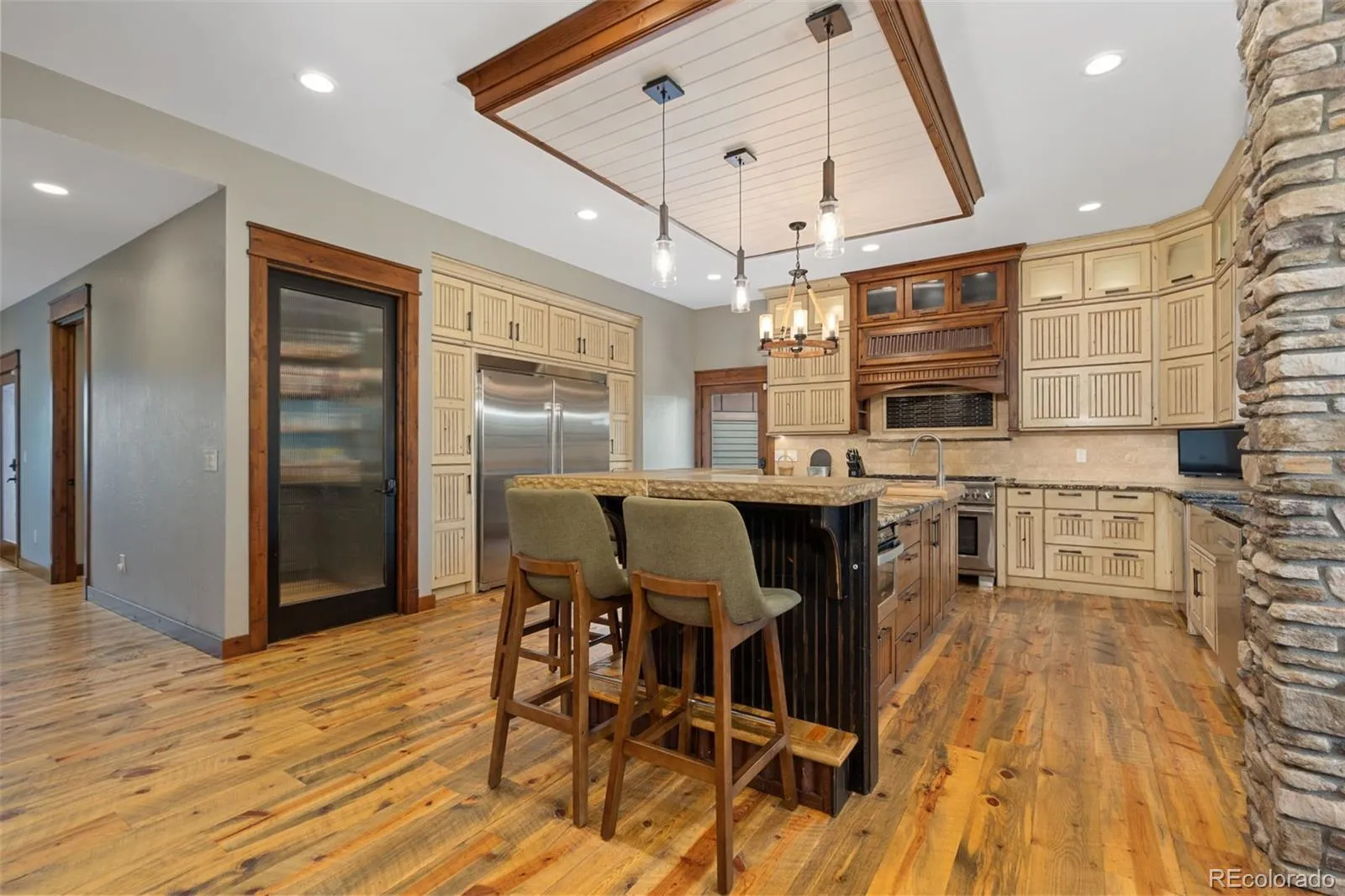 Step inside to soaring vaulted ceilings, custom wood beams, and striking wide-plank floors. A floor-to-ceiling stacked stone fireplace anchors the living room, while the gourmet kitchen impresses with a professional gas range, center island with board countertop, and tap-to-open cabinetry. The main-level primary suite is a true retreat with a private deck, spa-like 5-piece bath featuring pebble stone and wood accents, free-standing tub, electric fireplace, and dreamy walk-in closet with washer/dryer.