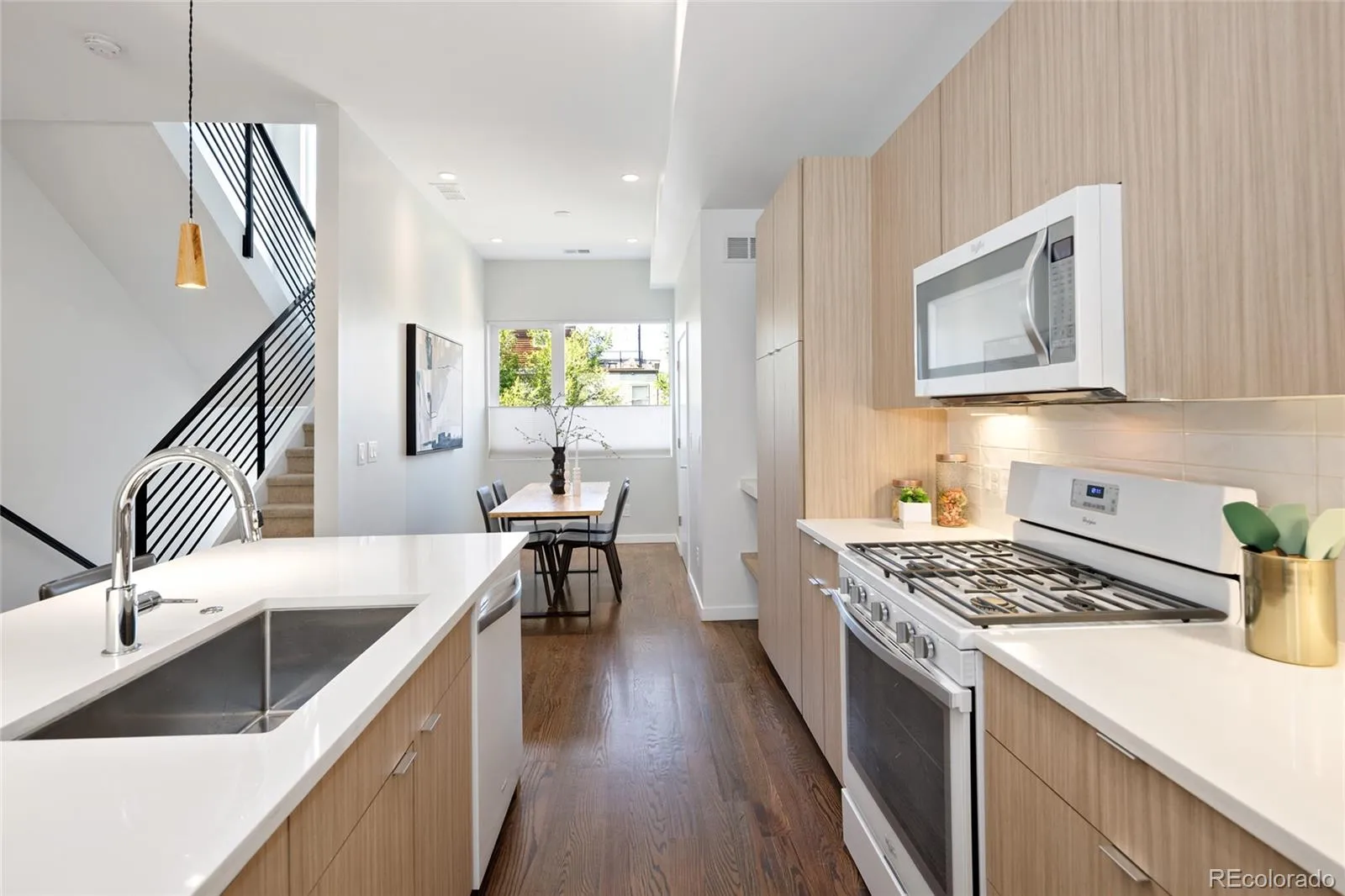 On the main level, an abundance of natural light fills the open concept living space. The seamless flow between the kitchen, dining area, and living room creates an ideal environment for everyday living and effortless entertaining. The kitchen is designed for both style and performance, featuring a gas range, sleek modern finishes, and ample storage.