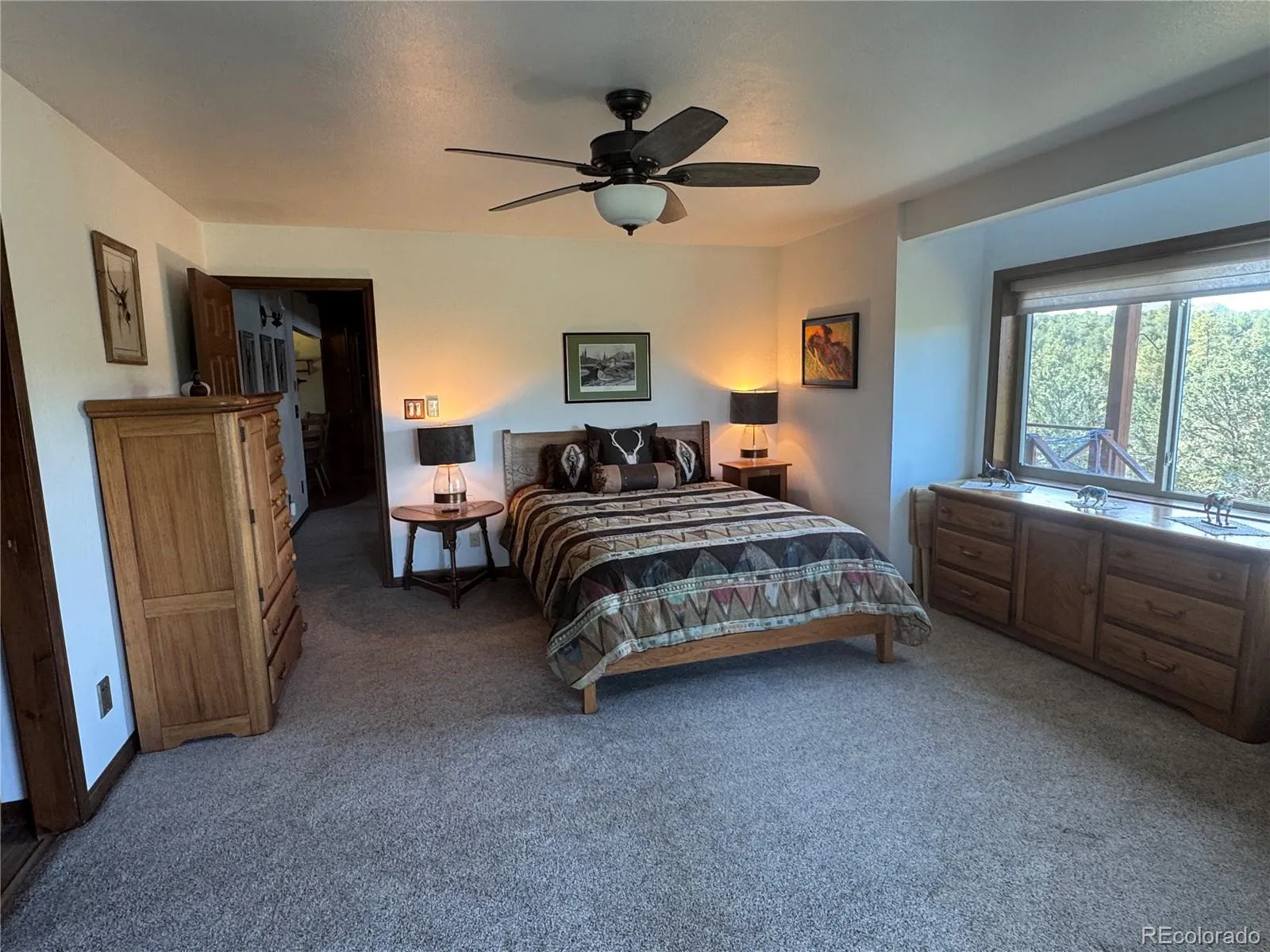 Lucky Horseshoe Ranch- Year round accessible cabin with rolling hills, meadows, seasonal water and mountain views in all directions is located in the desirable Bull Domingo subdivision. Move in condition with perimeter fencing in place for your horses and varied terrain offering natural shelter from the elements. This charming cabin has two bedroom and two and 1/2 baths, newer gas range/oven, refrigerator and dishwasher in the kitchen, a cozy living room with a stone accented gas fireplace and an attached spacious 2 car garage. Primary bedroom on main level has a cozy Vermont Casting stove for warmth, patio doors to deck and ensuite ¾ bath. Upstairs is an open bedroom as well as a full bath location. Covered deck entryway welcomes you to the delightful well -conceived living space and rear deck from patio doors in living room allows for Sangre de Cristo views and the lower meadow for wildlife viewing. Bonus heated studio is just across the driveway for extra space. This 43.71 acre holding is ready for your year round or seasonal occupation.