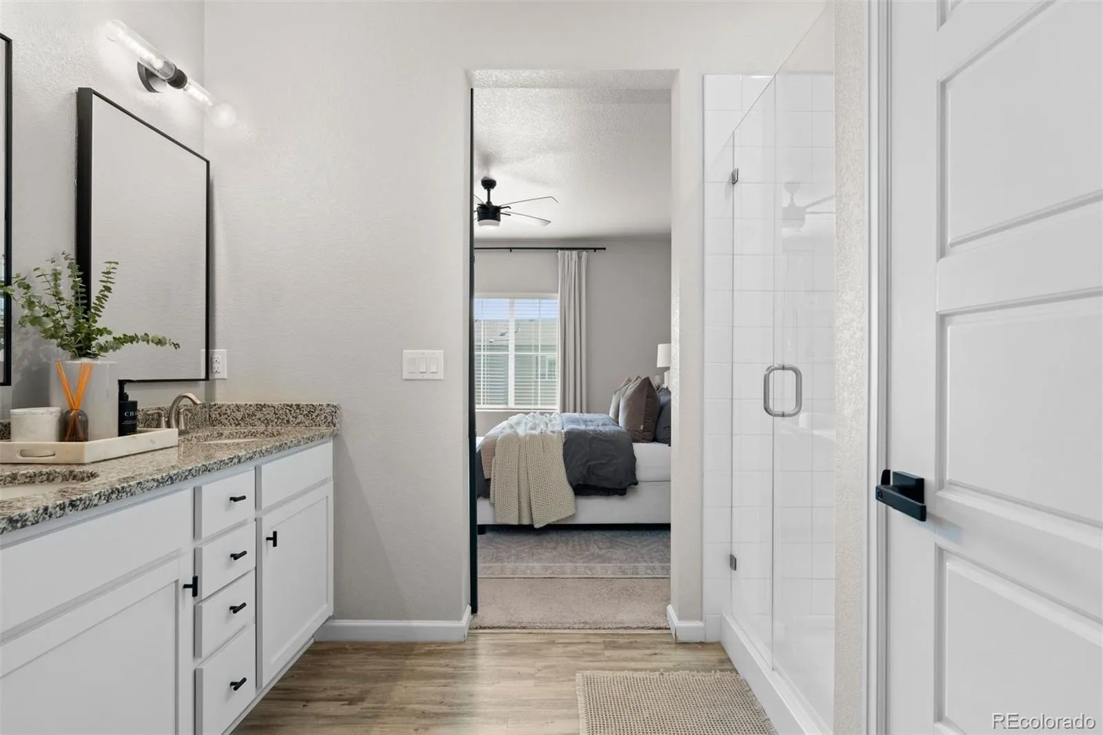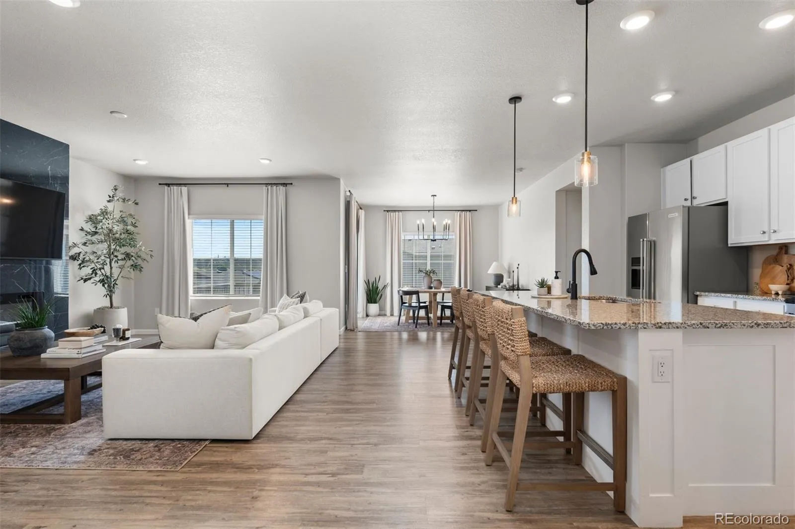 The chef’s kitchen shines with a generous island, abundant cabinetry, stainless appliances, and expansive granite counter space, all flowing seamlessly into the dining and living rooms to create a warm sense of connection. The sunlit primary suite is a true retreat, featuring dual sinks, a spacious walk-in shower, and direct access to the upgraded master bath with a custom sliding door. Two additional bedrooms share a stylish hallway bath, offering flexibility for extra space, guests, or a home office.