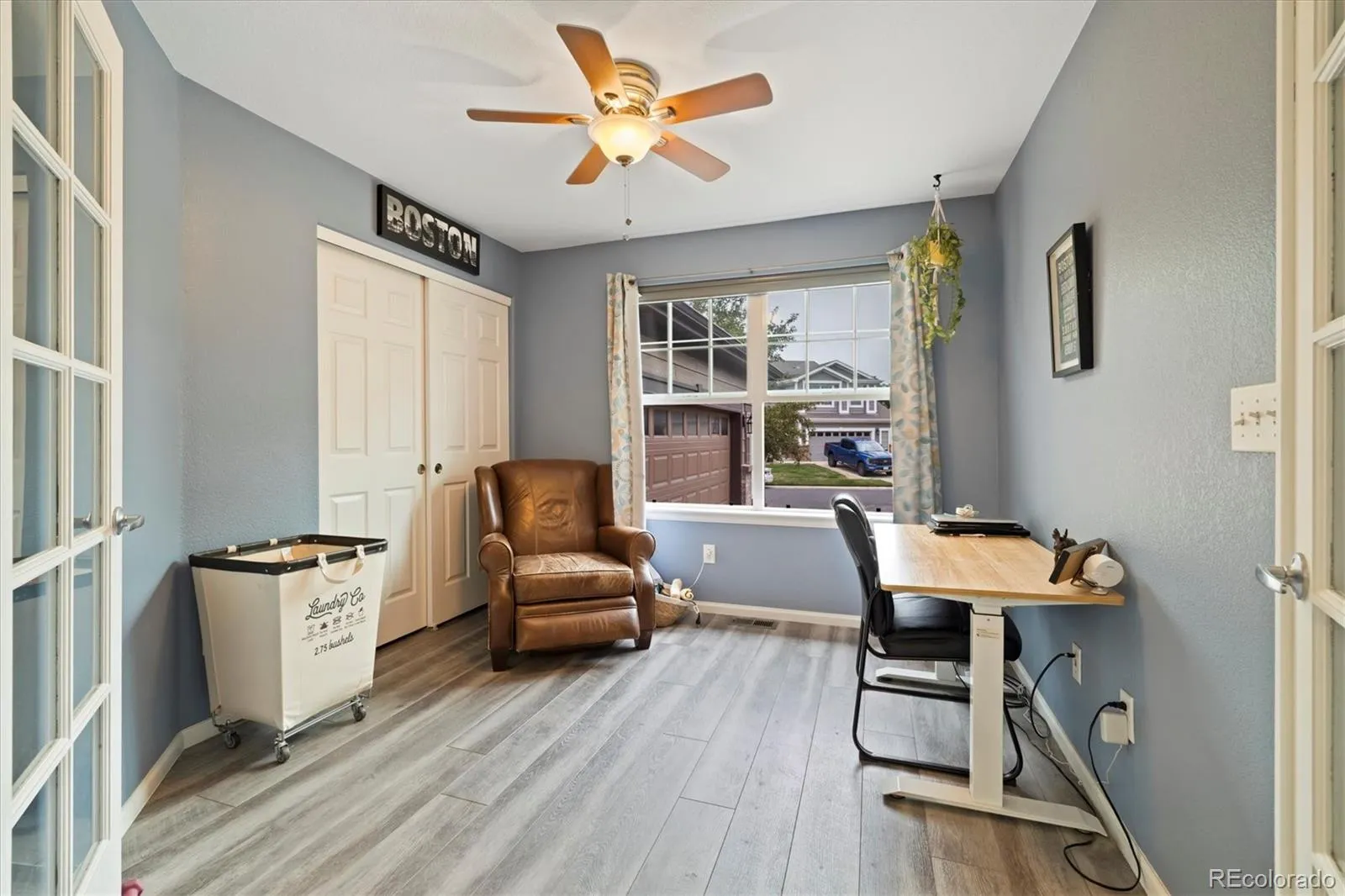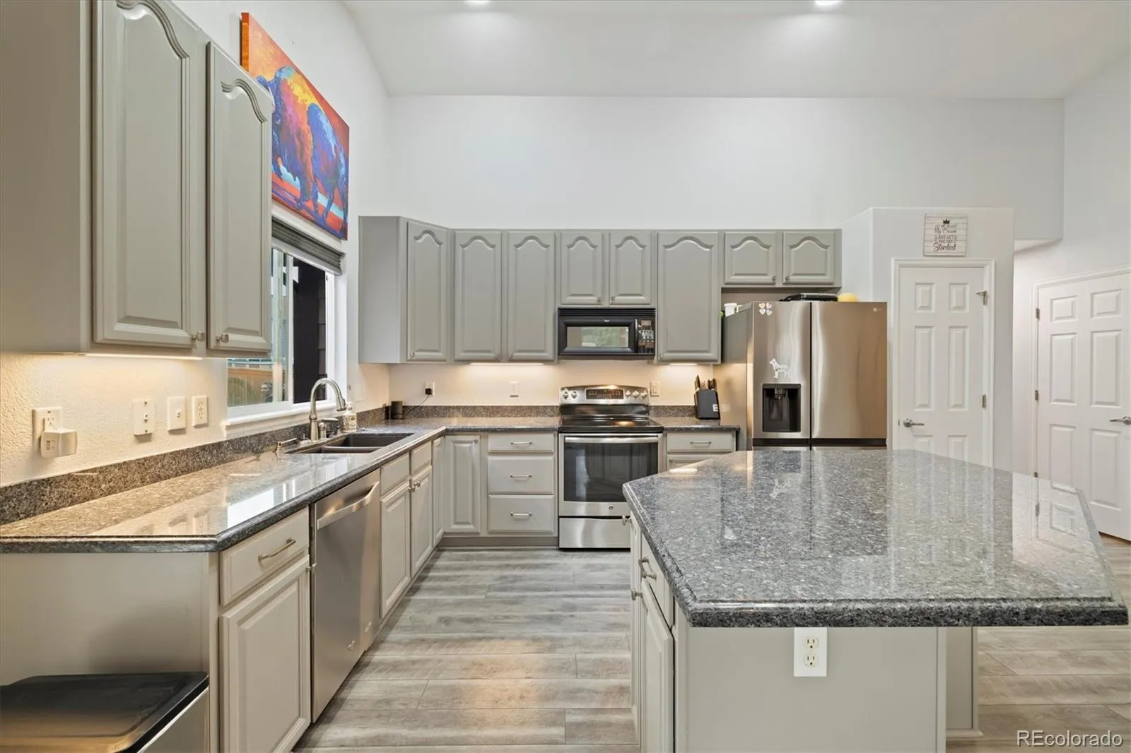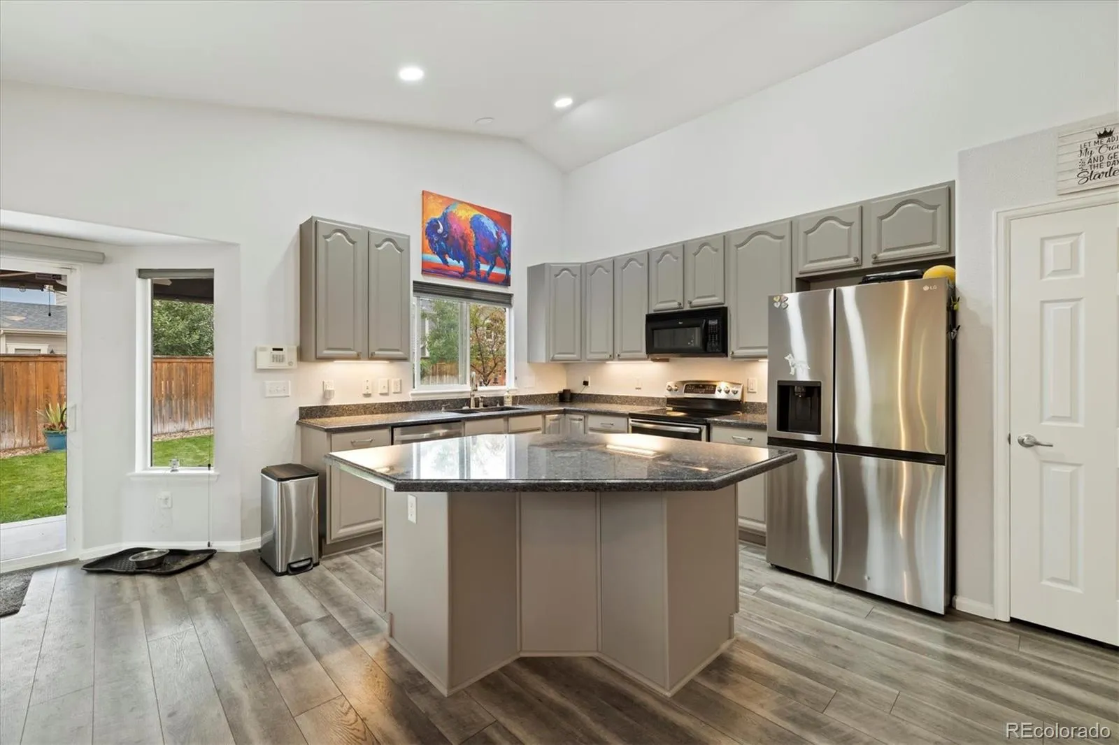 Nestled in the tranquil community of Buffalo Run Mesa in Reunion, Colorado, this beautiful single-story home offers a perfect blend of comfort, functionality, and modern updates. Featuring 3 spacious bedrooms and 2 full bathrooms, this home is ideal for anyone seeking ease of living with plenty of space. The sunny, open-concept kitchen is a chef’s dream, equipped with a gas stove, under-cabinet lighting, motion-sensor lighting in the pantry. From the kitchen you can step outside to enjoy the covered patio with a ceiling fan, ideal for outdoor gatherings and the gorgeous fully fenced yard. A cozy gas fireplace creates a warm ambiance in the living room, complemented by surround sound perfect for movie nights or entertaining. All window coverings are top-down/bottom-up shades, providing privacy and light control. Additional features include a mudroom with laundry off the attached two-car garage, a dedicated dog run on the side of the house, and a house fan for efficient cooling. The master suite boasts a large walk-in closet, offering ample storage. The neighborhood is quiet, with easy access to walking trails and nearby parks.The full unfinished basement awaits your personal touch—whether for hobbies, extra living space, or expanding your home in the future. Located just 10 minutes from DIA, 25 minutes from downtown Denver, and an hour to Evergreen and Conifer for outdoor adventures, this home provides both serenity and convenience. With nearby amenities—including the community pool and a grocery store within one mile, and the Rocky Mountain Arsenal Wildlife Refuge just 20 minutes—this property is ready to become your dream home. Experience one-level living in a charming, friendly neighborhood with all the comforts and amenities you desire.
