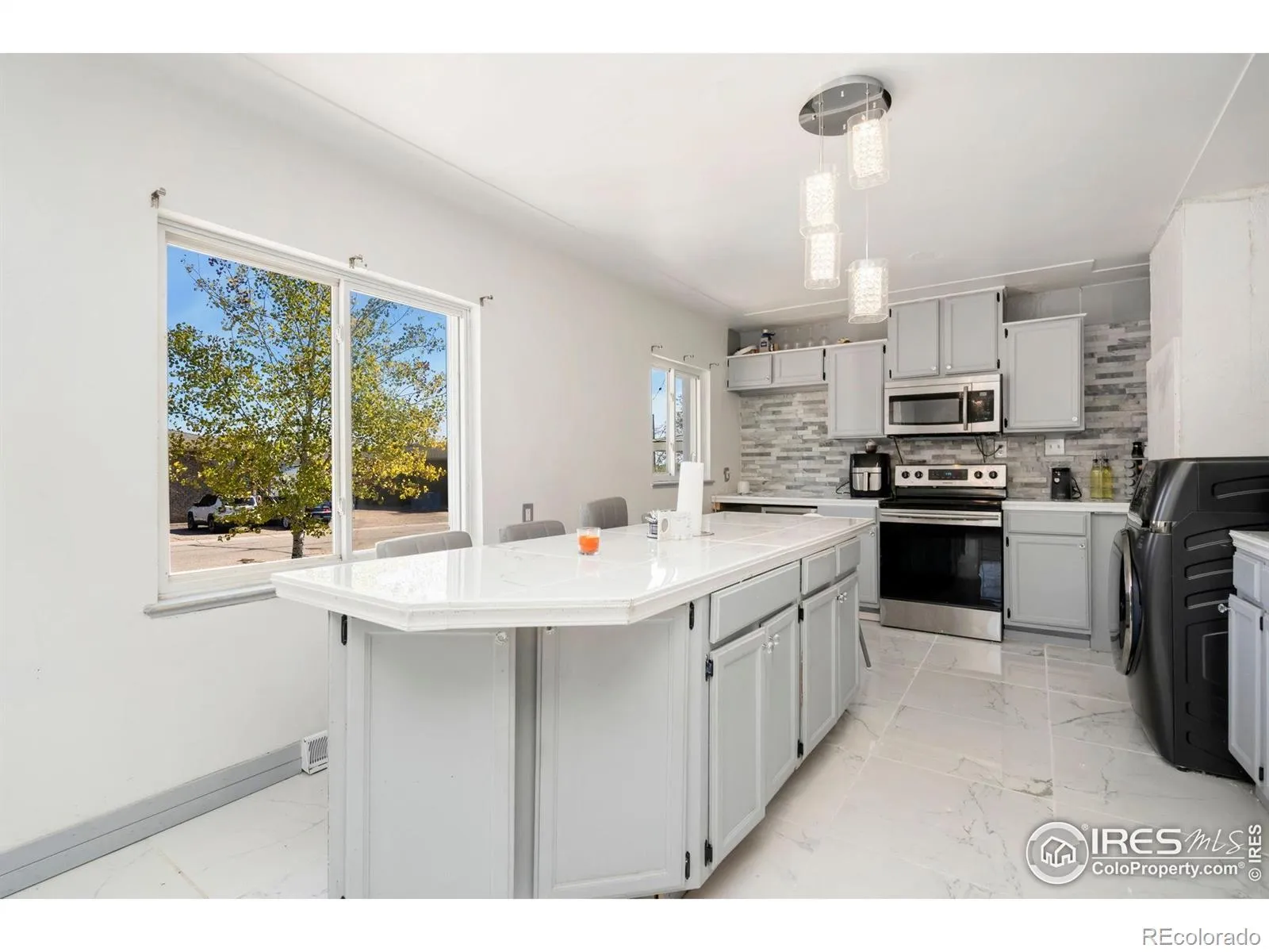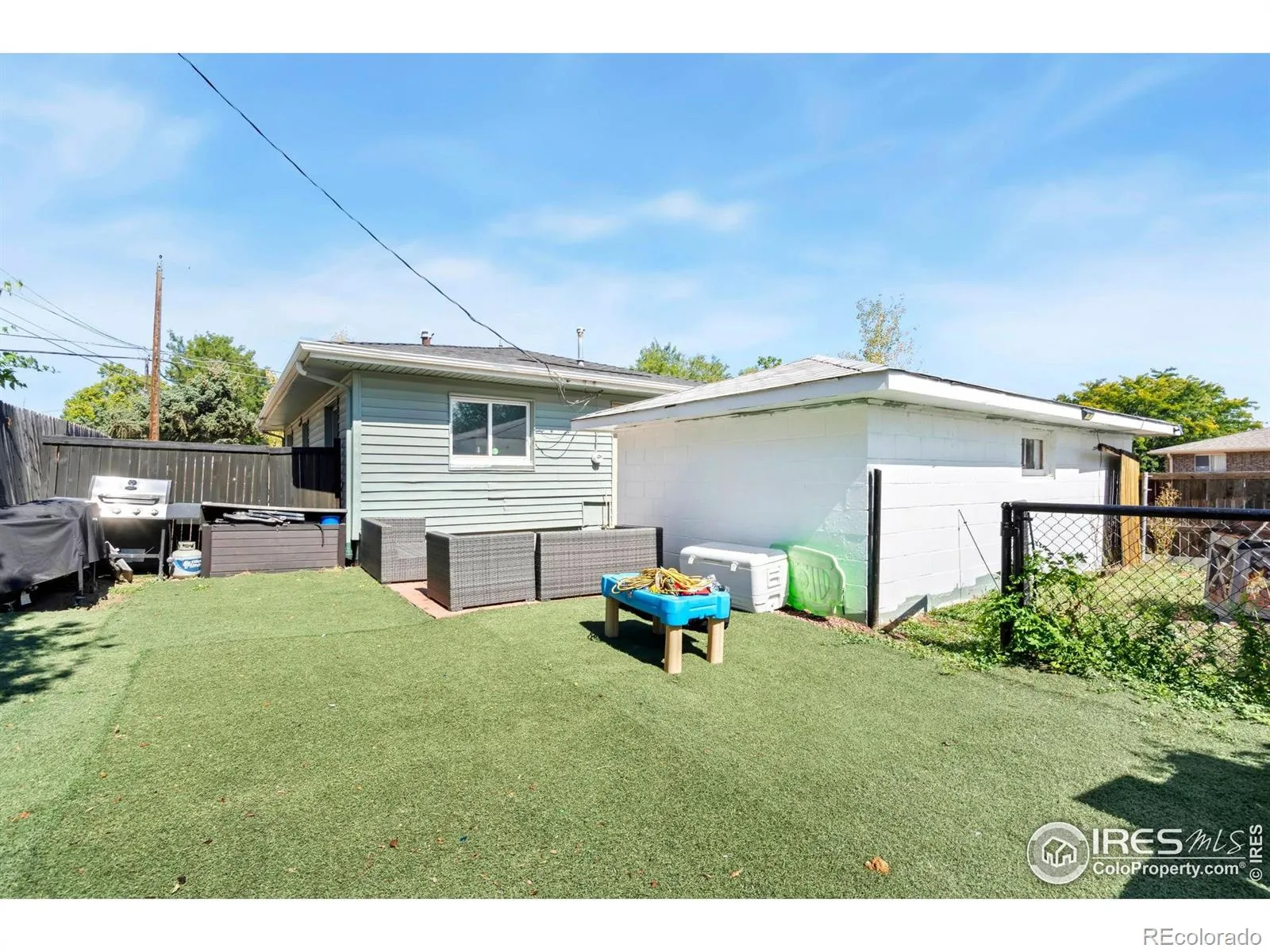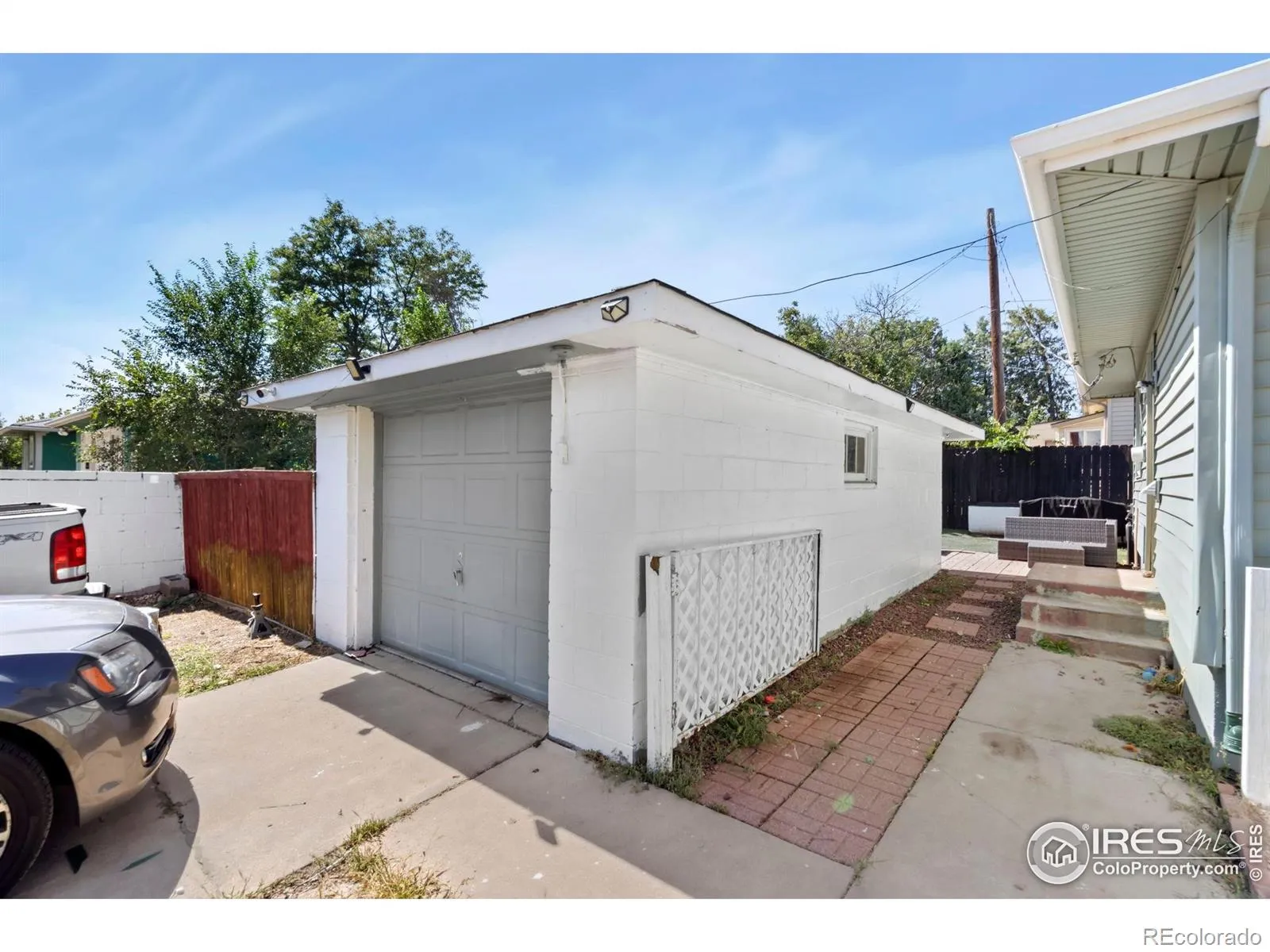 This charming corner lot home has been thoughtfully refreshed with numerous updates, creating a truly move-in ready experience. Inside, the single-level layout features 2 bedrooms and 1 bathroom, providing a cozy yet functional space that makes the most of every square foot. The main living area shines with fresh interior paint and brand-new white tile flooring throughout. Recently remodeled, the kitchen offers modern appliances, marble counters, a center island with seating, and the added convenience of a washer and dryer, making daily living effortlessly efficient. Outside, the large yard offers ample space for outdoor entertainment, with plenty of space for gardening or simply enjoying the Colorado sunshine. The detached garage offers additional storage space and secured parking. Convenient location, with easy access to major highways and all of Greeley’s amenities. No HOA!