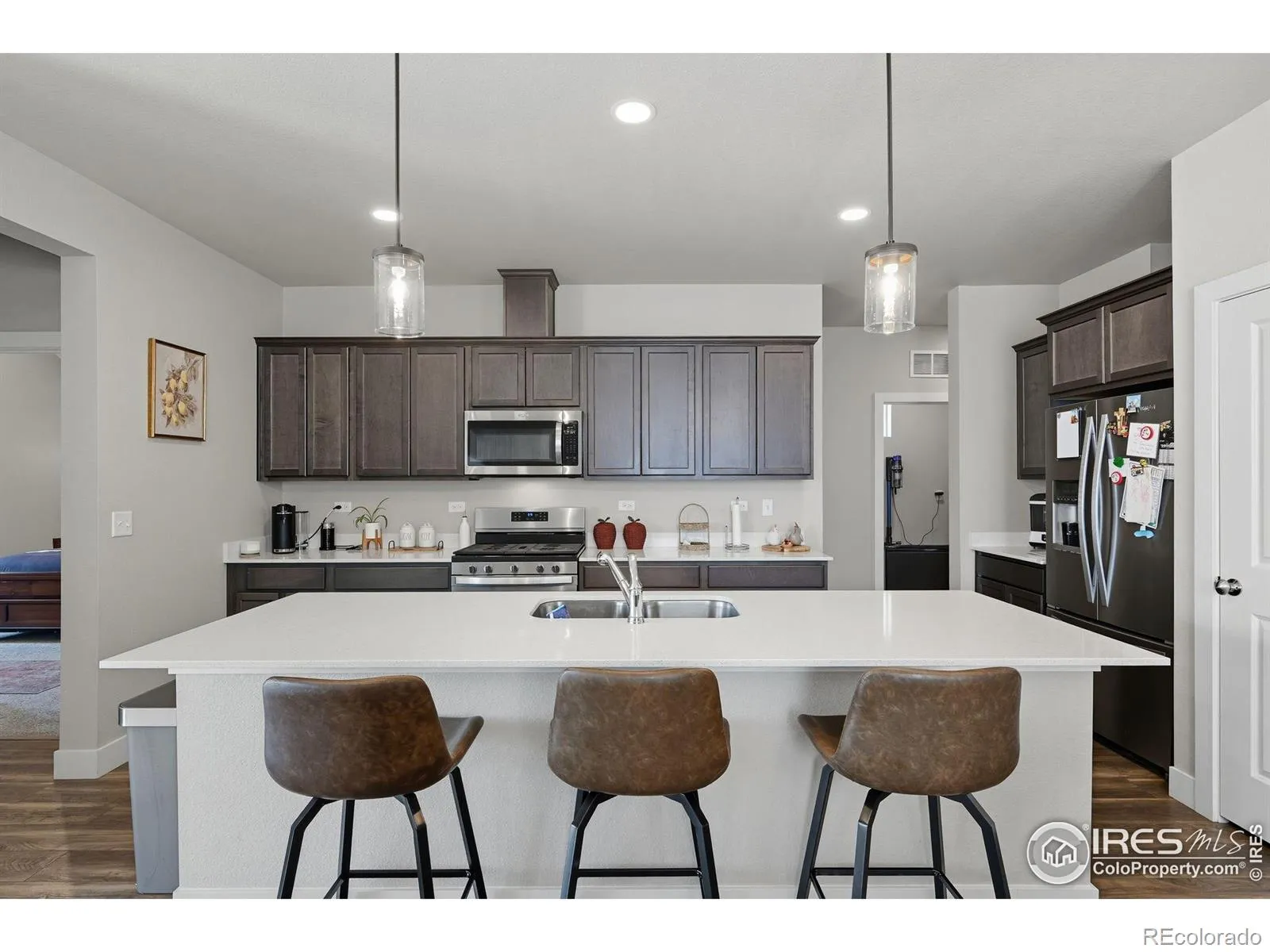 This thoughtfully crafted open-concept ranch home in City Center West backs to a serene open space, offering stunning views. An abundance of natural light and soaring ceilings create a bright, airy atmosphere, with a seamless flow from the dining area to the spacious living room, perfect for entertaining or relaxing evenings. Step outside from the living room onto the patio, ideal for morning coffee, evening wine, or quiet moments in the well-maintained backyard. At the heart of the home, the stylish kitchen is both functional and elegant, featuring sleek stainless-steel appliances, a gas range, crisp white quartz countertops, and ample cabinetry, and perfect for any home chef. The main-floor primary suite is a true retreat, with vaulted ceilings and a generous en-suite bath that includes a tile walk-in shower, dual vanities, and a spacious walk-in closet. Enjoy the convenience of the main-floor laundry and an attached three-car garage, offering plenty of storage and everyday convenience. Downstairs, the beautifully finished basement expands your living space with both comfort and versatility in mind. The spacious family or recreation room is perfect for a home theater, game room, or additional lounge area, making it ideal for entertaining or unwinding. Two generously sized bedrooms and a third bathroom complete the lower level, providing a perfect setup for guests, teens, or extended family.