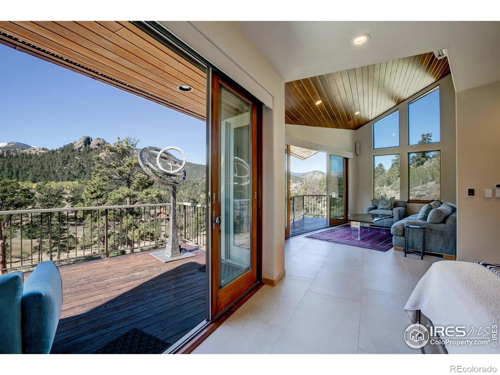 Perched in a setting of unbelievable peace and quiet, this extraordinary home offers sweeping views in every direction, highlighted by the breathtaking sight of Longs Peak and the meadow below. It is embraced by a park-like setting with the beauty and tranquility of a national park, all to yourself. Recently remodeled with no expense spared, this home welcomes you with a living room that opens to stunning views, setting the tone for every space. The chef’s kitchen features a Thermador six-burner range with built-in high-BTU wok, Miele built-in coffee system, and new Sub-Zero refrigerator/freezer, while hand-blown glass pendants illuminate the island with elegance. Sophisticated features continue throughout, including a stunning custom dining chandelier, Hunter Douglas electric blinds and UV window film on select windows, and a gas fireplace set in striking colored tile. Custom cherry and maple cabinetry flows throughout, complemented by hardwood and new ceramic floors with electric radiant heat and handmade tiles that add artistry and warmth. The luxurious primary suite with sitting area awaits, featuring a spa-inspired bath with Brazilian quartzite shower walls, an anti-streak custom glass steam enclosure, and finishes crafted for both beauty and function. Comfort and convenience are ensured with air conditioning, a newly expanded concrete driveway, and a fenced dog run area that blends practicality with mountain living. Adding to its allure, a studio/guest house is included in the square footage. With foundation repairs complete, new windows and doors installed, and permits in process, it’s ready to become a 2-bed, 2-bath guest retreat, art studio, or yoga sanctuary-the perfect canvas for your imagination. From sunrise to starlight, this home offers a rare balance of luxury, tranquility, and awe-inspiring views.