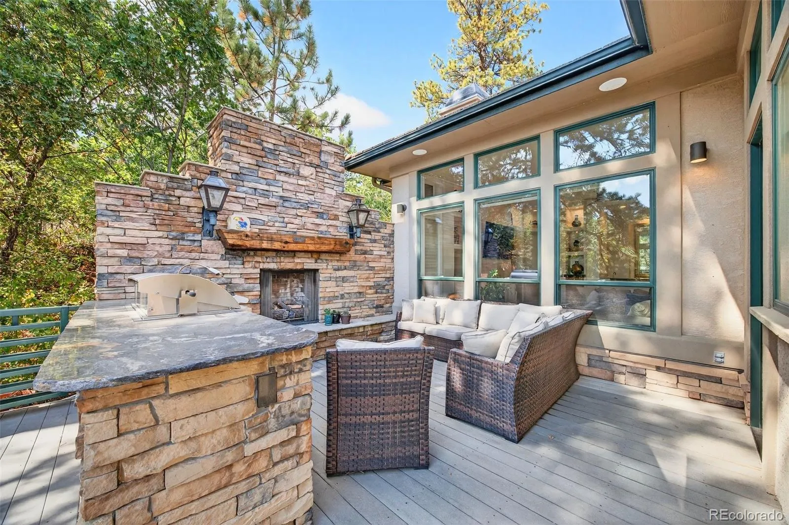 Luxury meets lifestyle in this stunning 5-bedroom, 5-bath home on nearly an acre in Castle Pines Village. Designed for both elegance and comfort, the home offers breathtaking views and seamless indoor-outdoor living. The dramatic living room welcomes you with a wall of windows, while the formal dining room features its own bar and is perfect for hosting guests for the evening. The expansive kitchen features a large island, high-end appliances, warm wood cabinetry, and an open flow to the family room with fireplace, wet bar, and temperature-controlled wine room. Step outside to the expansive composite deck and flagstone terrace complete with an outdoor kitchen and stone gas fireplace—perfect for entertaining. The main floor primary suite is a true retreat with incredible views, double-sided gas fireplace, spa-like bath, and custom walk-in closet. A secondary en-suite bedroom doubles as a guest room or office. A large laundry room and mudroom provide direct access to the oversized 3 car garage and complete the main level. Downstairs, the walkout basement features 3 additional bedrooms, 2 baths (including a steam shower), a media room with fireplace, game room/gym, wet bar, and access to a second outdoor living space with fire pit and flat, grassy yard. Castle Pines Village offers world-class amenities: 2 golf courses, 3 pools, a fitness center, 13 miles of paved trails, tennis, pickleball, 24-hour gated security, and so much more. This is Colorado luxury living at its finest.