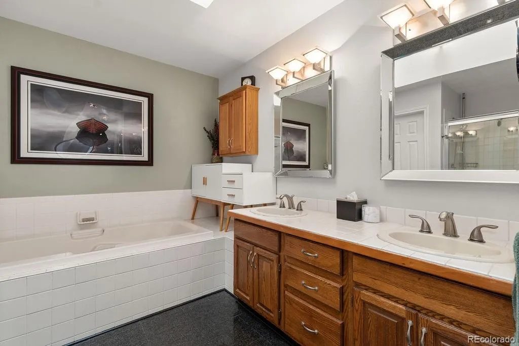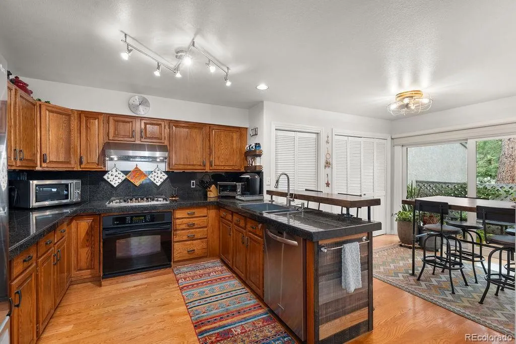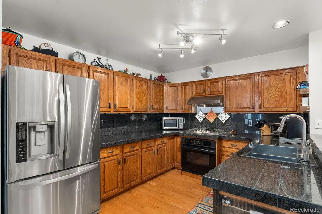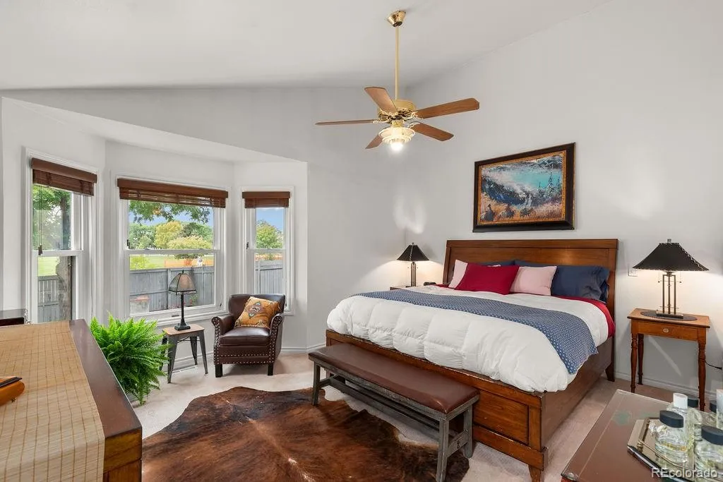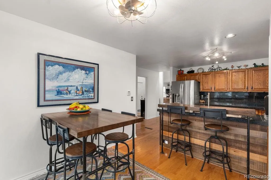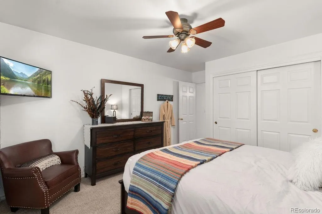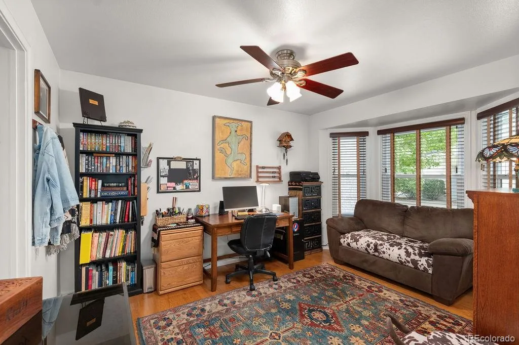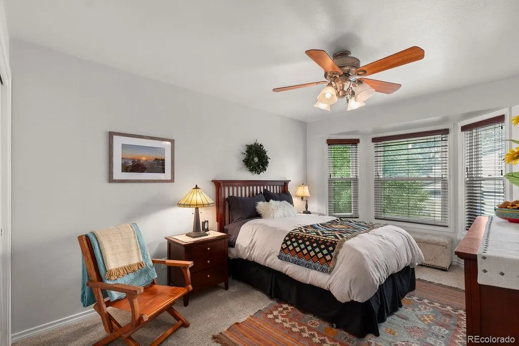 Step inside to find a warm and inviting main level where the living and dining areas are highlighted by red oak hardwood floors and a kitchen with walnut cabinetry and granite countertops. Just off this space, a versatile flex room offers the perfect option for a formal dining room or a comfortable home office. Large windows and a backyard patio overlook Chennai Park, where you’ll enjoy some of Denver’s most breathtaking mountain sunsets—a truly rare offering at this price point. The main floor also features a spacious primary suite with a five-piece bath and a generous walk-in closet, as well as a convenient half bath for guests and a wood burning fireplace.