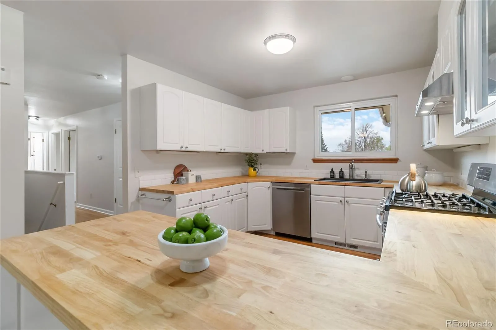 The main level features a spacious primary suite with a private ensuite bath, accompanied by two additional generously sized bedrooms, a stylishly renovated full bathroom, and a conveniently located laundry closet. The heart of the home boasts an updated kitchen with new butcher block countertops, sleek stainless steel appliances, and an open flow that connects to two large living areas—anchored by a cozy fireplace.