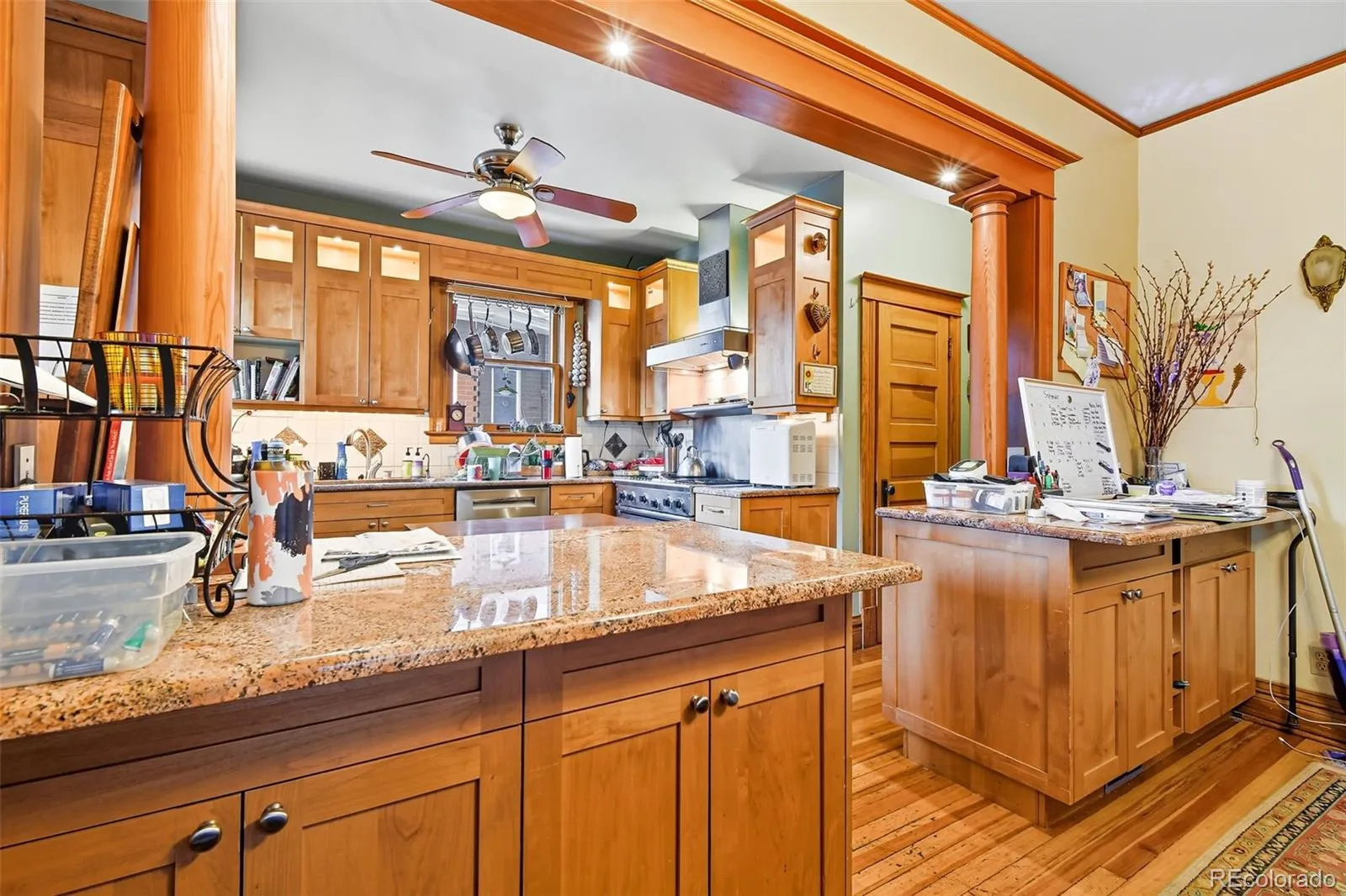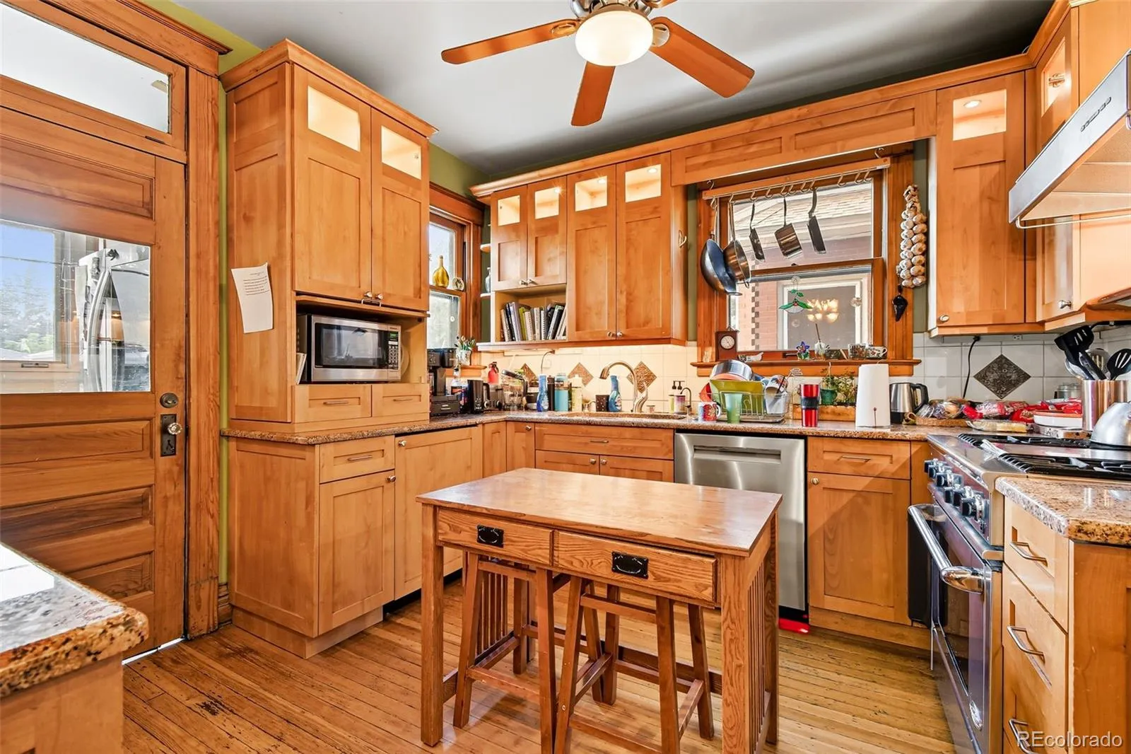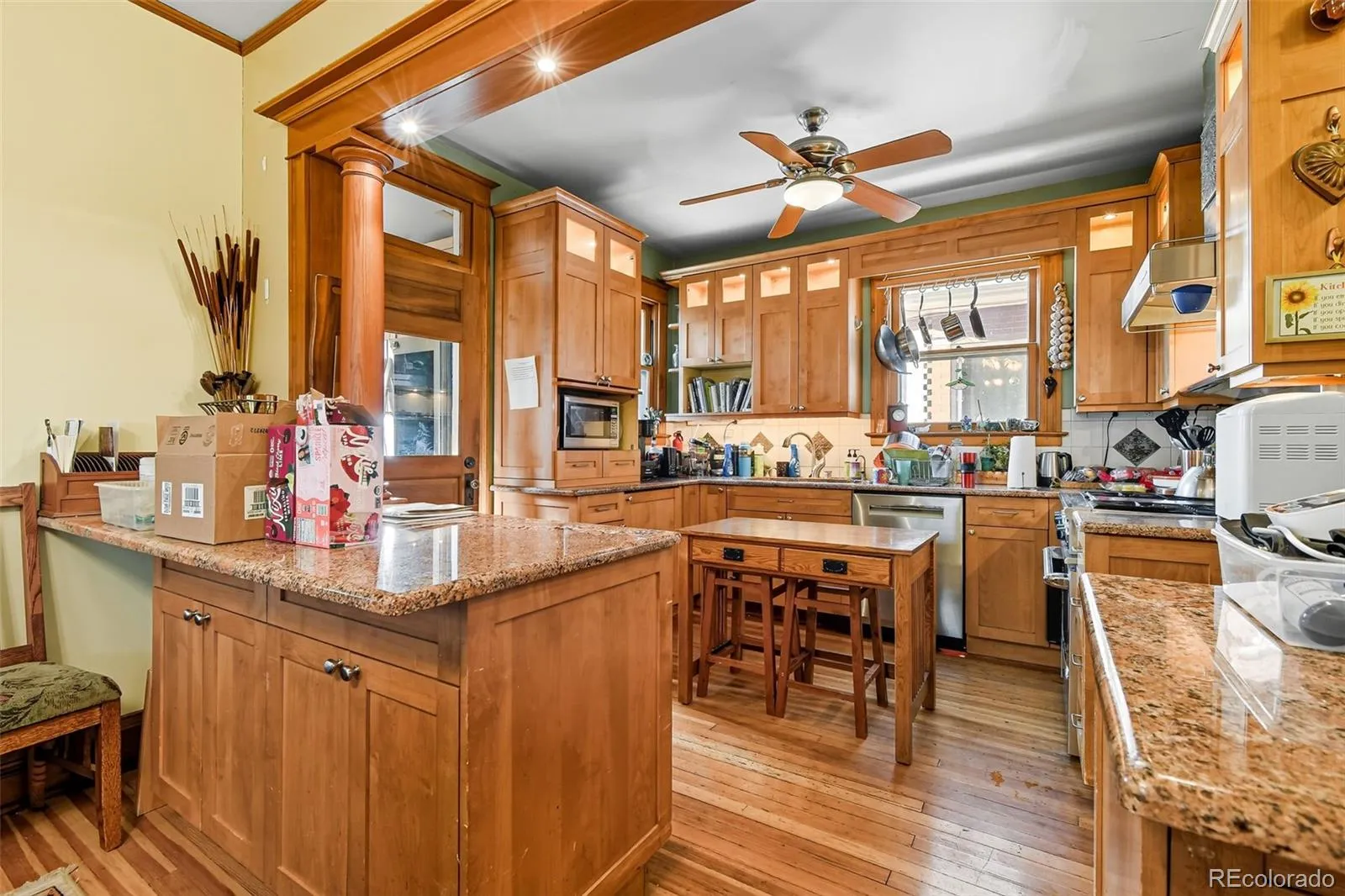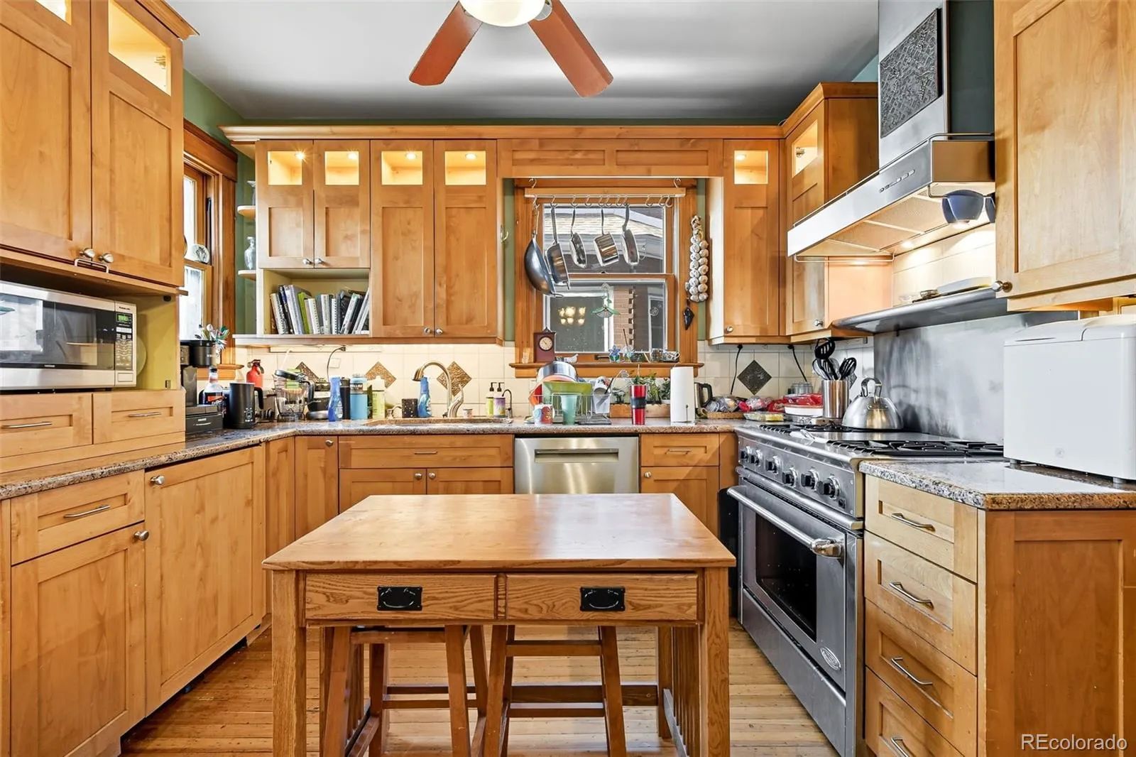The dining room continues the home’s historic character with original built-in cabinetry, offering both function and charm. Flowing into the kitchen, you’ll find thoughtful updates that preserve the home’s integrity while providing the convenience of a modern workspace. Designed for easy movement and everyday cooking, this refreshed kitchen ensures practicality without sacrificing style.
