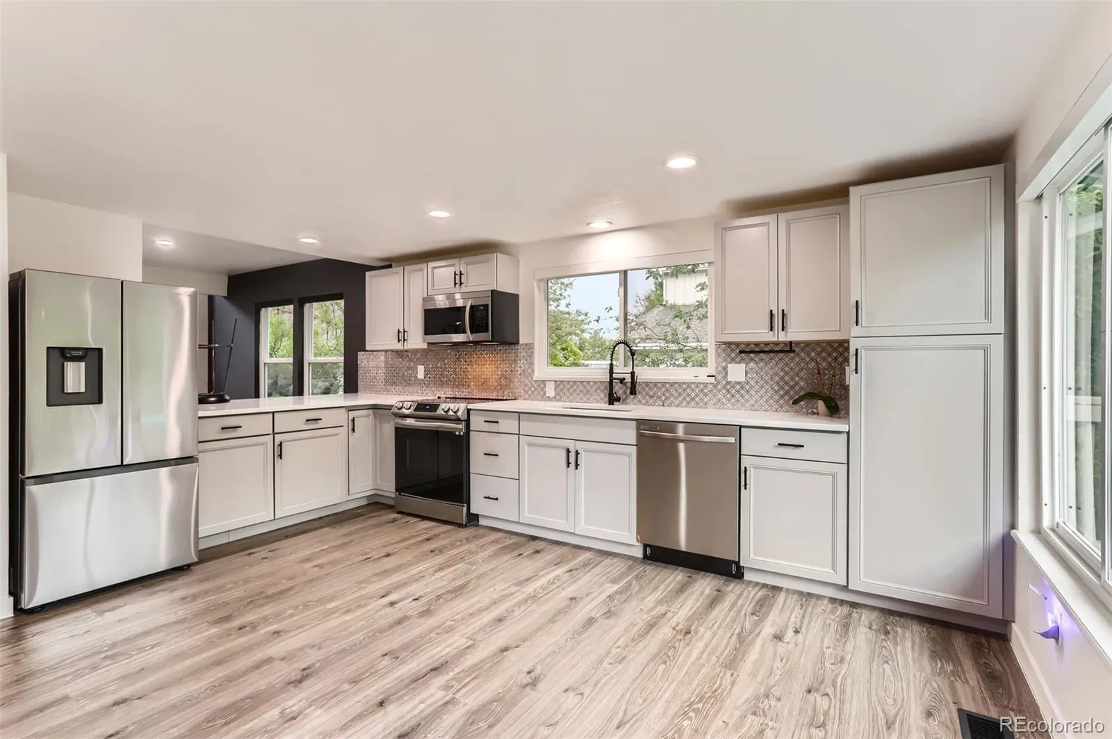 Rare Opportunity in Cherry Creek Farm… Fully Renovated Ranch with Walkout Basement on Open Space! Tucked away on a serene street in the sought-after Cherry Creek Farm community, this one-of-a-kind home backs to scenic greenbelt views and peaceful walking trails. From the moment you arrive, the curb appeal stands out with professionally designed front and back yard landscaping. Step inside and be welcomed by soaring ceilings, a skylight that invites in even more natural light, and expansive new windows that bring the outdoors in. Premium automated window treatments add modern convenience with a touch of luxury. The open-concept layout is ideal for both daily living and entertaining. Anchoring the main level is a striking marble fireplace in the spacious living area. The showstopping chef’s kitchen is loaded with upgrades like quartz countertops, custom backsplash, elegant cabinetry with designer hardware, an oversized island with bar seating, and a full suite of stainless appliances including a French door fridge. This home offers 5 generous bedrooms and 3 fully updated baths, with flexible spaces that suit any lifestyle, think home office, media room, gym, or guest suite. The primary retreat features a spa-inspired bath and custom walk-in closet. The finished walkout basement opens to a tranquil backyard haven that is ideal for gatherings, quiet mornings, or evening sunsets. Whether you’re enjoying the deck overlooking the greenbelt or shaded patio, this private lot makes every moment feel special. Just minutes to DTC, top-tier dining and retail, and located within the award-winning Cherry Creek School District. This quiet street is walking distance to Cherry Creek Academy (less than a block.) High Plains Elementary is only .7 miles, less if walking, and Cherry Creek High School. Truly move-in ready, this home is packed with thoughtful upgrades throughout.