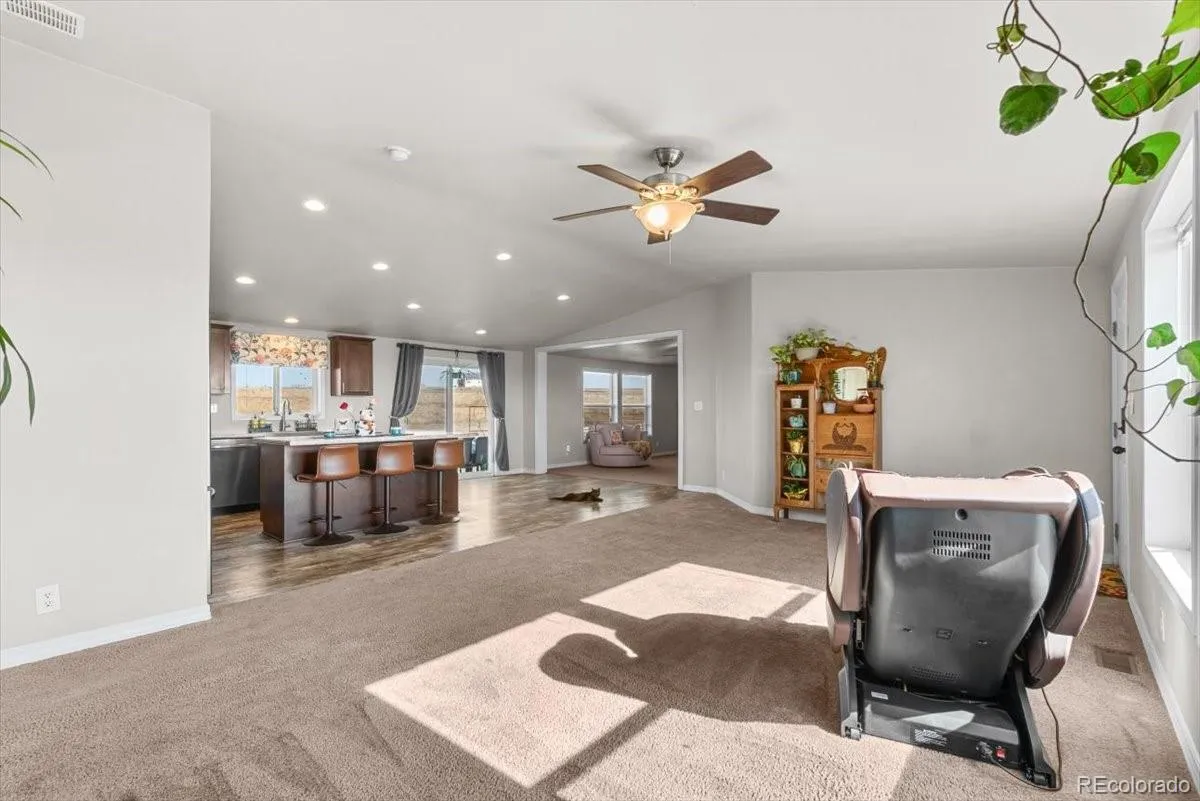 Welcome to your private retreat! This spacious 4-bedroom, 2-bathroom home sits on 20 acres in unincorporated Weld County, offering peace and privacy with no close neighbors. The wide-open lot provides endless possibilities and stunning views, including the unique sight of buffalo grazing in the neighboring field behind the home. Inside, you’ll find a bright, open floor plan featuring a large kitchen with a center island and a walk-in pantry, perfect for cooking and entertaining. The master suite is privately located on one side of the home and boasts high ceilings, a walk-in closet, and a luxurious master bath with a separate shower and soaking tub—where you can unwind while watching the buffalo roam. The opposite side of the home includes three additional bedrooms that can easily serve as guest rooms, offices, or hobby spaces. A huge living room provides plenty of space for gatherings, while the oversized dining room is large enough to double as a second living area.