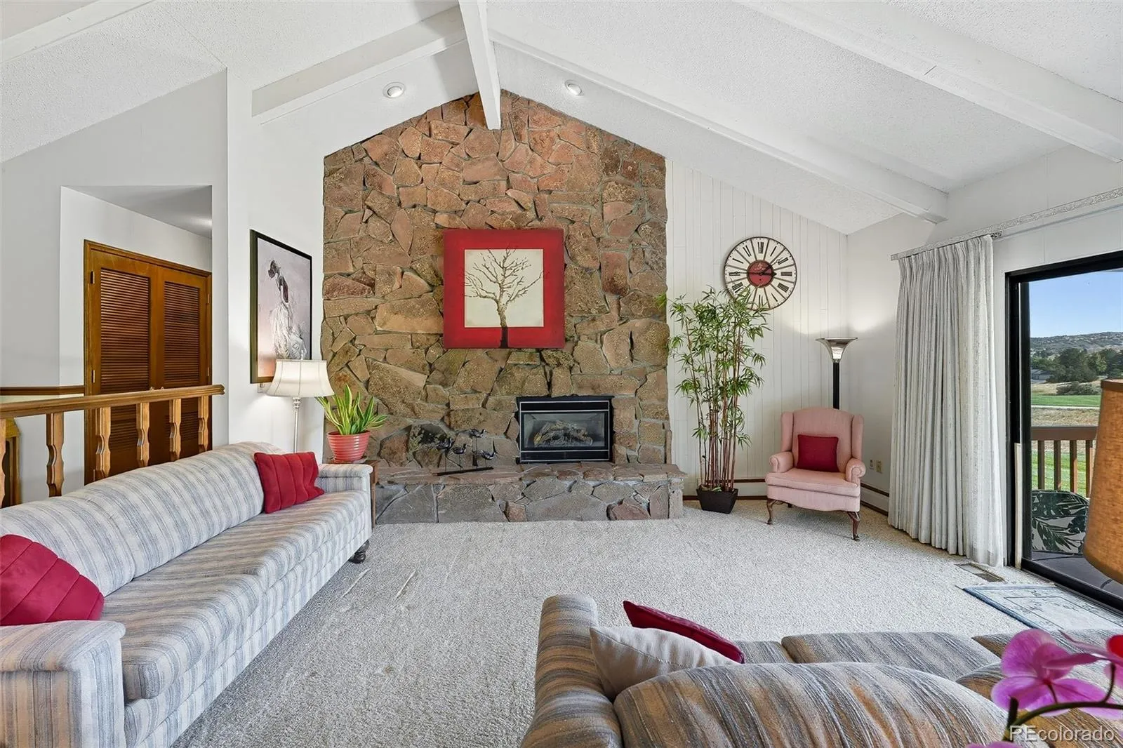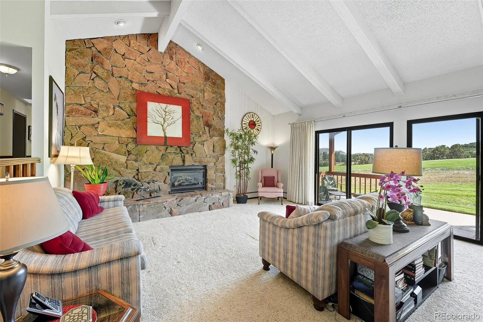 The sunny kitchen offers a granite island, eat-in dining space, and a walkout to the covered back patio. Adjacent to the kitchen is a convenient laundry room, while the formal dining room showcases foothills views. Step to the inviting living room with a gas rock fireplace , vaulted ceilings, and dual sliding glass doors opening to a spacious covered patio overlooking the golf course.