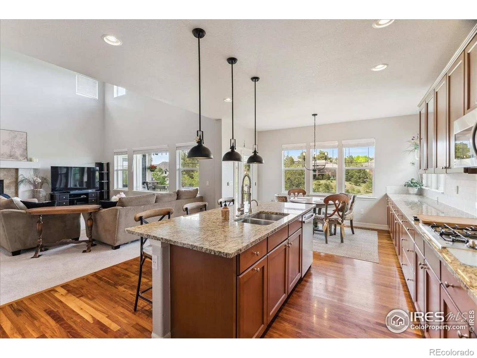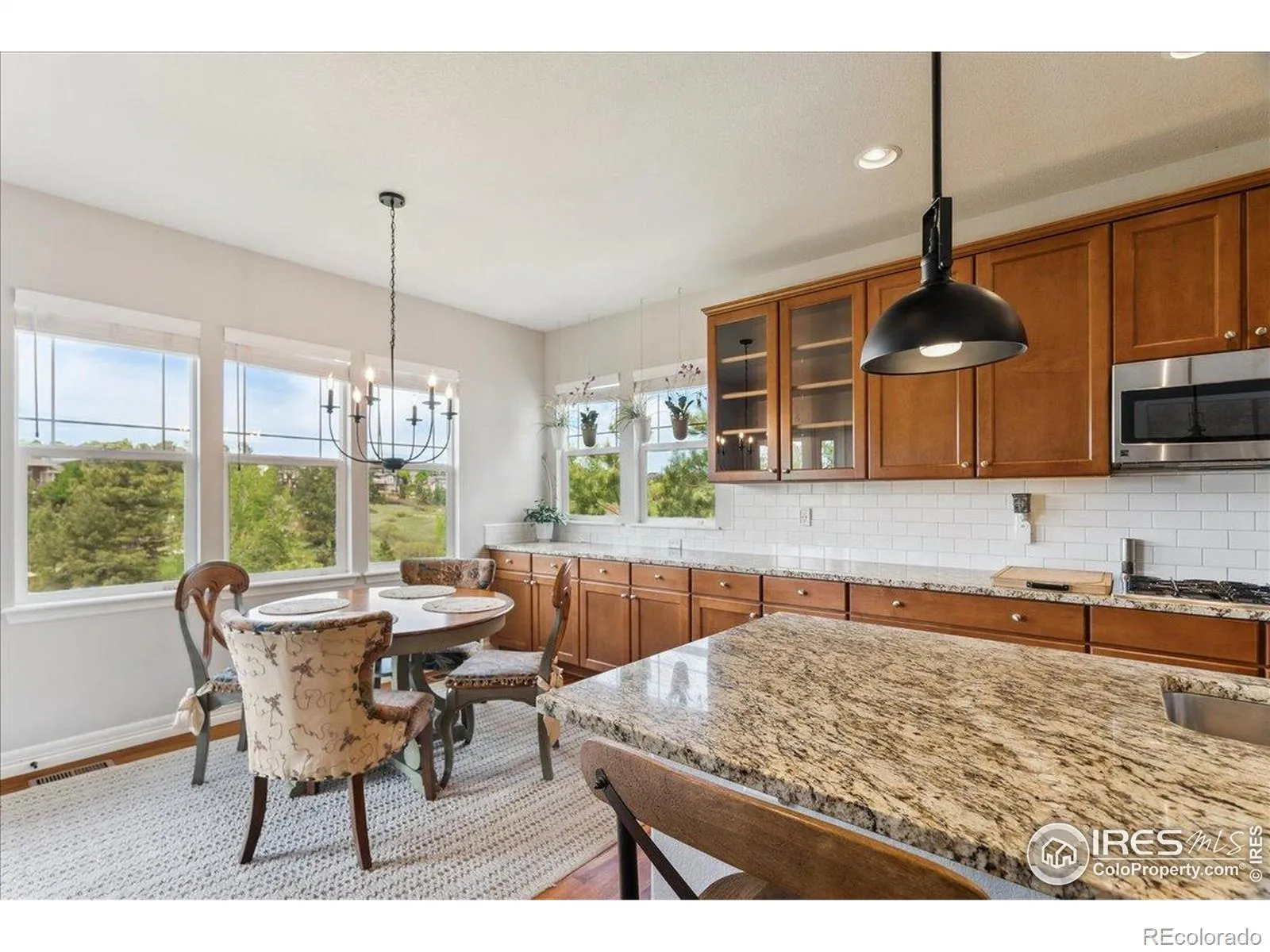 Preinspected and home warranty included! Welcome to this stunning home backing to open space with breathtaking views! Enjoy outdoor living with a gas fire pit, gas line for grilling, and a covered deck with ceiling fan. Inside, the updated kitchen features subway tile and stylish fixtures. The walkout basement is prepped for a wet bar and includes a pool table and dart board. New water heater, newer roof and exterior paint (2019), and a heated 3-car tandem garage. Nearby Red-Tailed Hawk Park is being updated. Quick access to E-470!