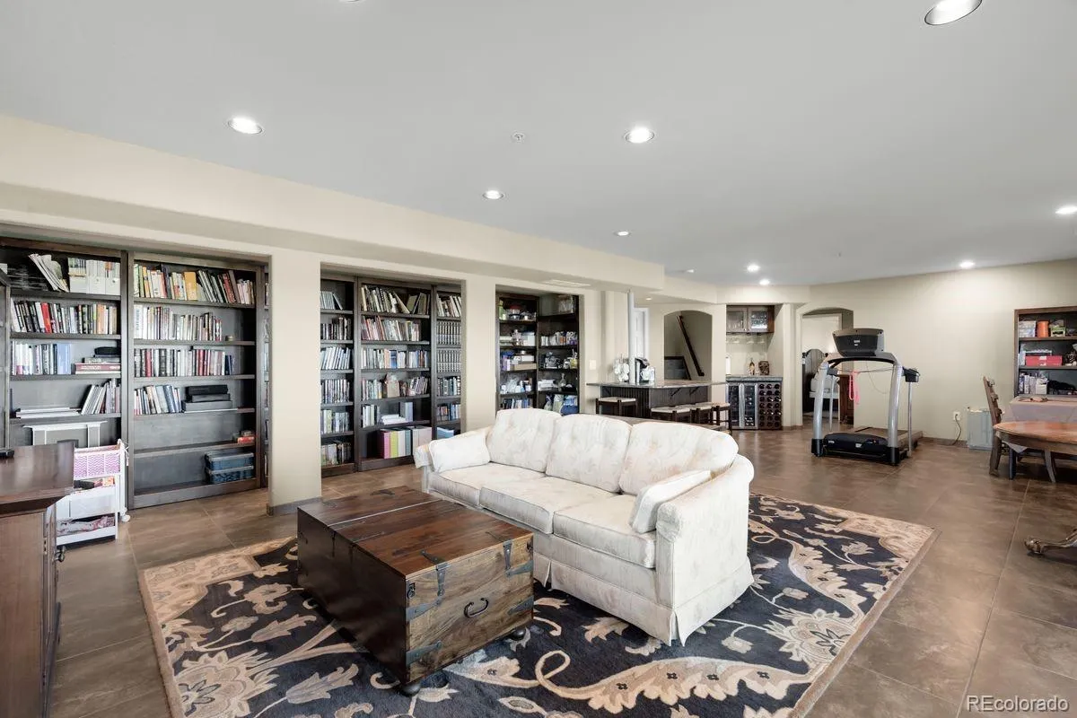 The finished basement extends the home’s living space, complete with a gas fireplace, French doors to the patio, and an elegant bar with sink and dual beverage drawers. A bedroom with walk-in closet frames views of Denver, complemented by a full bath with walk-in shower.