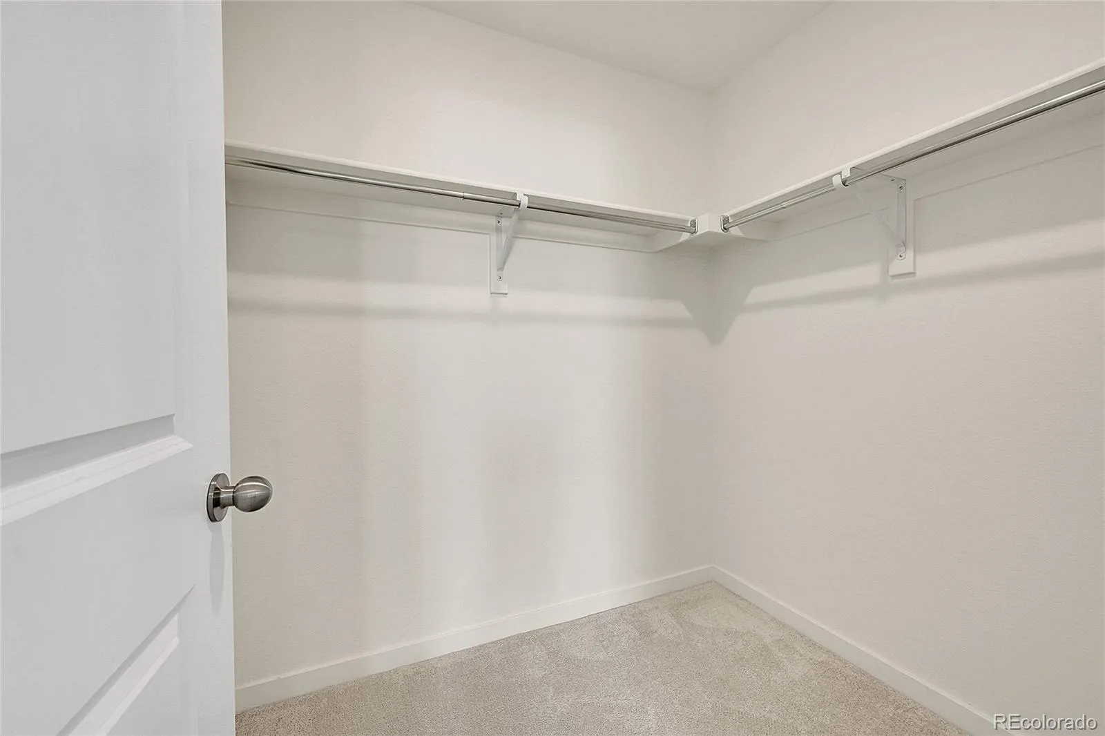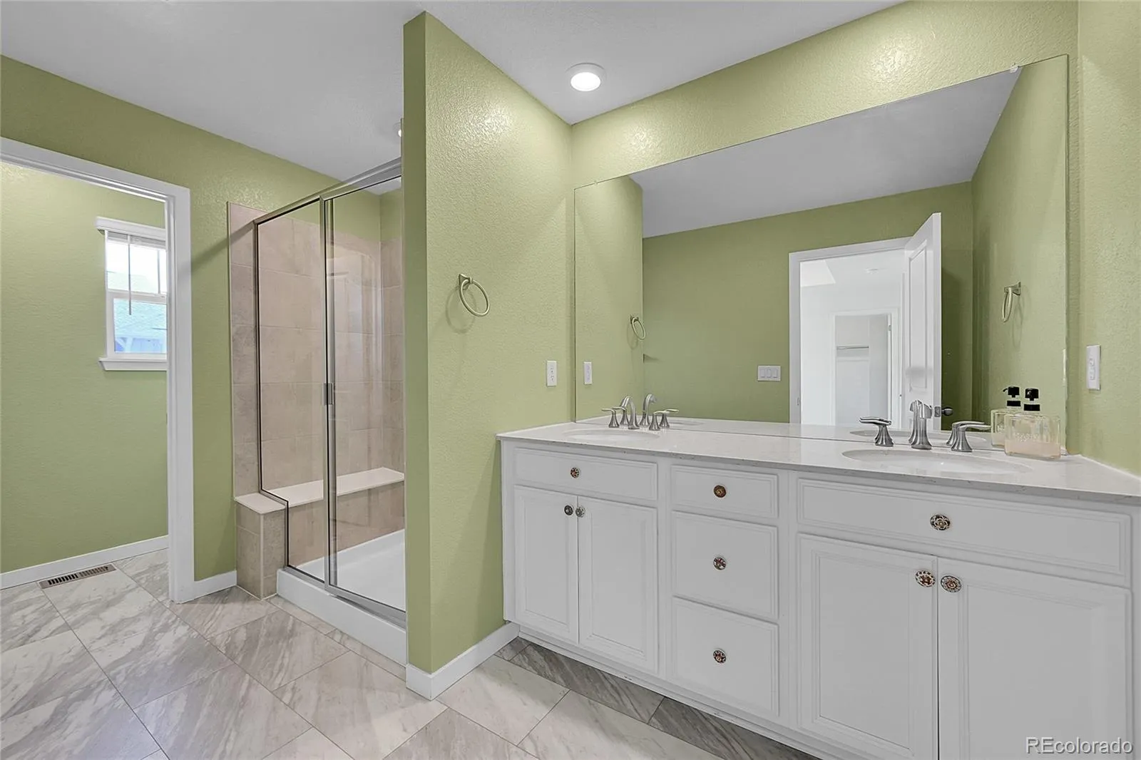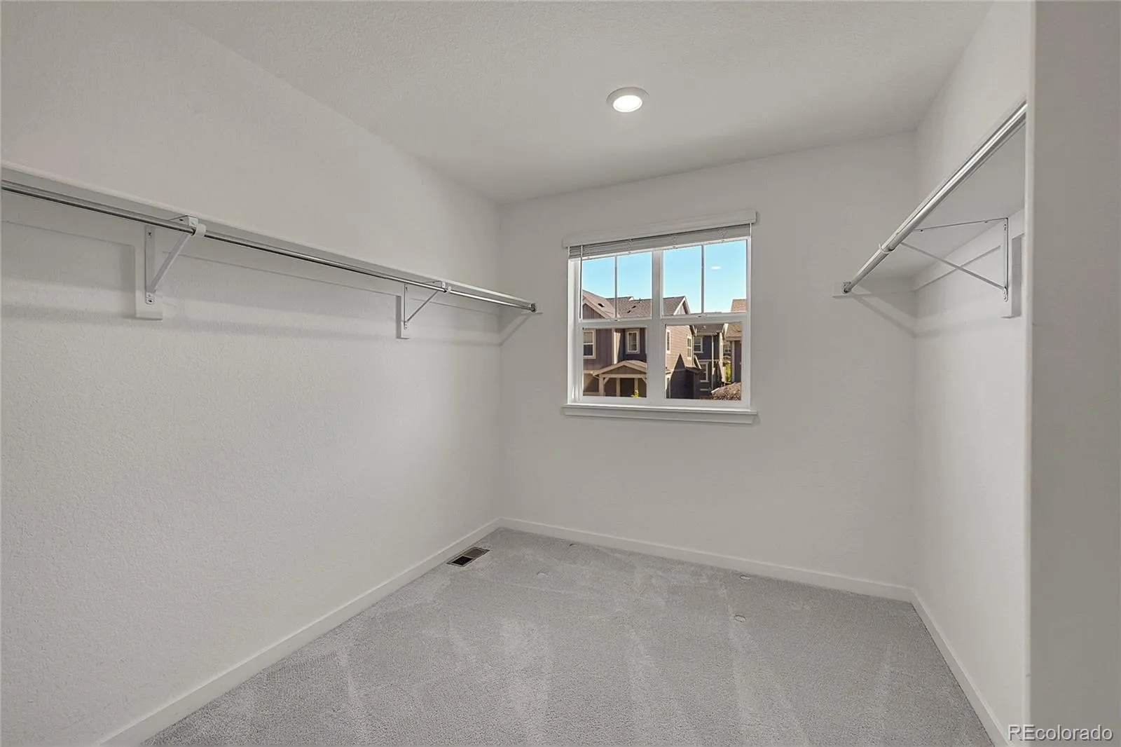 Upstairs, the primary suite is a private retreat with a tray ceiling, smart lighting, ceiling fan, and a huge walk-in closet. The en-suite bath is spa-inspired with dual granite vanities and a tiled shower with built-in seating. Two additional bedrooms, each with walk-in closets and ceiling fans, share a full bath, and the laundry is conveniently nearby.
