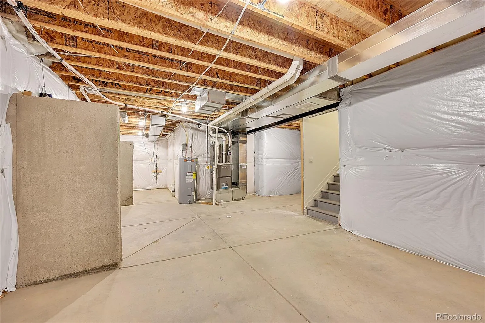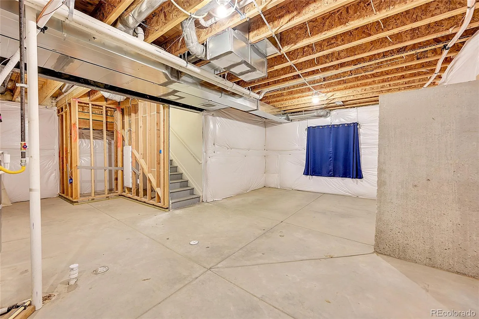 The unfinished basement, with two egress windows, offers endless possibilities for a rec room, office, or gym. Outdoor living shines with a covered Trex deck with shades, sprinklers, grass, and serene greenbelt views.
