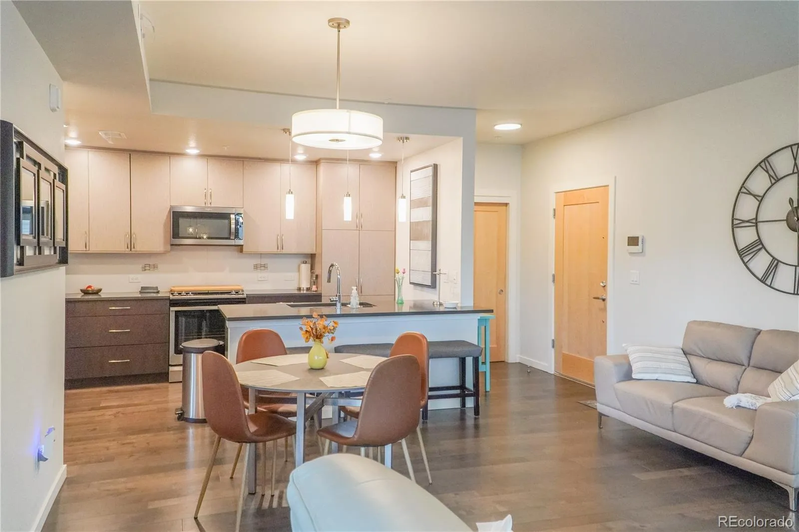 Don’t miss this opportunity for modern, hassle-free living in a prime location! Welcome home, where modern design meets effortless living. This unit offers you lock ‘n leave convenience, cost-saving energy features and minimal maintenance requirements. The building is equipped with an elevator and a secured front entry for added protection and peace of mind. This is a beautifully crafted 2-bedroom, 2-bathroom single level condo. Featuring 1,121 sq. ft. of stylish, low-maintenance comfort. This unit was completed in 2020. It is a fantastic first-floor unit and boasts high ceilings, oversized windows, and an open-concept layout that fills the space with natural light. You’ll feel at home immediately upon walking in. There is luxury vinyl flooring, quartz countertops, and stainless steel appliances- including a gas stove. The professionally installed window treatments are top-down, bottom-up and provide both elegance and privacy.