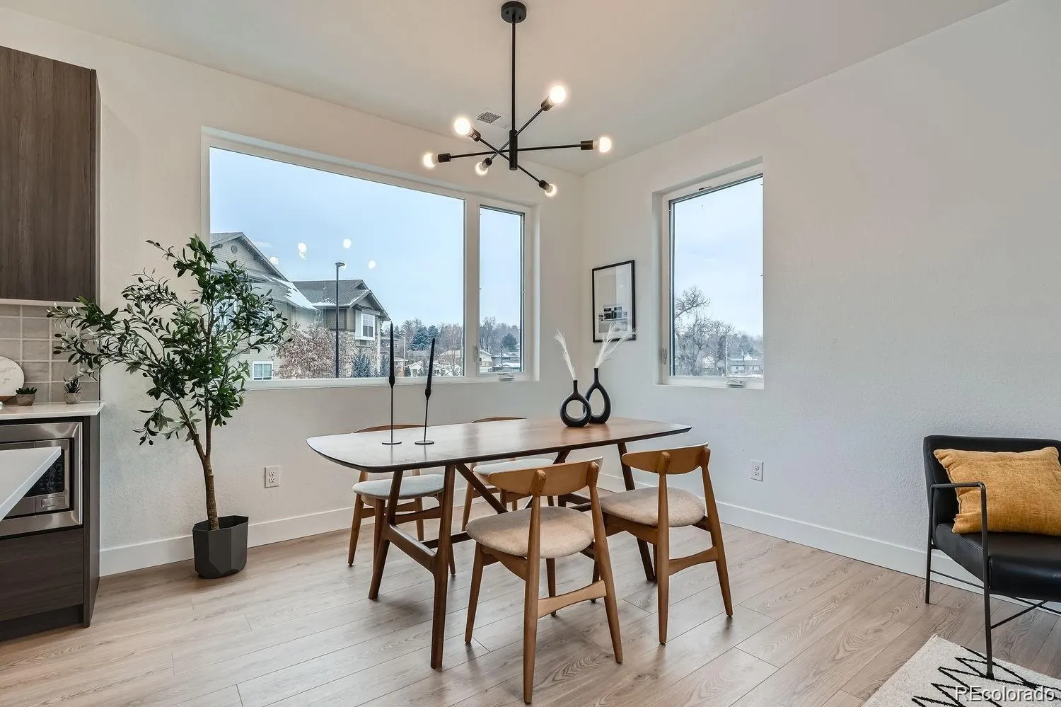 Design Your Own Deal – Use up to $50,000* in incentives in a variety of ways! LIMITED TIME – go under contract by 10/5. Experience sophisticated modern living in this new community, presenting a community of duplexes meticulously designed with curated finishes and housed in a prime location. Only five units left! With three levels and a rooftop deck, these homes elevate your lifestyle and enjoyment. Each duplex side offers a mirror layout and distinct color schemes. As you enter, you’re greeted by an inviting entryway featuring a multi-level atrium and expansive windows that flood the space with natural light. The bonus flex room and convenient powder bath offer versatile space, perfect for an office, gym, or cozy retreat. The second level’s open floor plan seamlessly merges the kitchen, living room, and dining area, fostering effortless entertaining or relaxation. The kitchen is complete with an eat-in island and modern appliances, A powder room adds convenience to your daily routine. Thoughtfully located on this level, the sizable primary retreat with ensuite offers a double vanity, large shower, and private water closet for added luxury. Venture to the third level, where two additional bedrooms await, along with a full bathroom, and washer/dryer closet with hookups. A wet bar, accented by a large window, leads to the expansive rooftop deck, where you will create unforgettable memories under the open sky. For extended outdoor enjoyment, the home offers a low maintenance private backyard space with astroturf, covered patio, and fencing. An oversized one-car garage and driveway offer extra storage space and parking.. Conveniently located for a short commute to downtown Denver and easy access to mountains, trails, parks, and nearby resources. Make one of these your new home. All are available now. Take a look at the additional homes with different finishes – listing #5739371 & #7484657. *Varies per qualified buyer w/ our Preferred Lender.