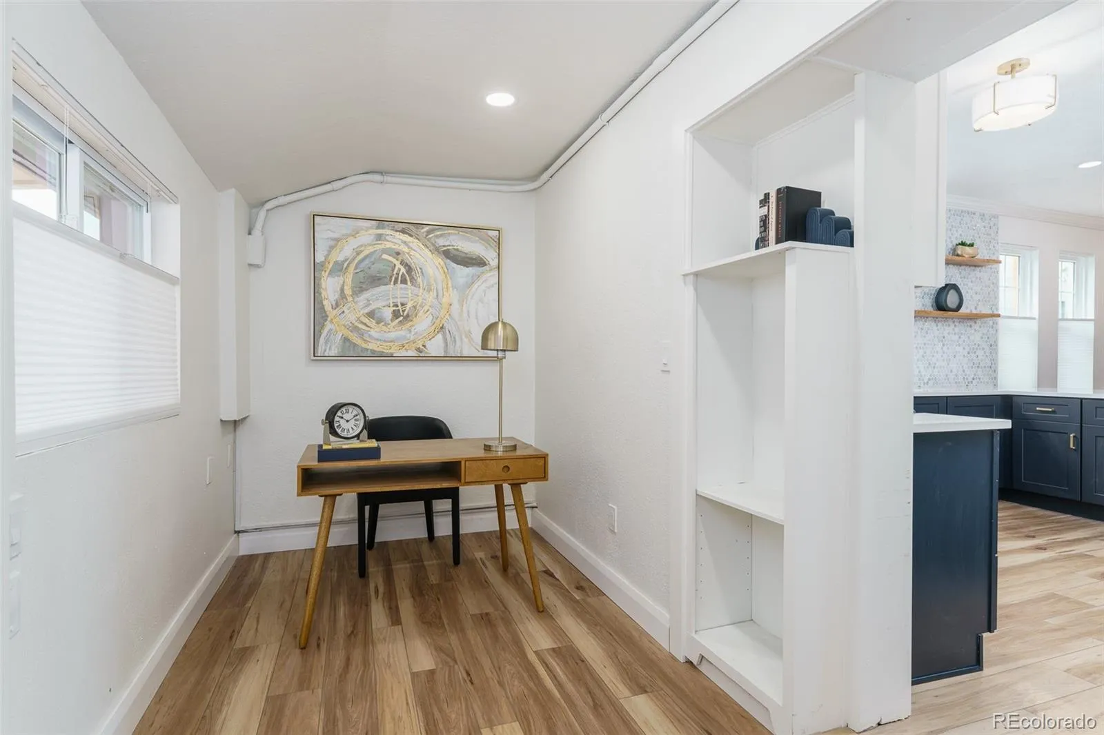 Step inside to a bright, open floorplan where a chef-inspired kitchen anchors the home—complete with custom cabinetry, white-and-gold appliances, and sleek countertops. Both full bathrooms have been thoughtfully redesigned with premium tile and fixtures. Bedrooms are spacious and comfortable, while the private office provides flexibility for work or hobbies.