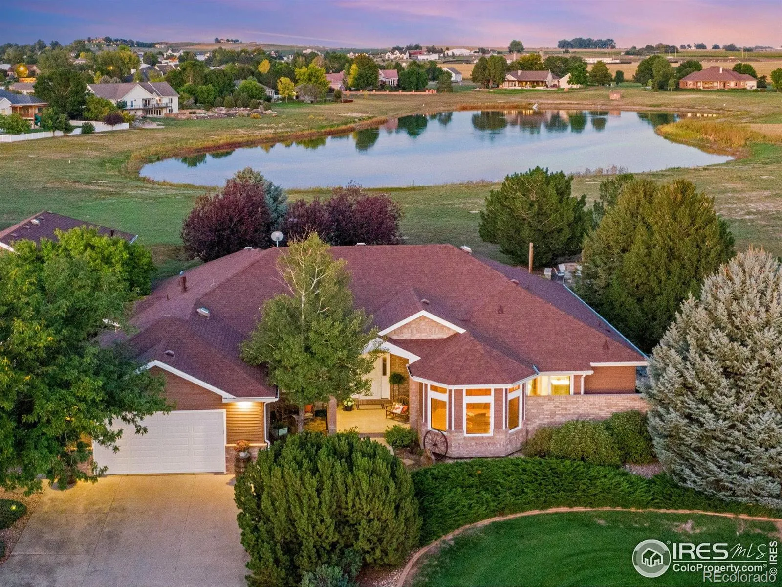 Pre-Inspected with 1 Year Gold Plan Blue Ribbon Home Warranty. This sprawling ranch sits on a 2.53-acre lot and features nearly 6,000 total square feet with 5,829 finished. The property includes an oversized 628 sq. ft. attached garage plus a 1,560 sq. ft. detached RV/Boat/Toy garage/shop. Incredible finishes inside and out. The main level offers a spacious foyer, formal dining, formal living, laundry room, great room with gas fireplace, three guest bedrooms (one easily used as an executive office), and a primary suite with retreat, walk-in closet, and five-piece bath. The kitchen boasts cityscape cabinets, granite slab countertops, a large center island, pantry, and stainless-steel appliances. The professionally finished basement includes three recreation spaces, a family room with a second gas fireplace, a flex room, and two additional bedrooms. Two high-efficiency furnaces, two water heaters, two AC units, and many more upgrades throughout, including hardwood floors, vaulted ceilings, iron railing, tile, six-panel doors, and a premium lighting package. The exterior features mature landscaping, a front courtyard, and a large covered backyard patio with beautiful lake views, sprinkler/drip system, room for gardens, outdoor bar and water feature. The west-facing front provides plenty of natural sunlight and snow melt for the driveway, plus stunning nightly sunsets, while the east-facing back offers cool summer shade, lake views, and breathtaking sunrises. Call today for a detailed list of features, a floor plan, or to schedule a private showing.