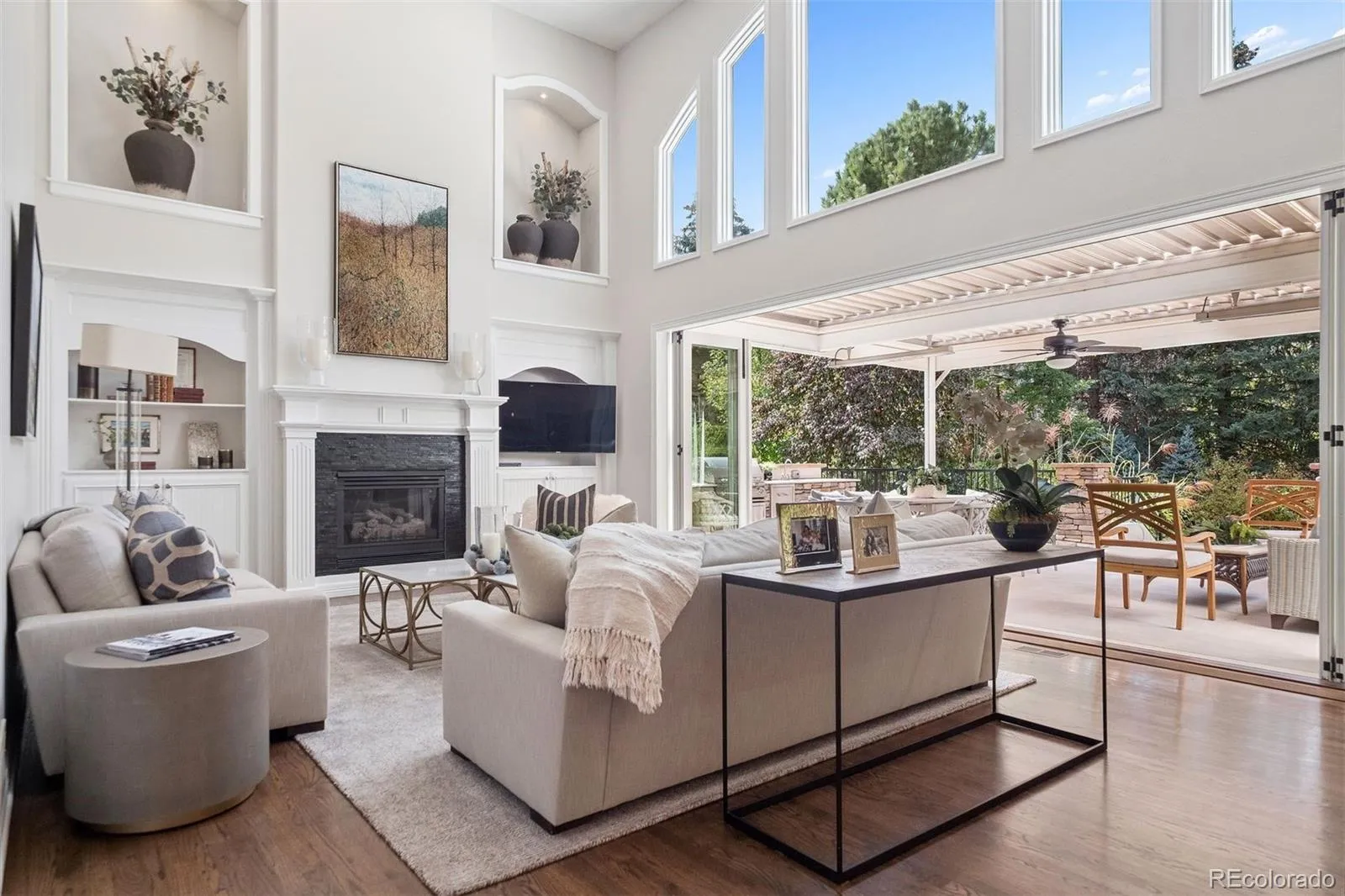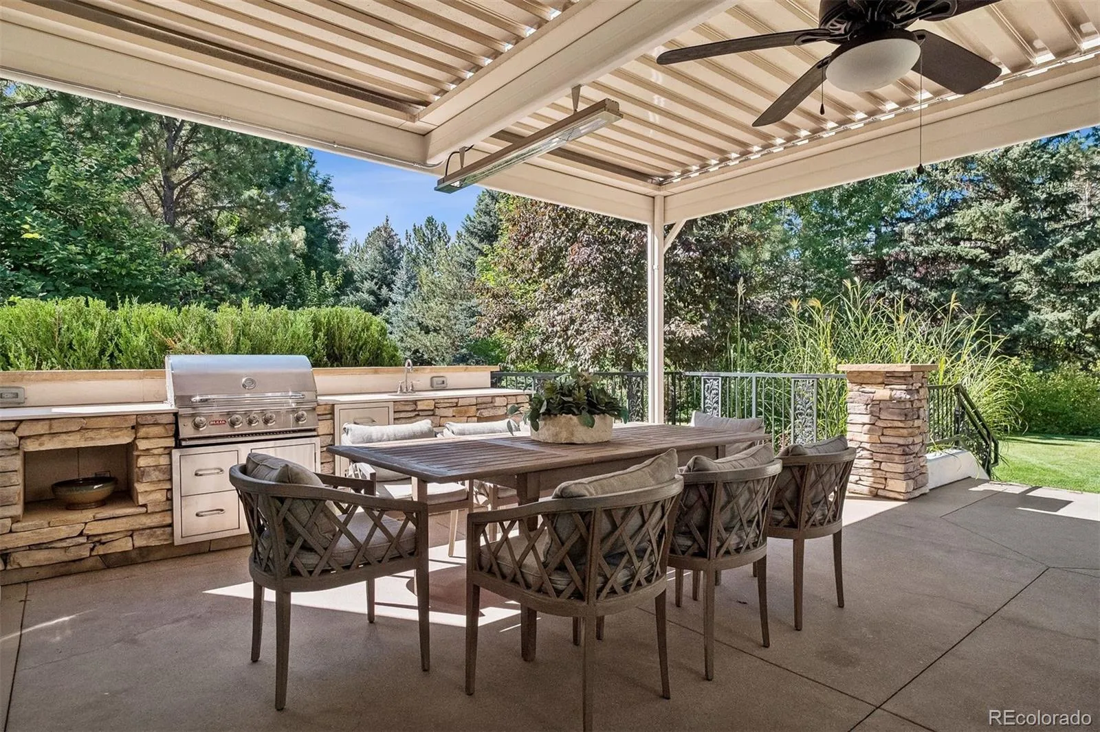Outdoor living is reimagined with a louvered covered patio featuring infrared heaters, making it ideal for year-round enjoyment. New gutters complete the attention to detail throughout this meticulously maintained property.