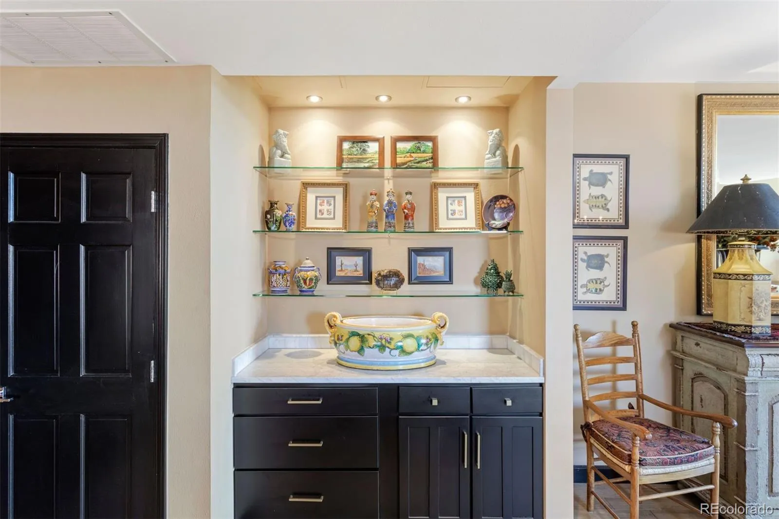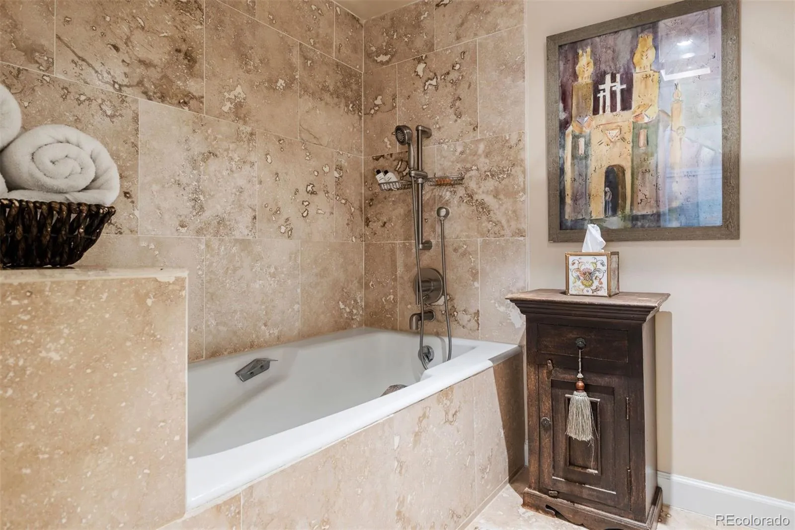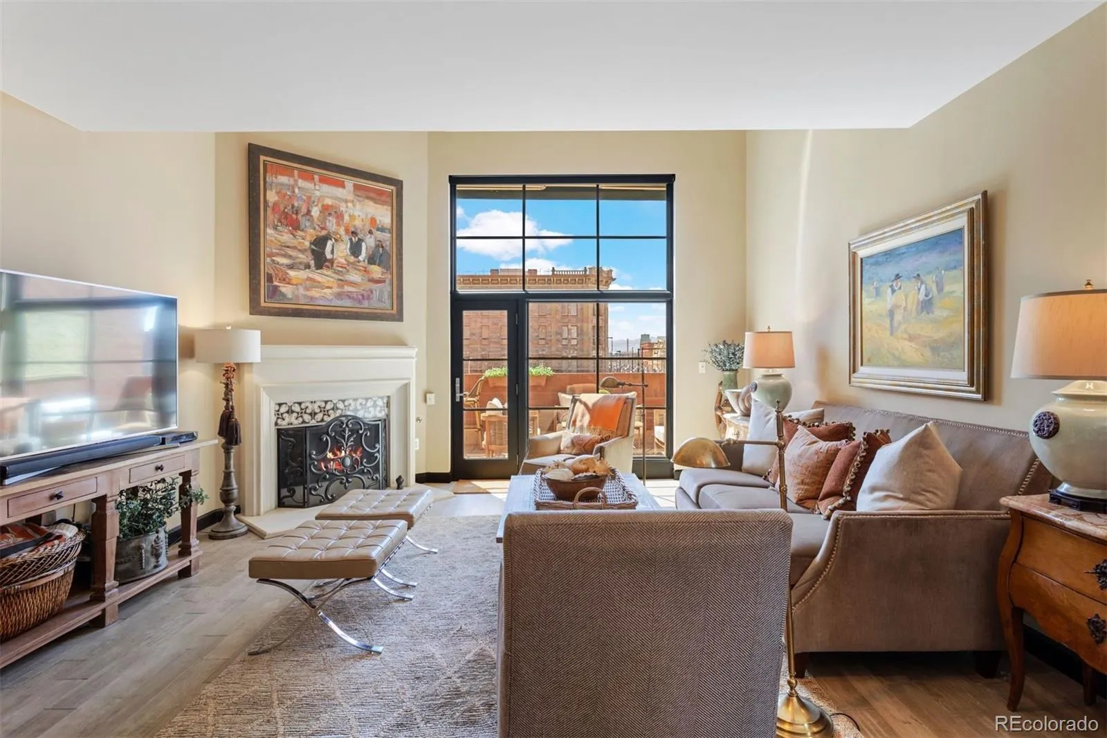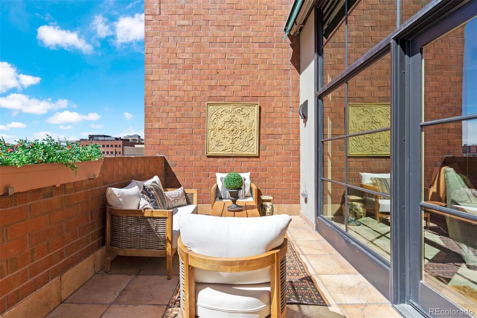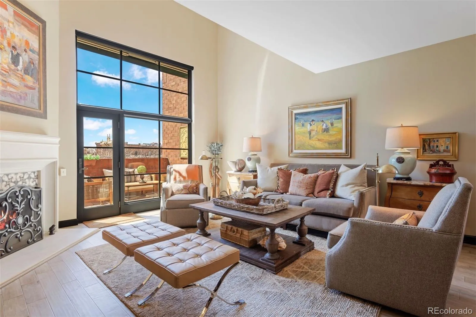 This rare 3-bedroom, 3-bath townhome at Writer Square offers 1,790 sq. ft. of stylish living space with a private terrace, two parking spaces, and three storage units, an unbeatable value in Lower Downtown Denver. Positioned on the coveted southwest corner, this end-unit showcases unobstructed views of Larimer Square with the mountains as your backdrop. It’s a true city oasis, surrounded by landscaped courtyards, mature trees, and colorful flowerbeds, all just steps from Denver’s premier dining, entertainment, and cultural destinations. Inside, the living room makes a dramatic statement with a newer 10′ x 8′ Anderson picture window, a custom stone fireplace, and matching stone window sills. The chef’s kitchen features Carrera marble counters and backsplash, a custom butcher block island, farmhouse sink, Wolf dual-fuel gas range, GE Monogram refrigerator and dishwasher, and a built-in Miele coffee maker. A thoughtful floor plan includes a flexible main-floor bedroom with an updated stationary glass wall and door, as well as a half bath with existing tub/shower plumbing behind the drywall for easy conversion back to a full bath. Custom cast-iron stair railings, plantation shutters, and hardwood floors add timeless character throughout. The primary suite offers soaring 18-foot ceilings, abundant natural light, motorized blinds, a supplementary mini-split air conditioner, generous closet space, and a beautifully updated bath with marble and travertine finishes. A full laundry room with additional storage provides convenience, while recent upgrades such as a newer heat pump and water heater bring peace of mind.